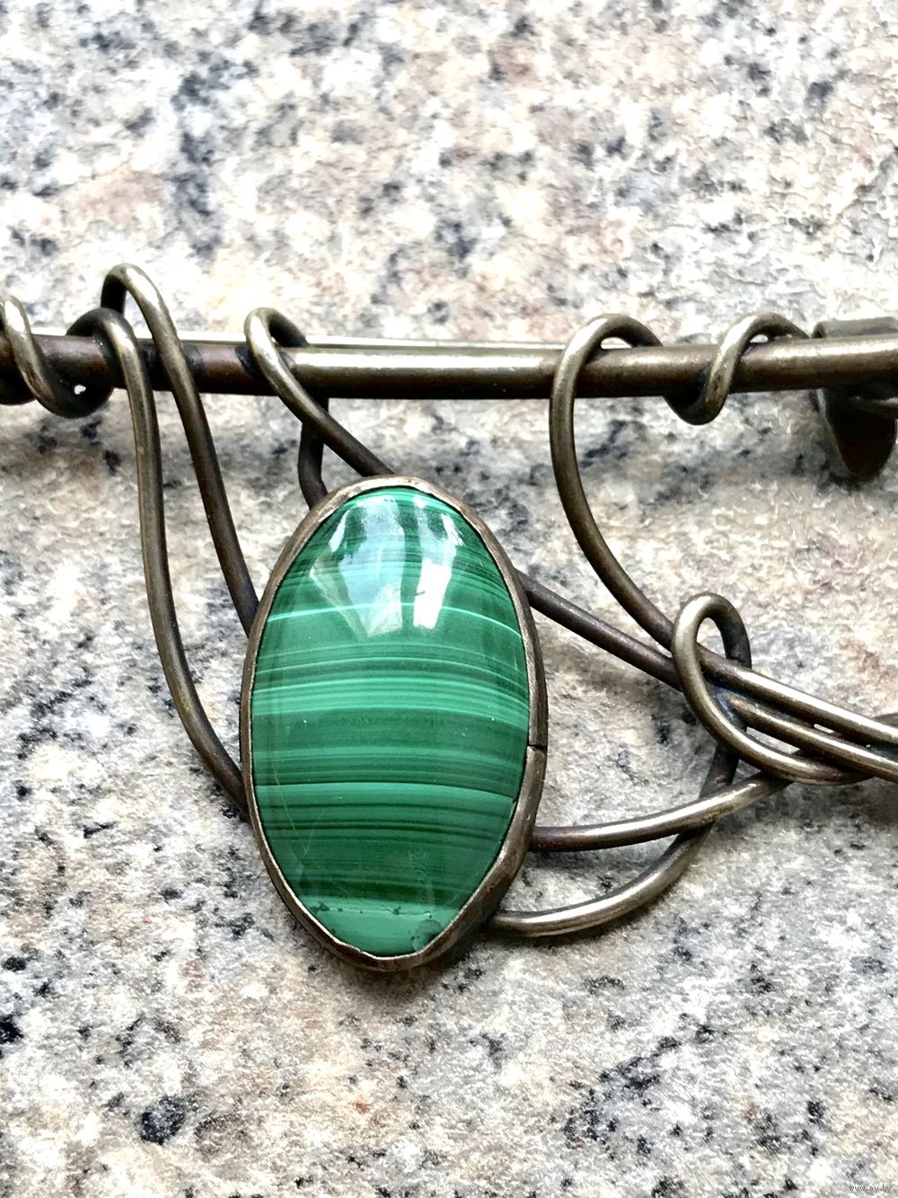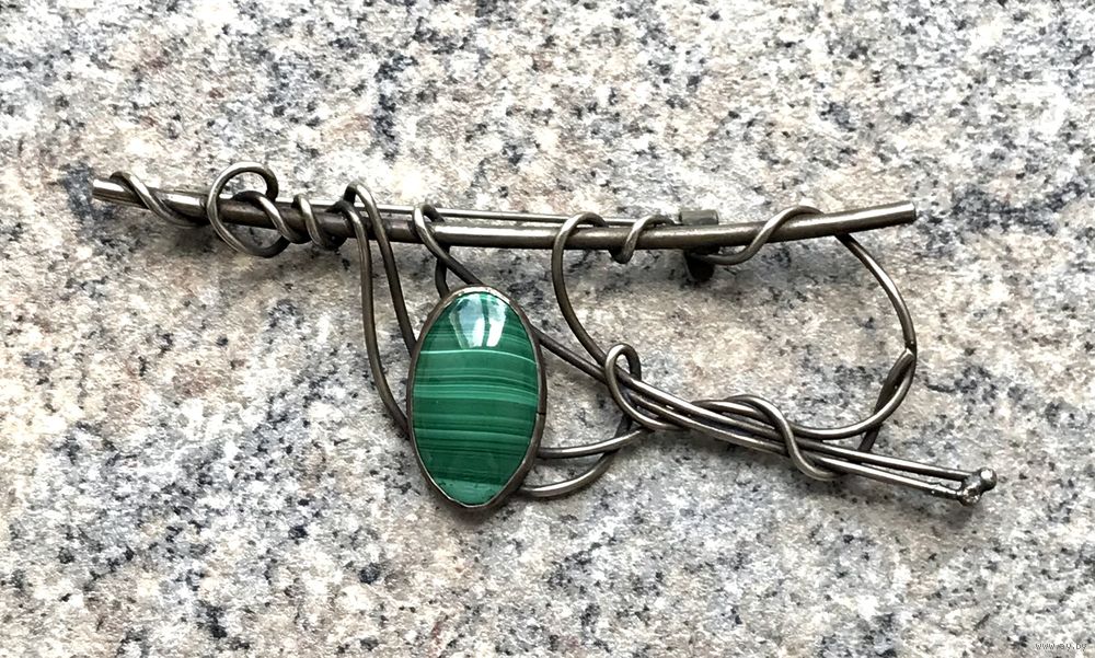 Винтажная, крупная (я бы даже сказала огромная, вес больше 20гр.) брошь с основой из мельхиора, ручная работа. Вставка из художественного стекла (есть небольшой скол, не бросающийся в глаза). Высота броши 12 см., размер вставки 2,5х1,5см.