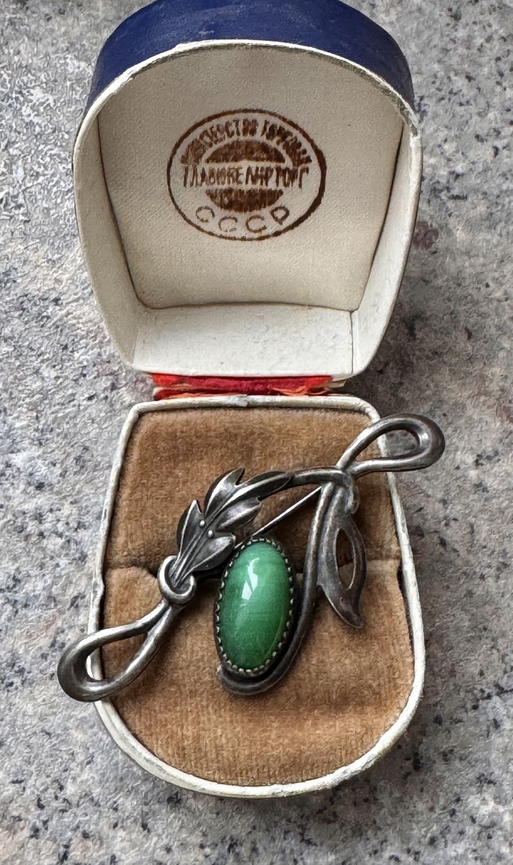 Винтажная брошь из мельхиора со вставкой из художественного стекла. Размер броши 5,6х2,5см. Состояние хорошее.