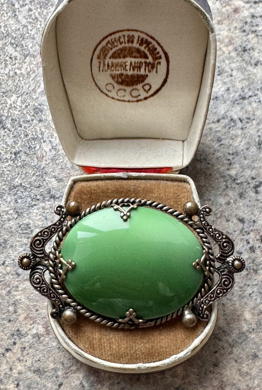 Винтажная брошь с основой из латуни, вставка из художественного стекла. Размер броши 5,5х3см., размер вставки 3,5х2,5см. Состояние хорошее.