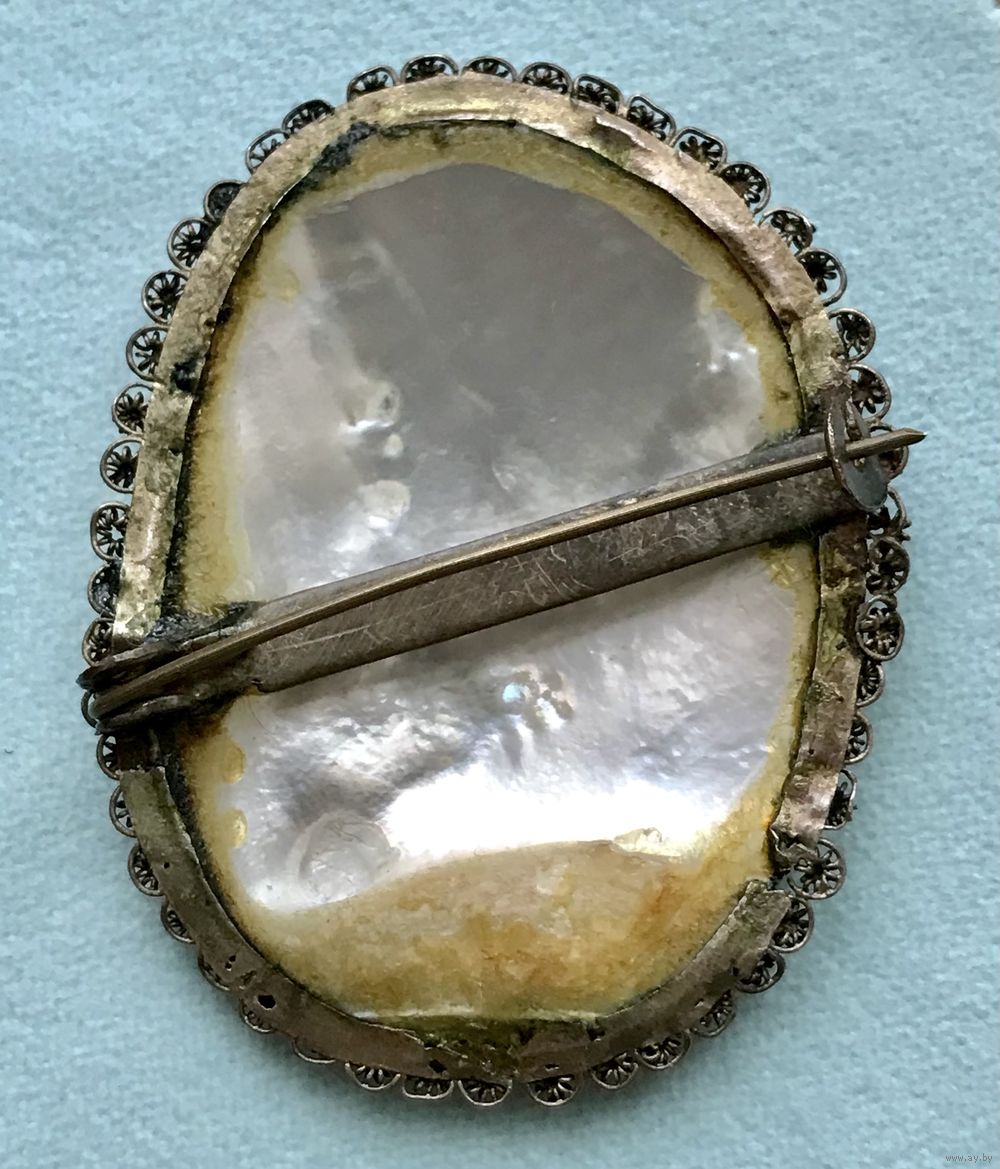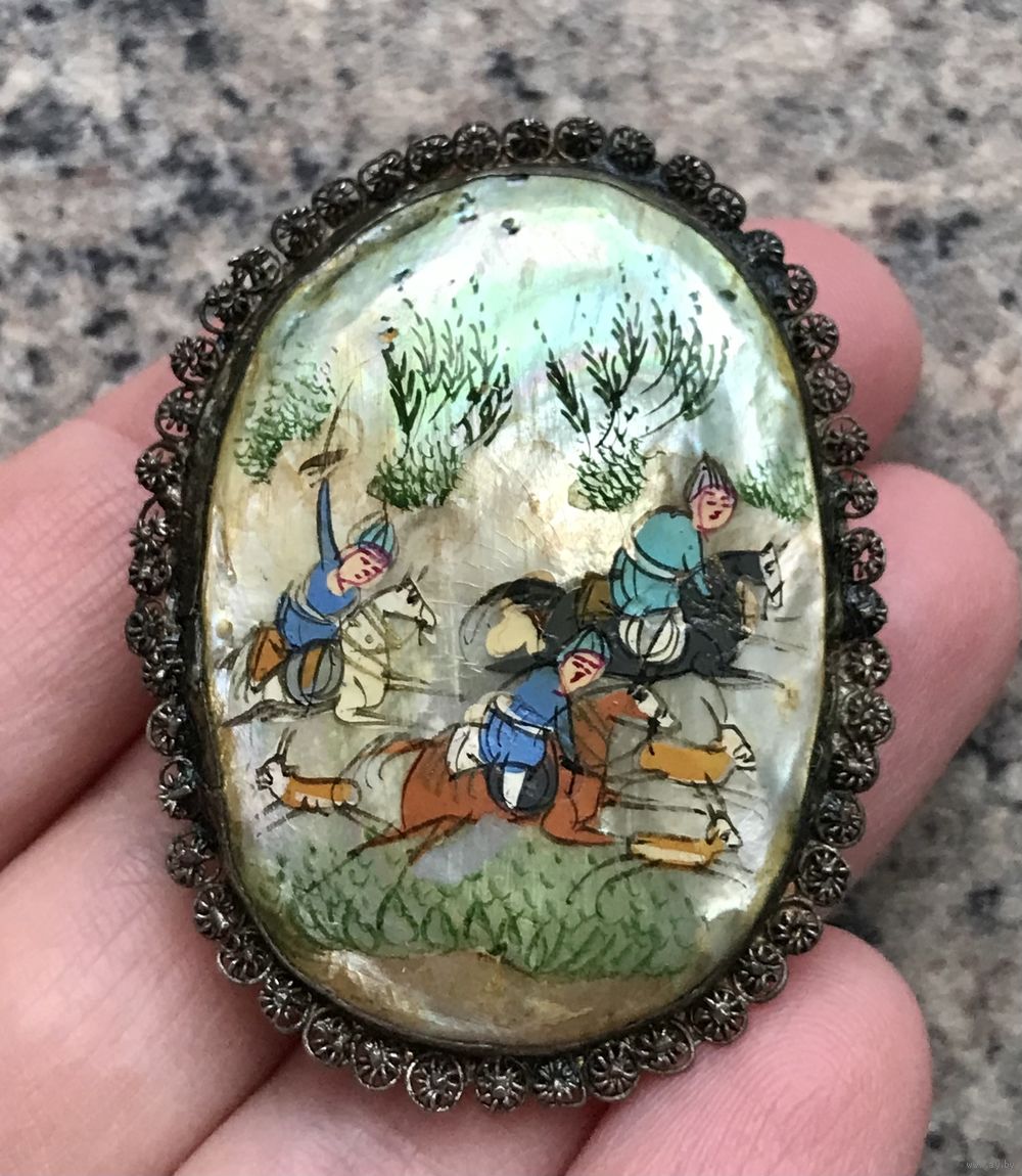 Антикварная брошь, первая половина ХХ в., Персия. Основа из металла серебристого тона (возможно серебро), вставка перламутр, ручная роспись. Застёжка с-формы из меди.Размер броши 5х3,5см., вставка 4х3см. Для своих лет состояние хорошее.