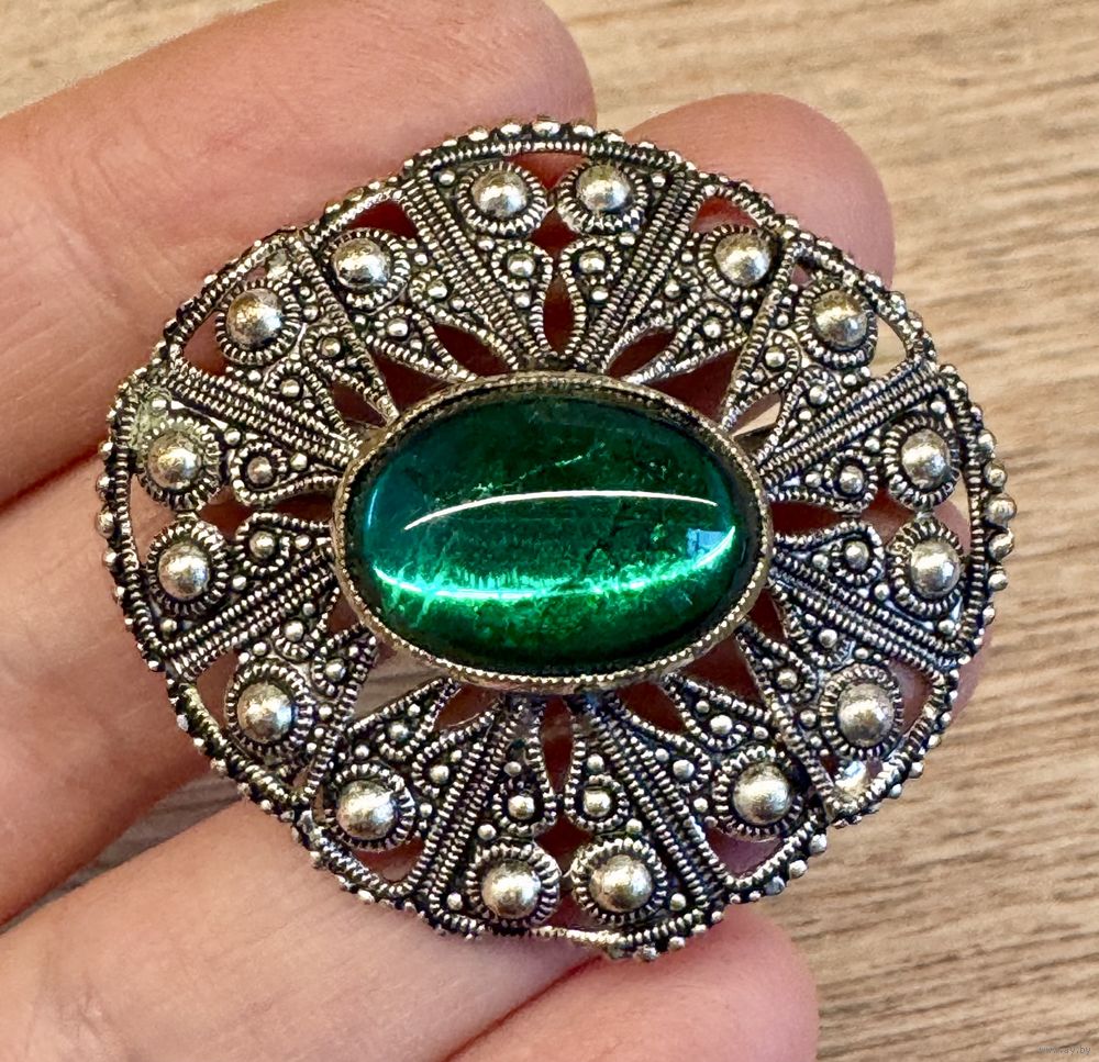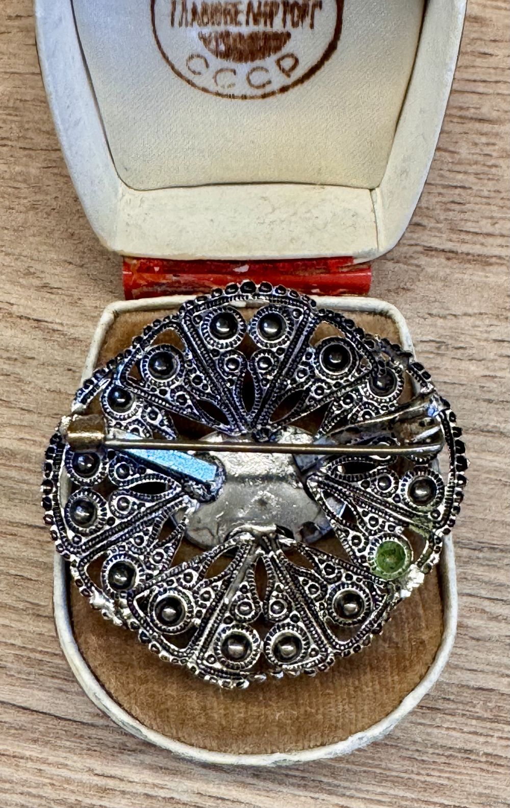 Винтажная брошь с основой из латуни с серебрением, вставка из стекла (на стекле имеются небольшие царапины). Размер броши 4х4см.