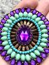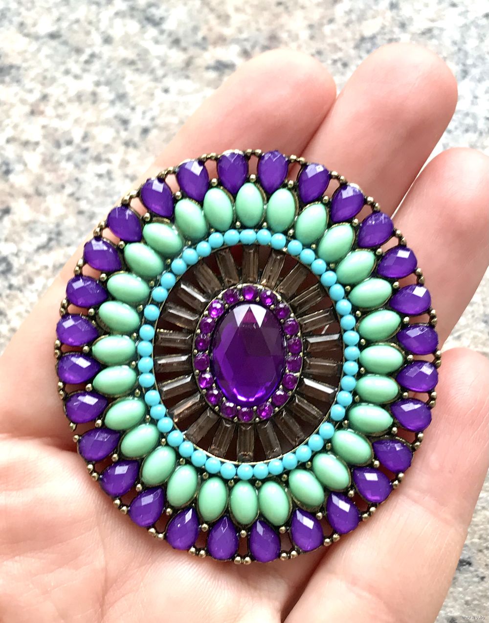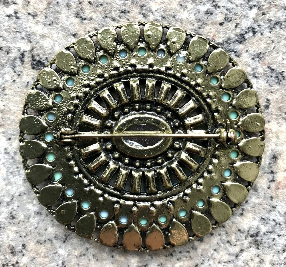 Крупная (5х5,5) брошь, основа выполнена из сплава золотистого тона, вставки из пластика, состояние хорошее.