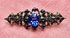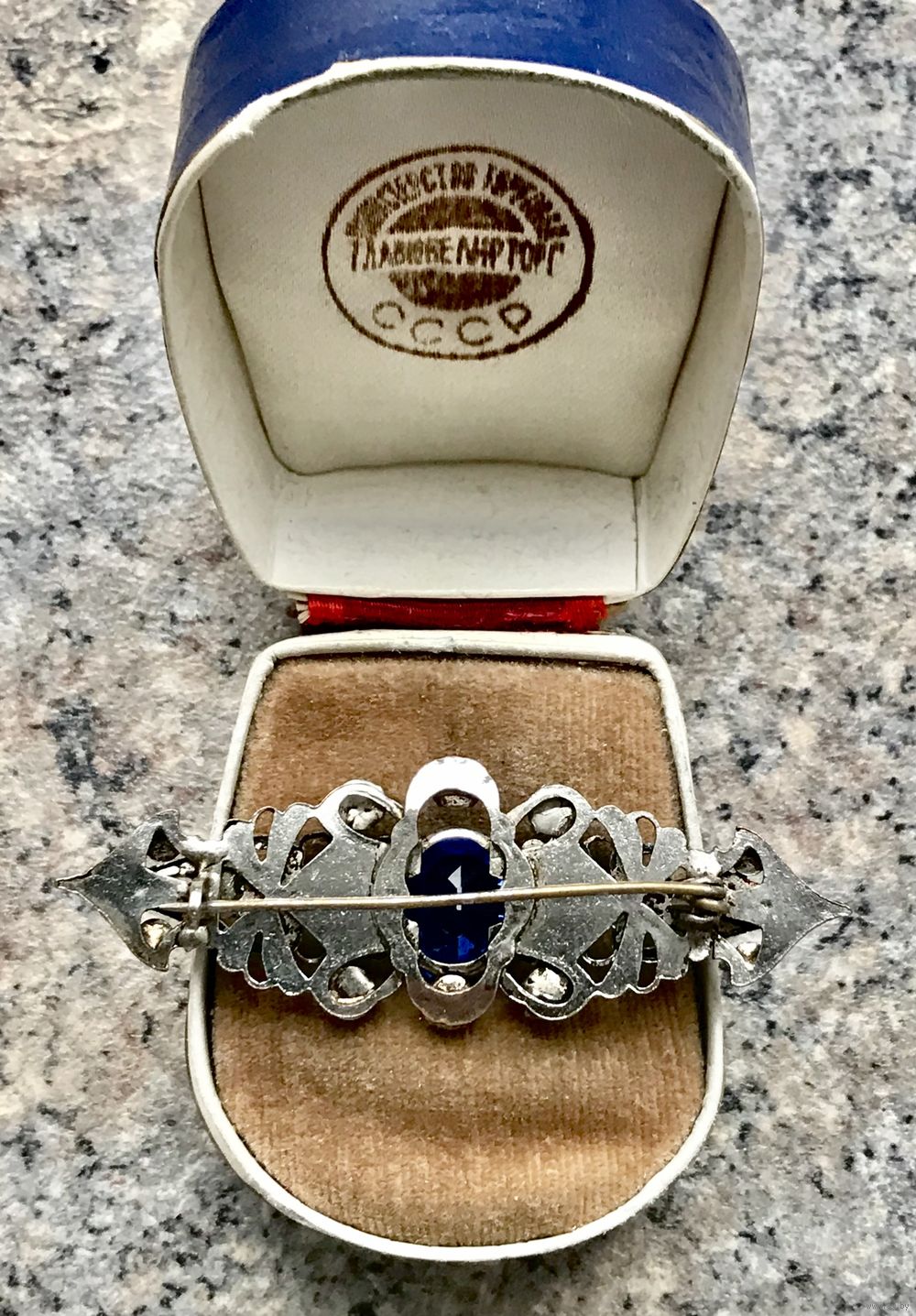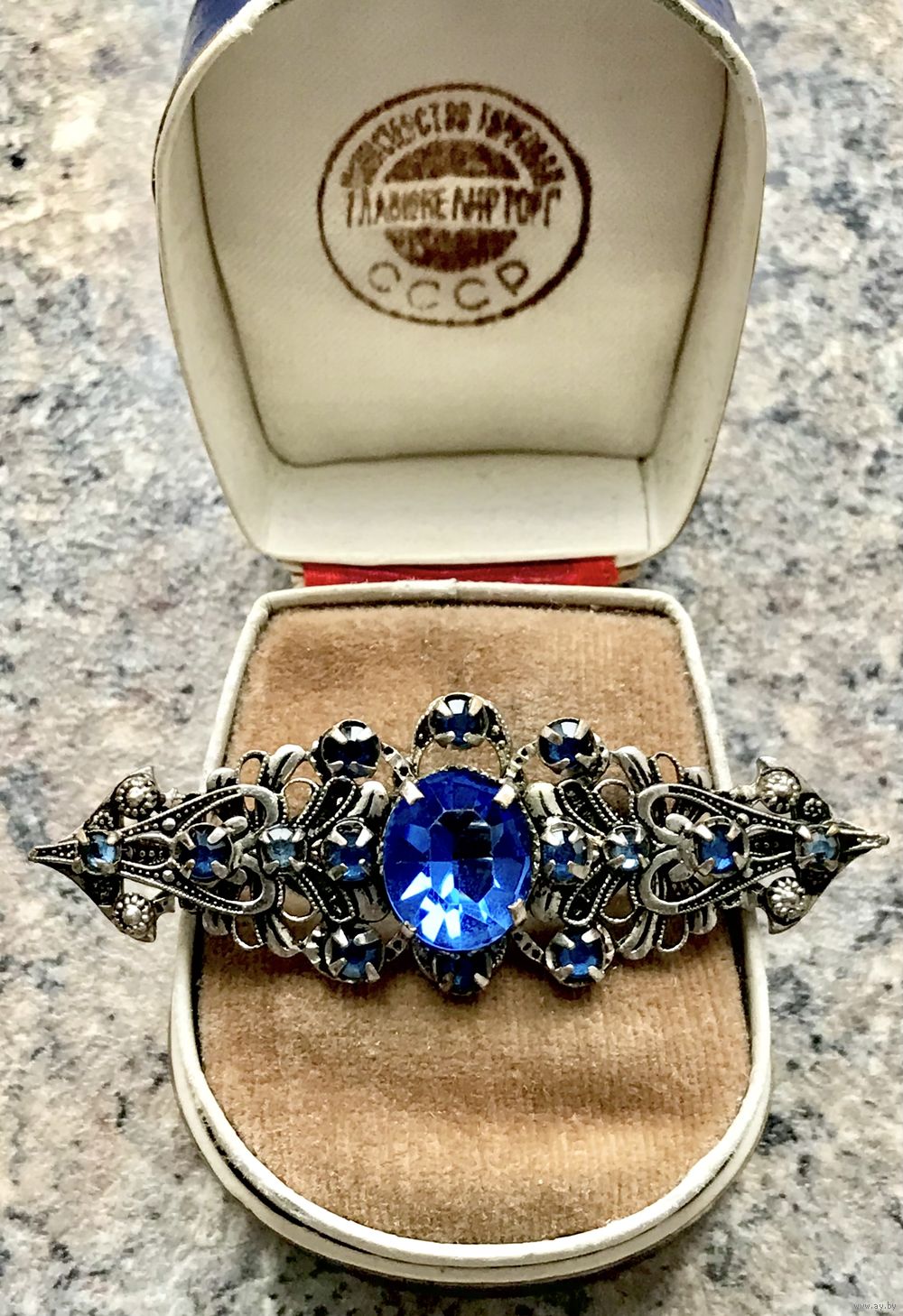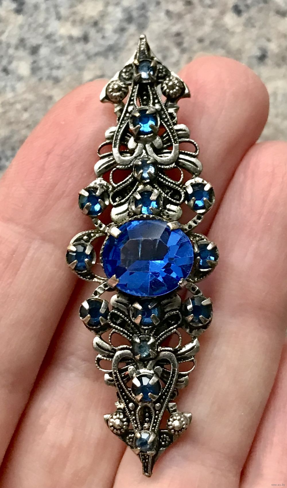 Антикварная брошь (30-50-е гг.) с основой из латуни с серебрением и вставок из стекла насыщенного синего цвета. На металле и центральной вставке имеются незначительные потёртости. Размер броши 6х2см. Для своих лет состояние отличное.