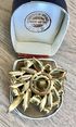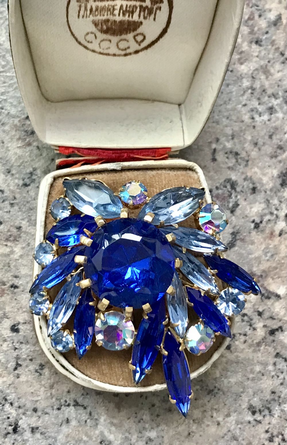 Винтажная крупная чешская брошь с основой из латуни и вставками из цветного стекла и кристаллами с покрытием AB. Размер броши 5,5х4,5см. Немного подвижны несколько вставок. Общее состояние хорошее.