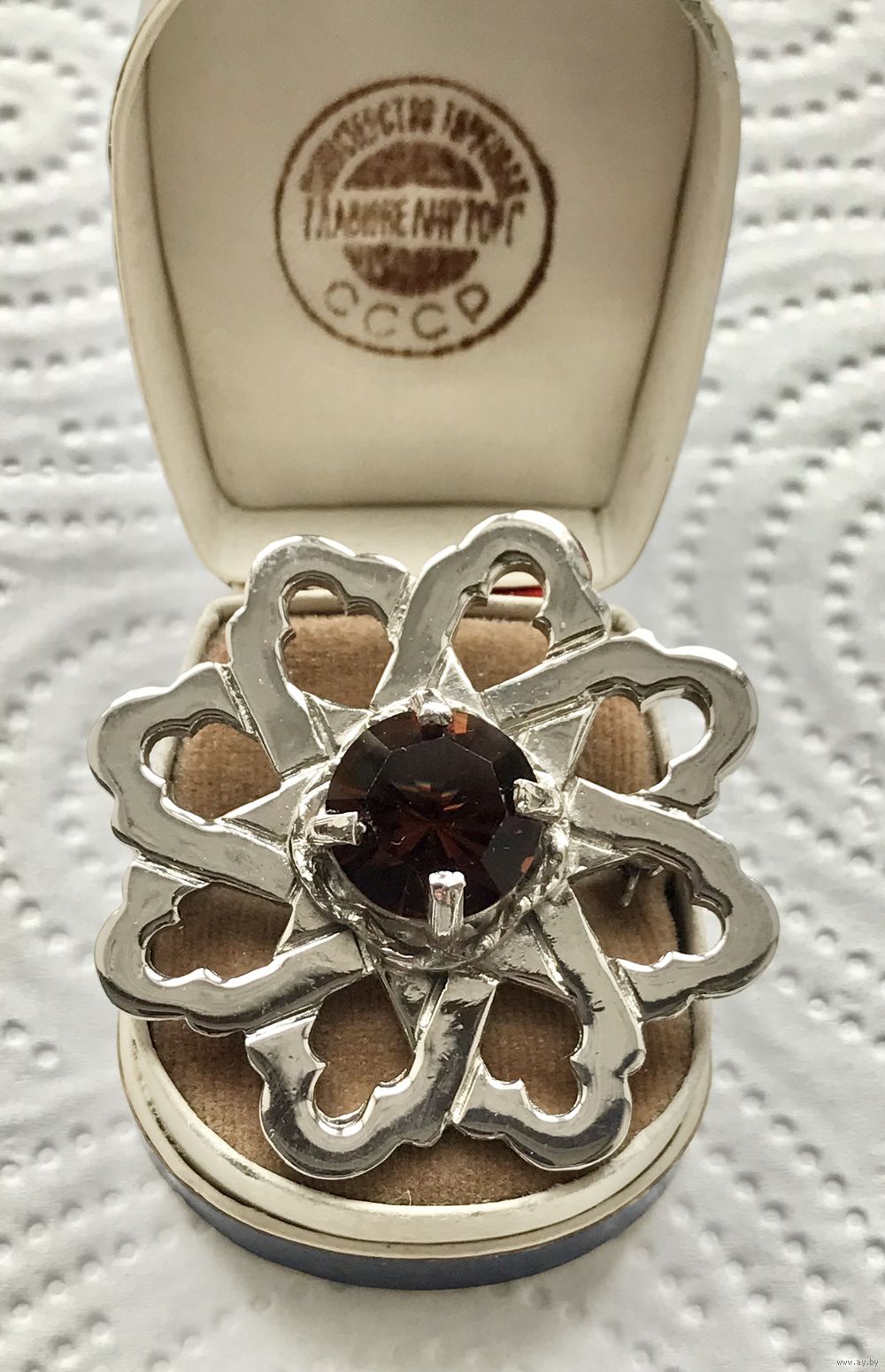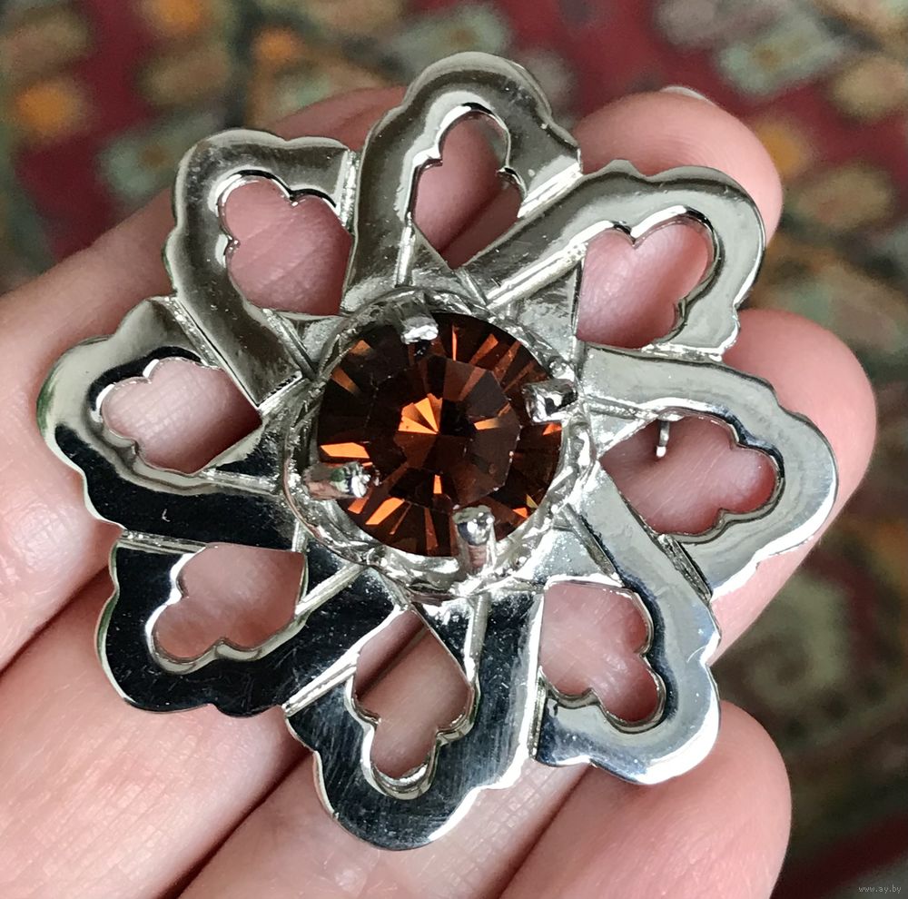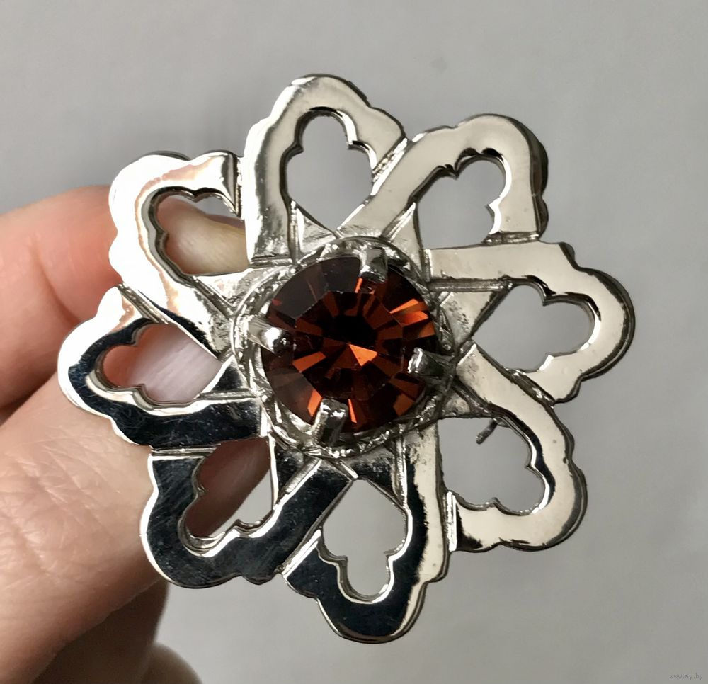 Крупная винтажная шотландская брошь. Основа сделана из сплава под серебро, в центре крупный кристалл коньячного цвета. Диаметр броши 5см., диаметр вставки 1,4см. Не маркирована. Состояние хорошее.