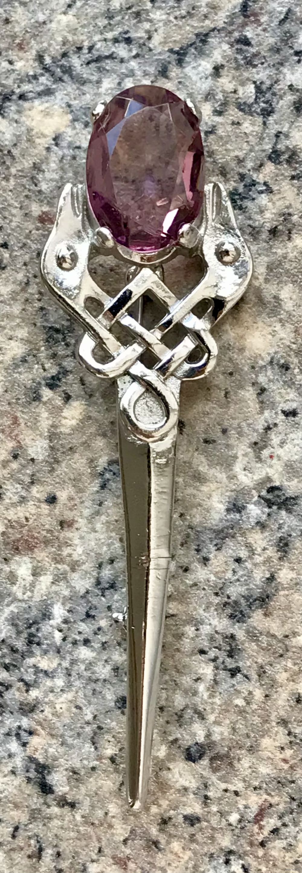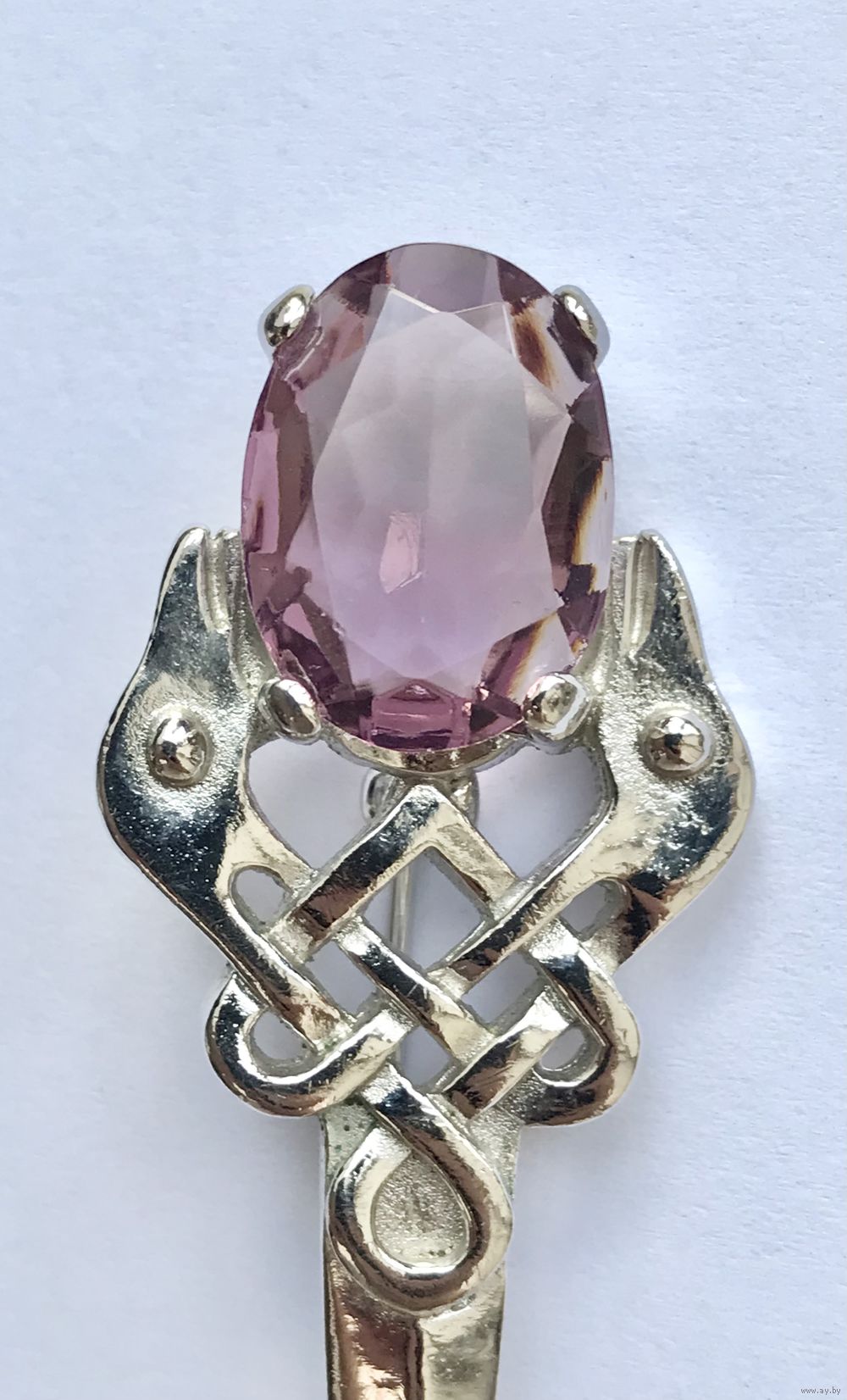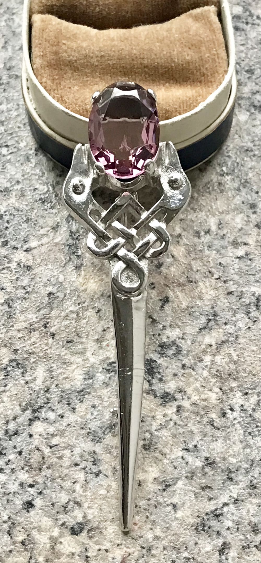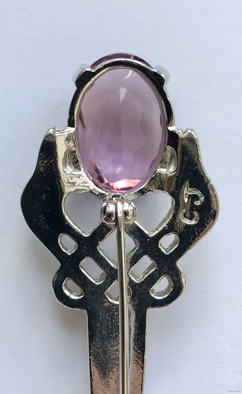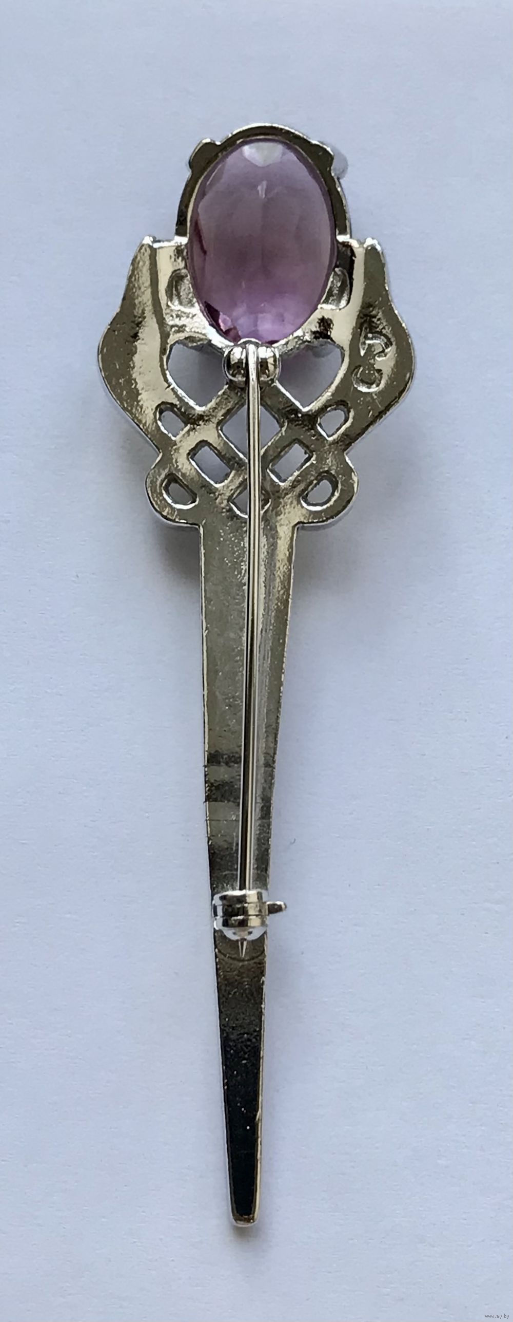 Крупная булавка для килта- килт-пин от компании Carrick Jewellery, 70-е гг., Шотландия. Выполнена из ювелирного сплава серебристого тона и украшена кристаллом из ювелирного стекла, имитирующим аметист. На металле местами присутствуют незначительные царапинки, а на вставке микросколы, которые не заметны невооружённым глазом. Высота броши 8,5см., размер вставки 1,7х1,3см. Украшение маркировано.