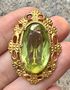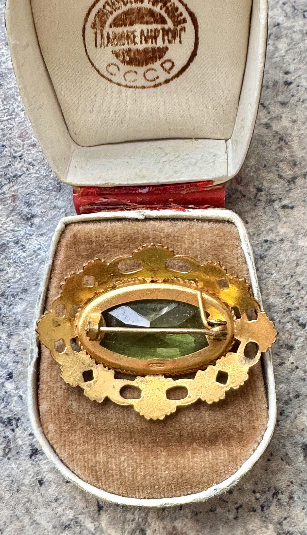 Винтажная брошь леденец с основой из латуни с позолотой и вставкой из стекла. На вставке имеются небольшие скольчики. Размер броши 4х3см., размер вставки 2,5х1,5см.