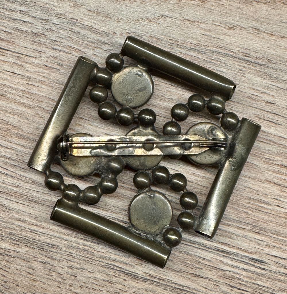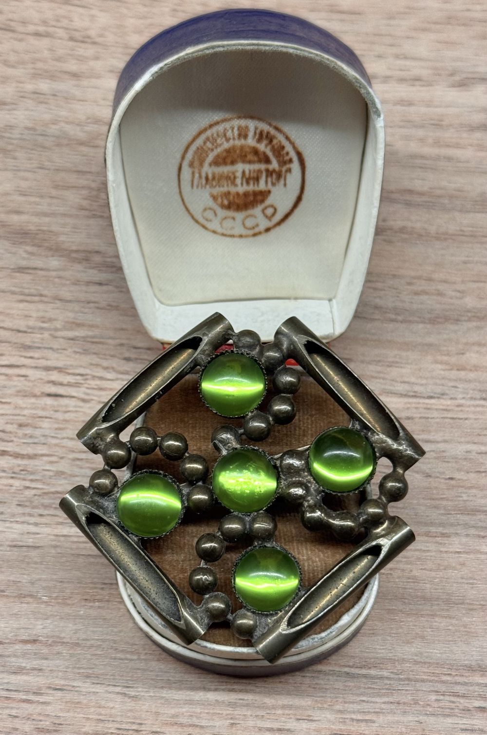 Крупная винтажная брошь с основой из металла под бронзу, на лицевой стороне вставки из люцита. Размер 4,7х4,7см. Состояние хорошее.