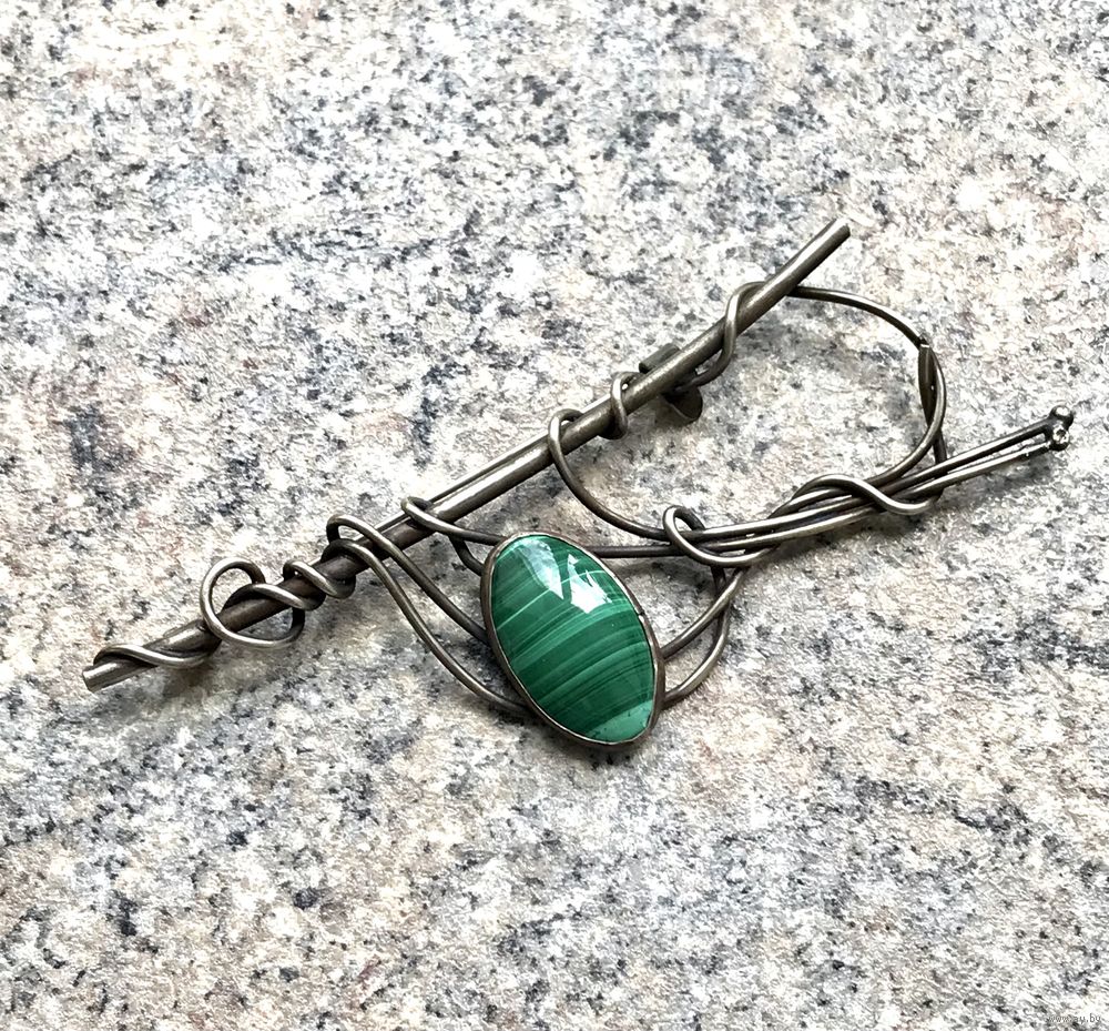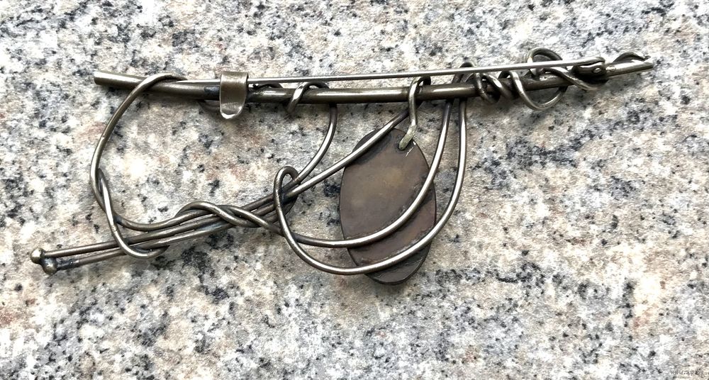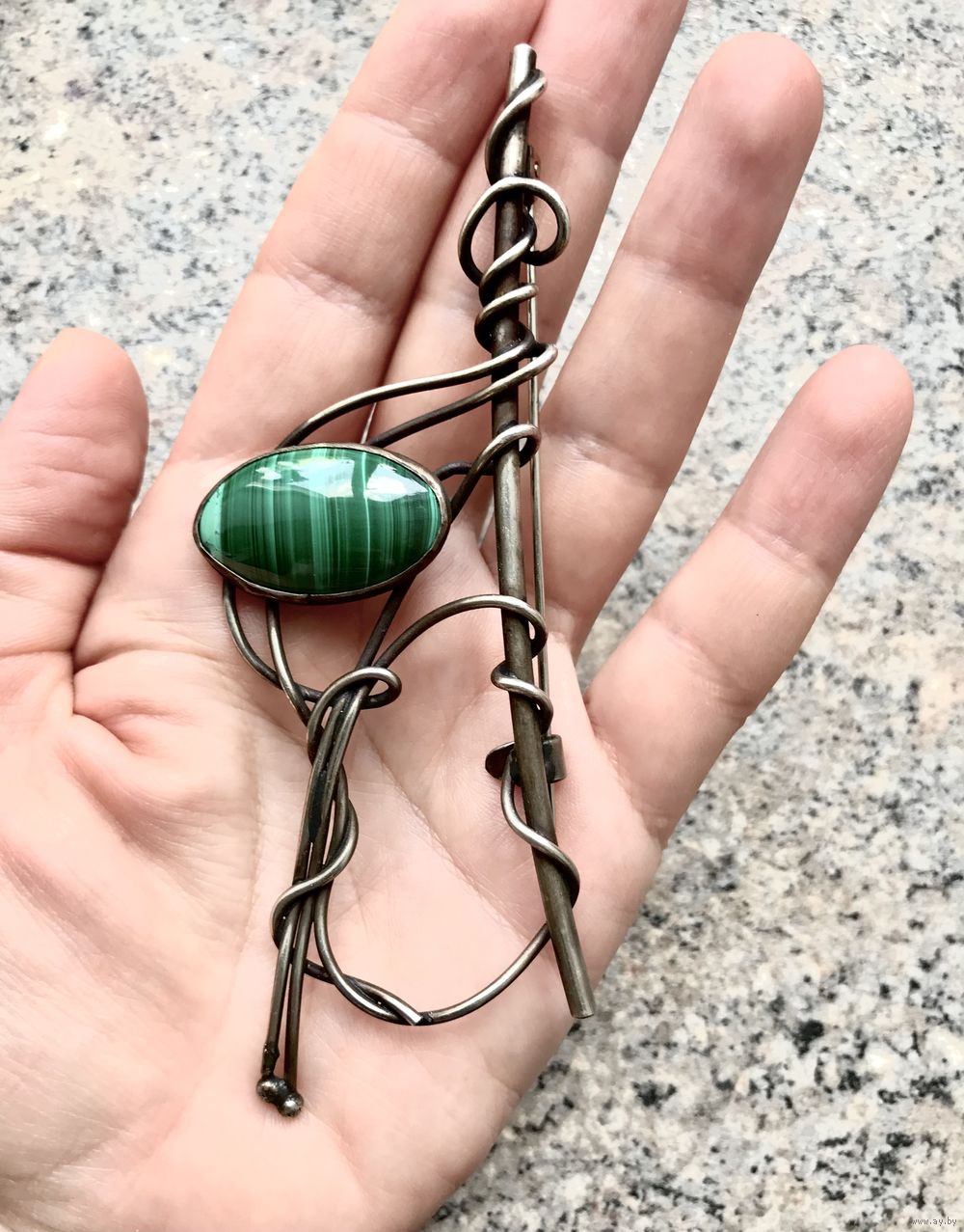 Винтажная, крупная (я бы даже сказала огромная, вес больше 20гр.) брошь с основой из мельхиора, ручная работа. Вставка из художественного стекла (есть небольшой скол, не бросающийся в глаза). Высота броши 12 см., размер вставки 2,5х1,5см.