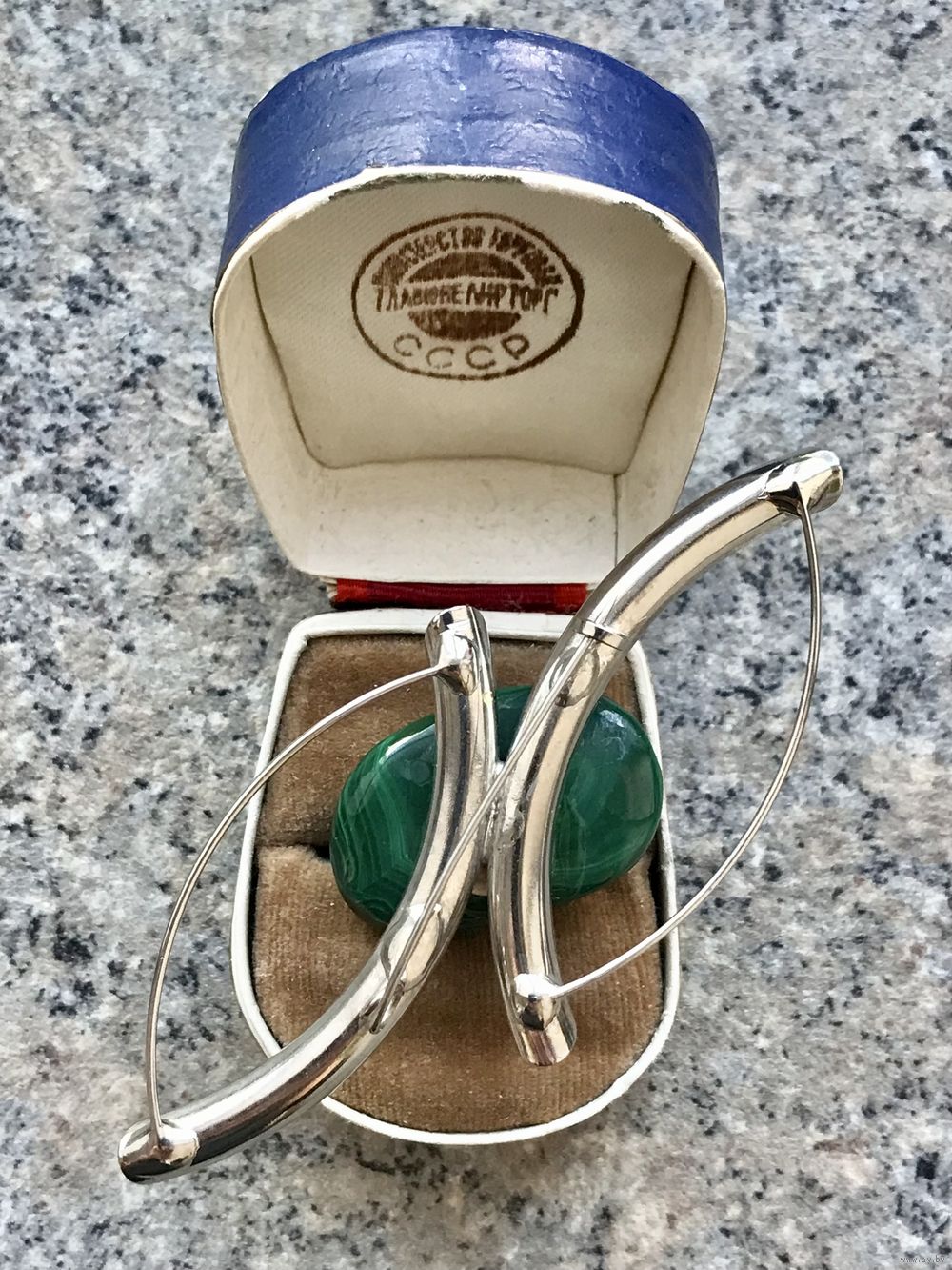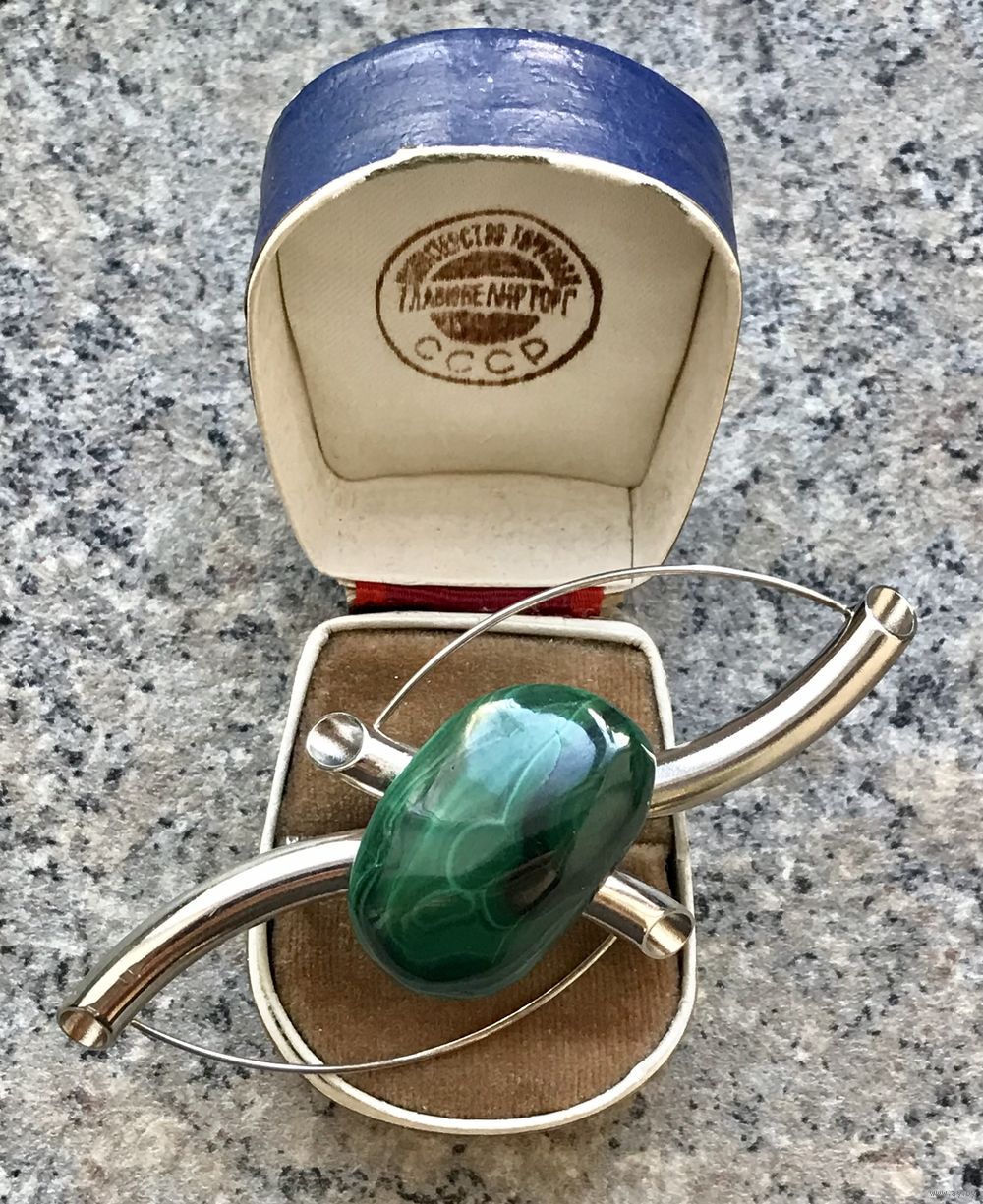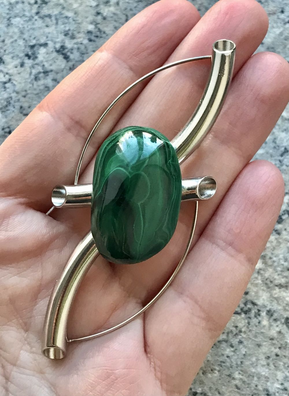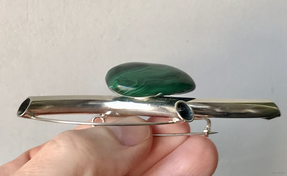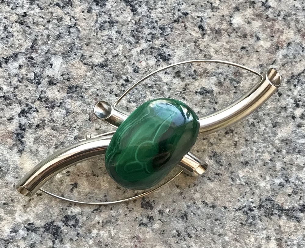 Крупная брошь с основой из металла серебристого тона и малахитовой вставкой . Размер броши 8,5х4см., размер вставки 3х2см. Состояние хорошее.
