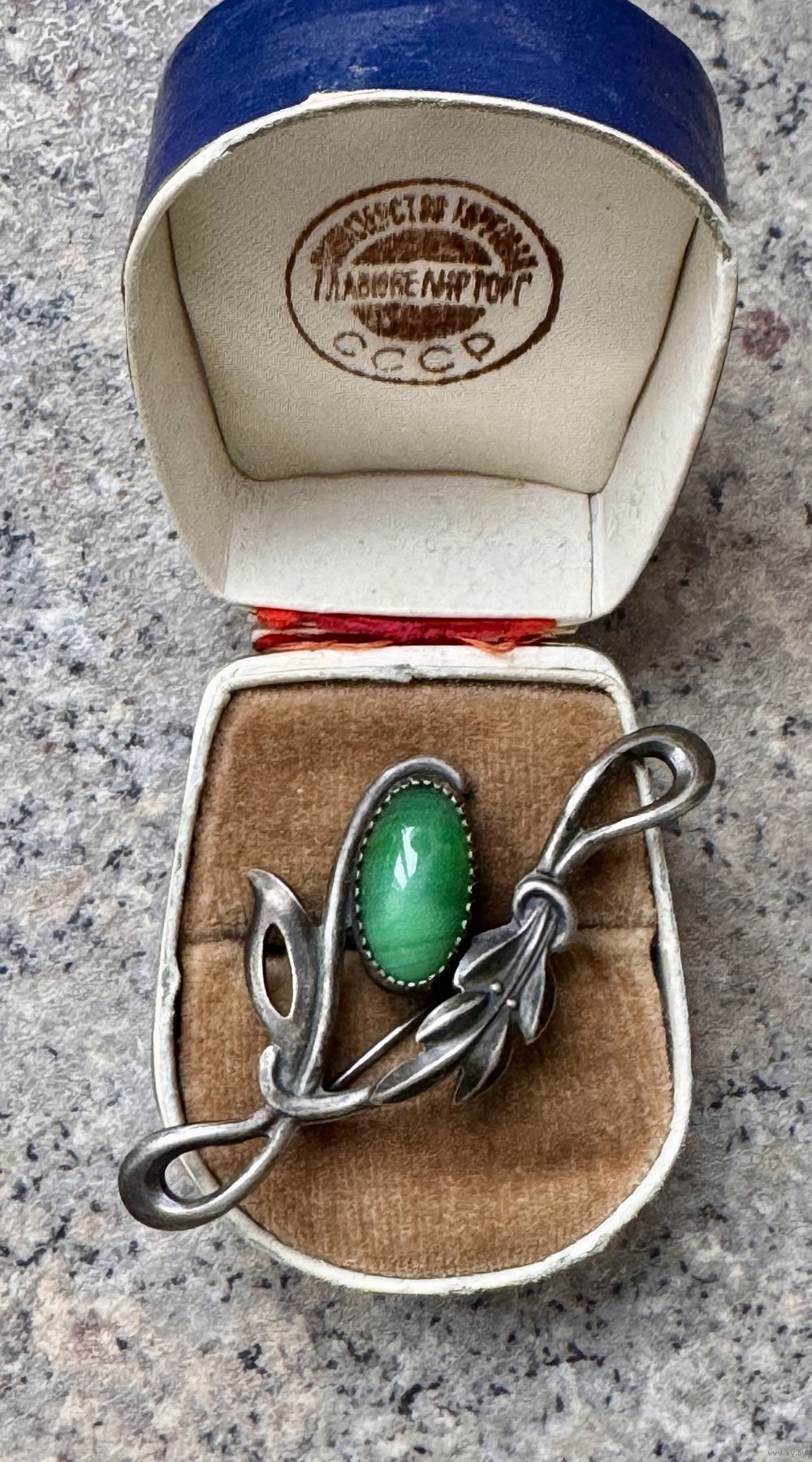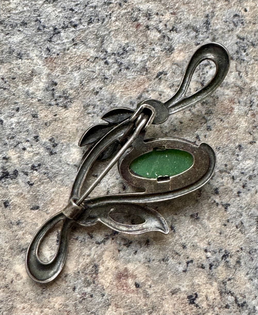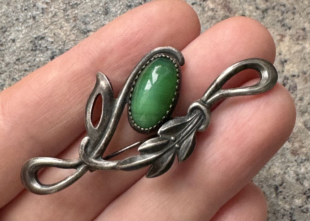 Винтажная брошь из мельхиора со вставкой из художественного стекла. Размер броши 5,6х2,5см. Состояние хорошее.
