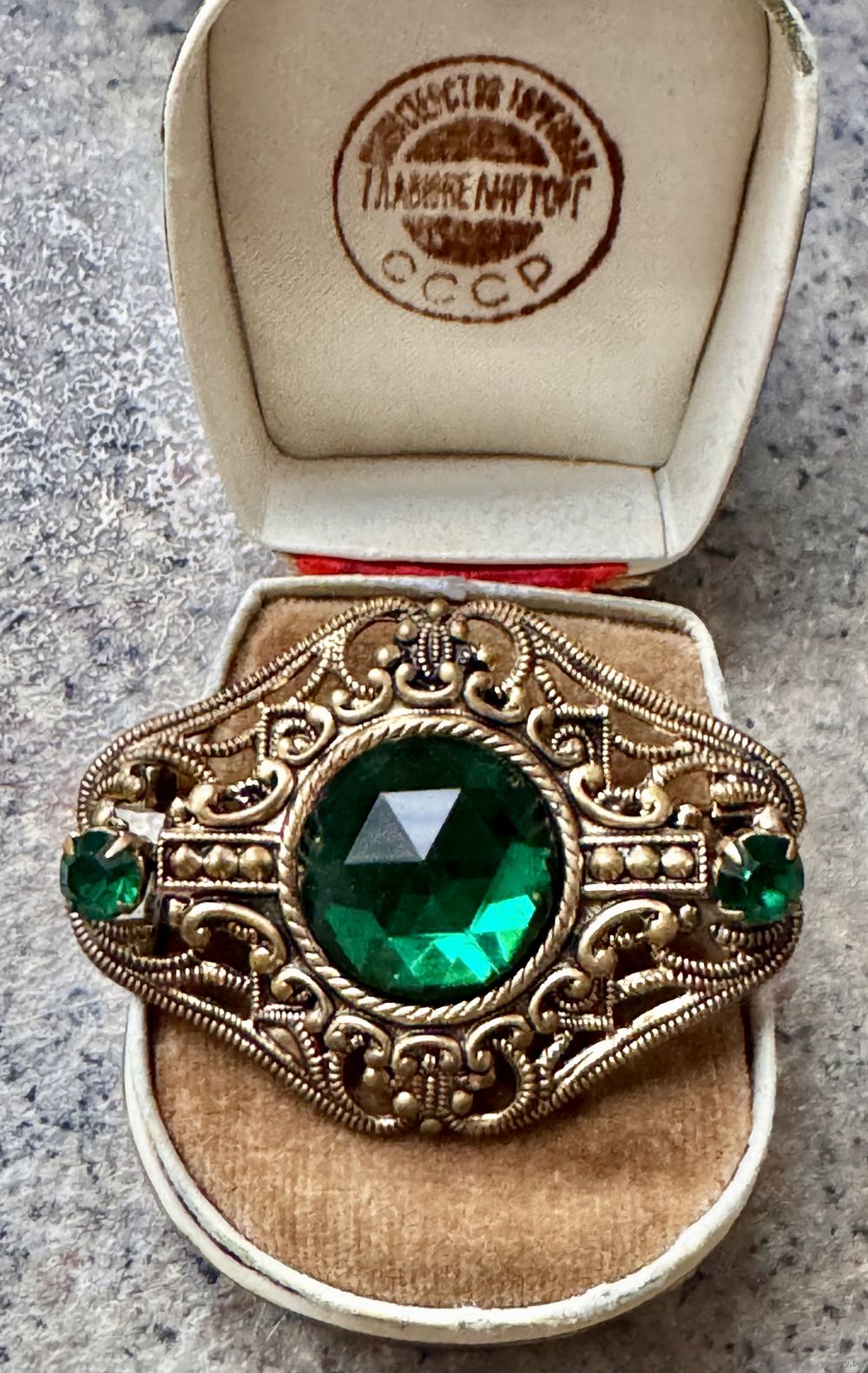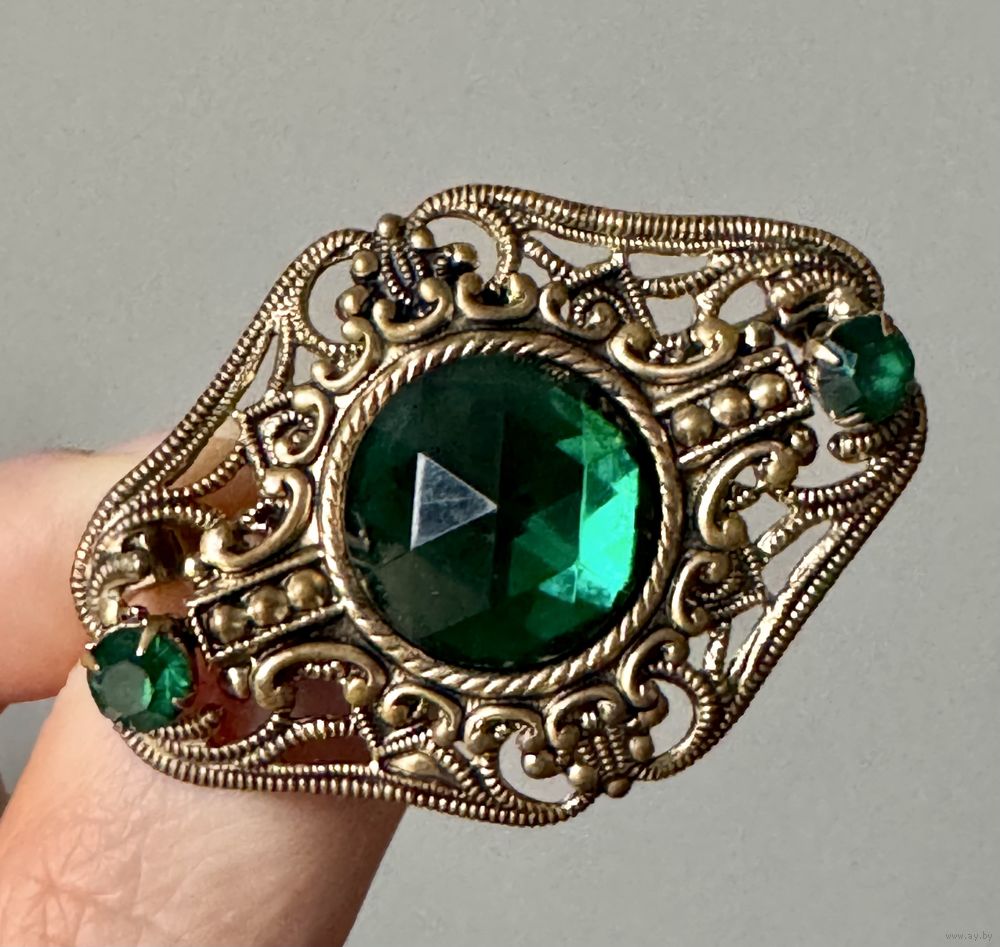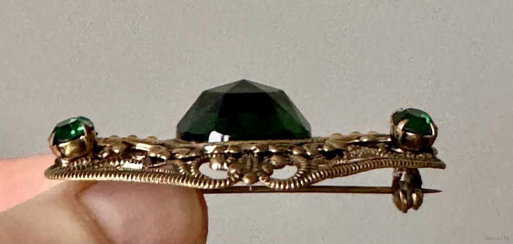 Винтажная брошь с основой из латуни, на лицевой стороне вставки из стекла зелёного цвета. Размер броши 4,5х3,5см., диаметр центральной вставки 1,5см. Состояние хорошее.