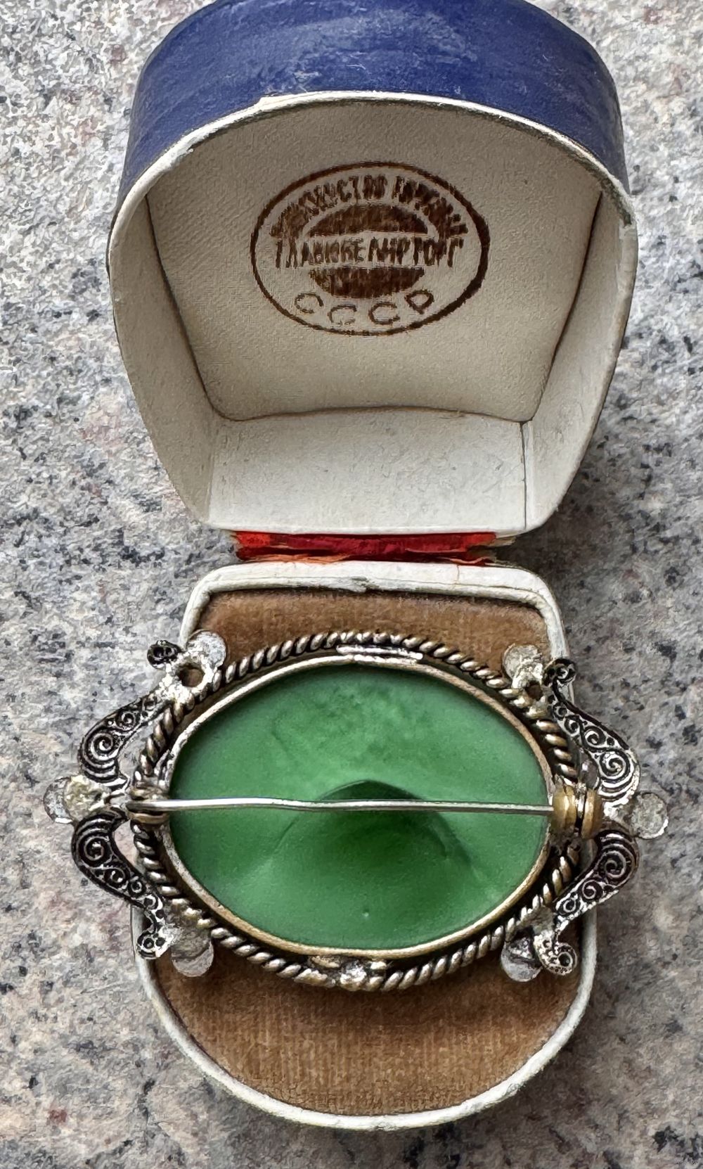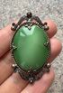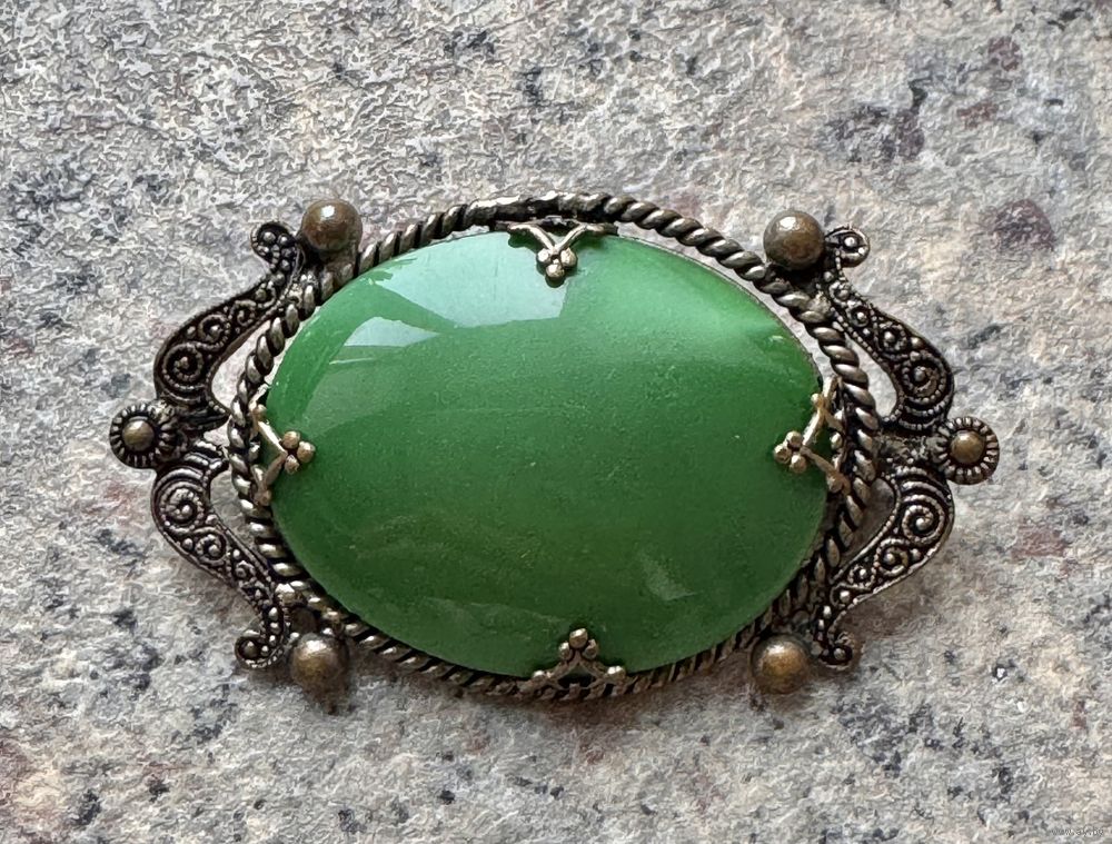 Винтажная брошь с основой из латуни, вставка из художественного стекла. Размер броши 5,5х3см., размер вставки 3,5х2,5см. Состояние хорошее.
