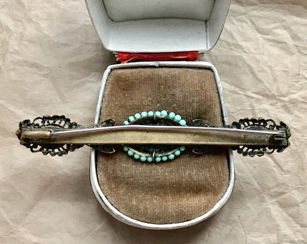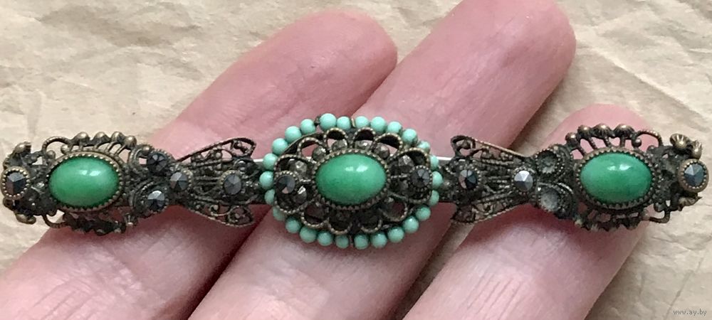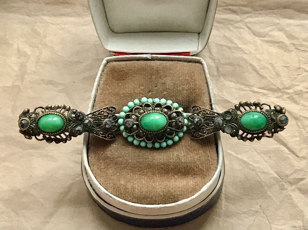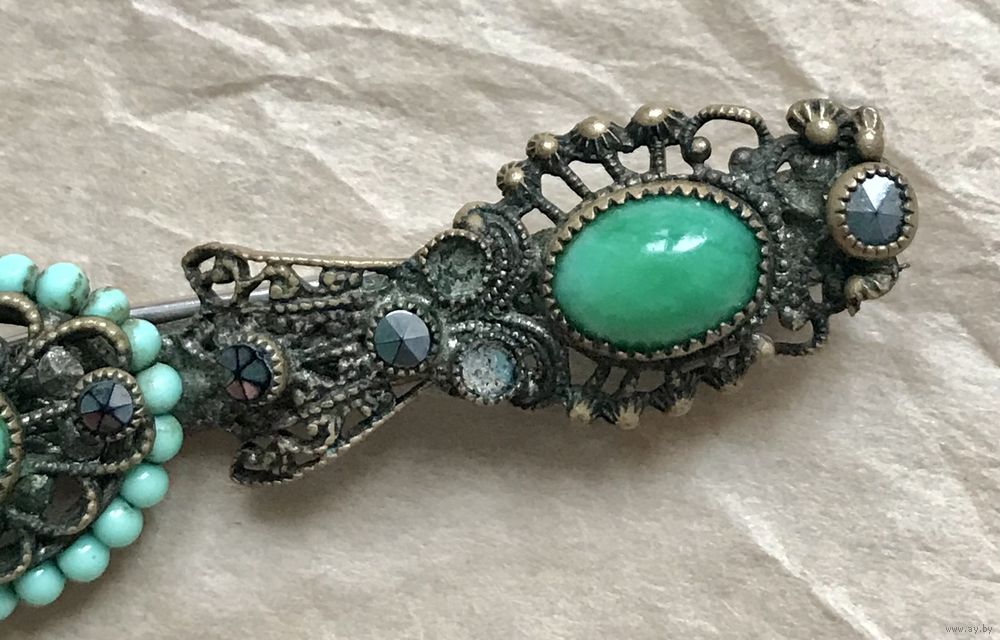 Антикварная, скорее всего чешская брошь-планка с основой из латуни, вставки из цветного стекла и стекла под марказиты (двух не хватает). Длина броши 7,7см., высота 1,5см. Для своих лет состояние хорошее.