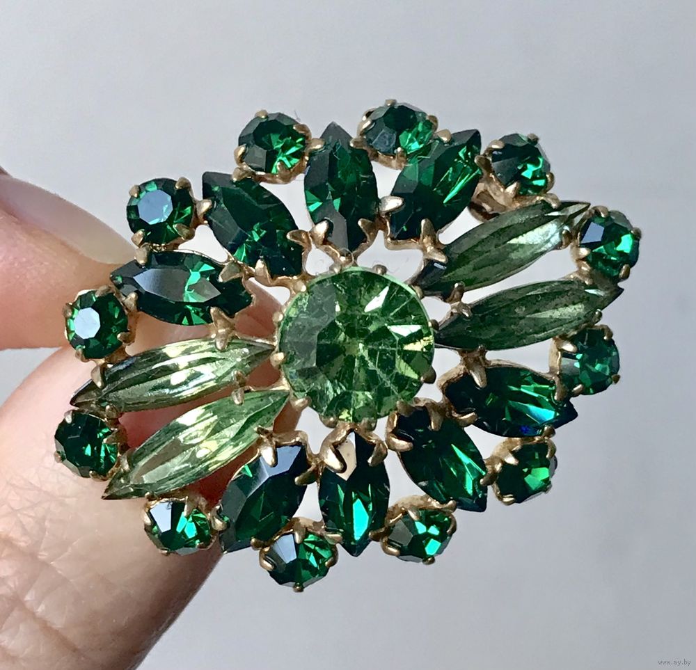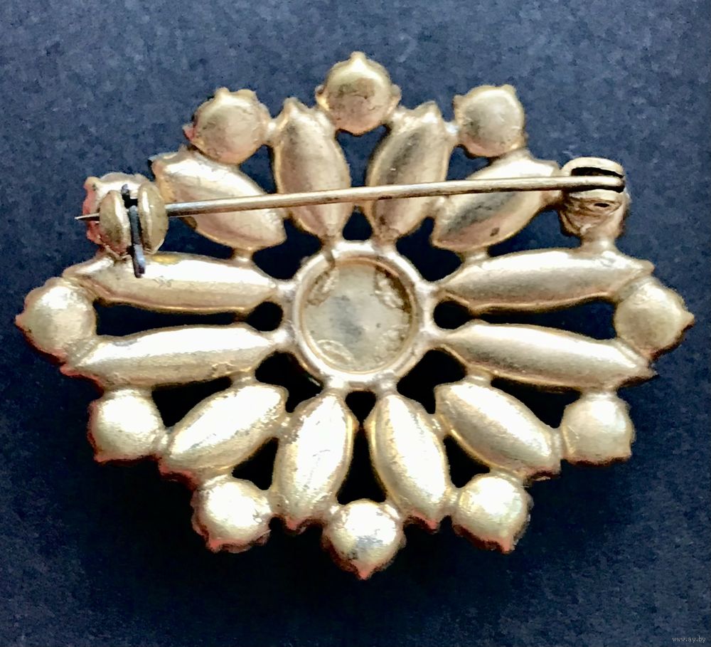 Небольшая чешская брошь с основой из латуни с позолотой и вставками из цветного стекла. Размер 4,4х3,5см. Состояние хорошее.