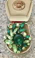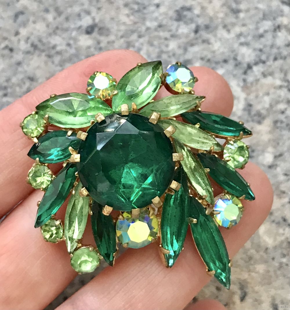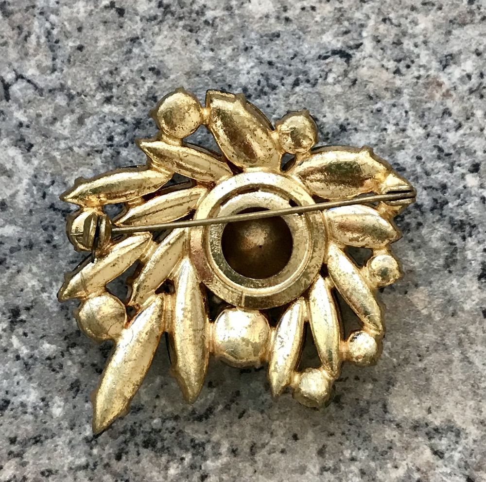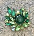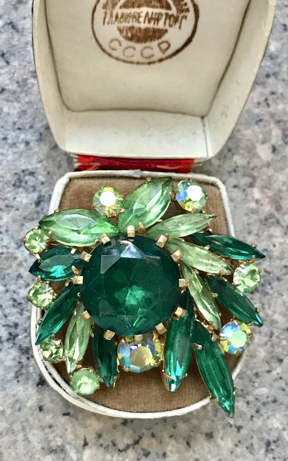 Крупная винтажная чешская брошь с основой из латуни и вставками из цветного стекла и кристаллами с покрытием AB. Размер броши 5х4,5см., диаметр центральной вставки 1,8см. Состояние хорошее.