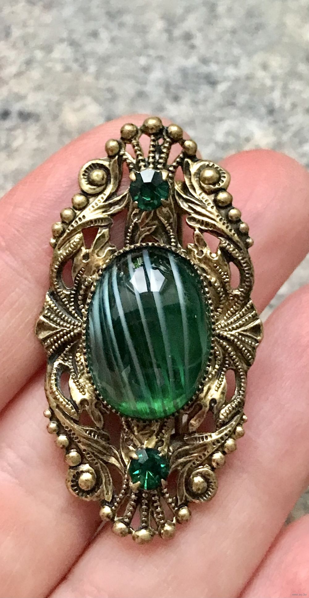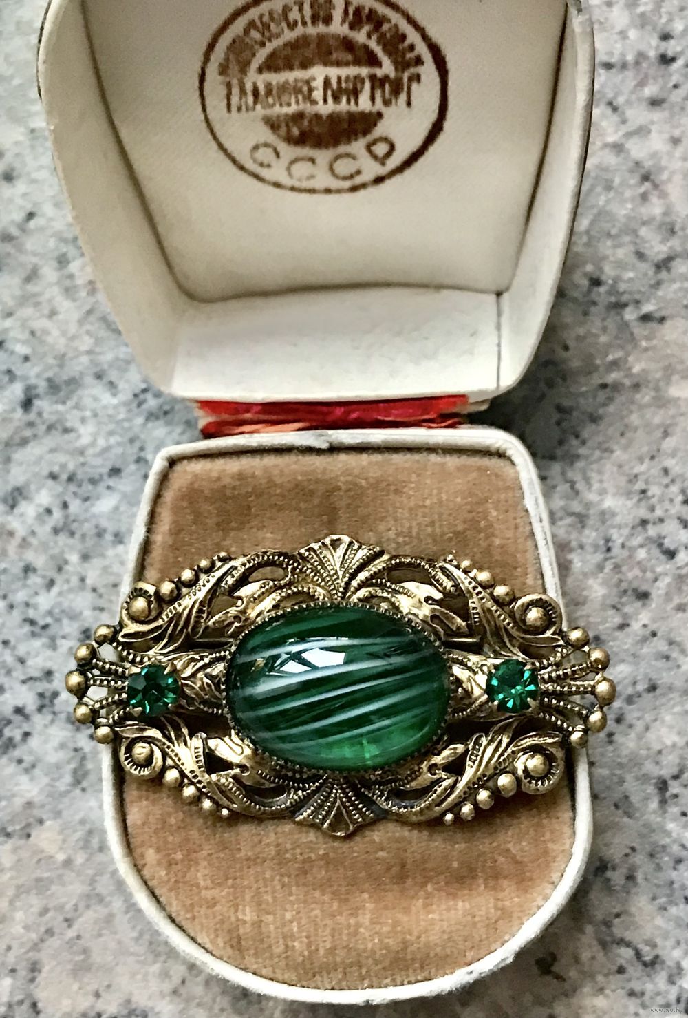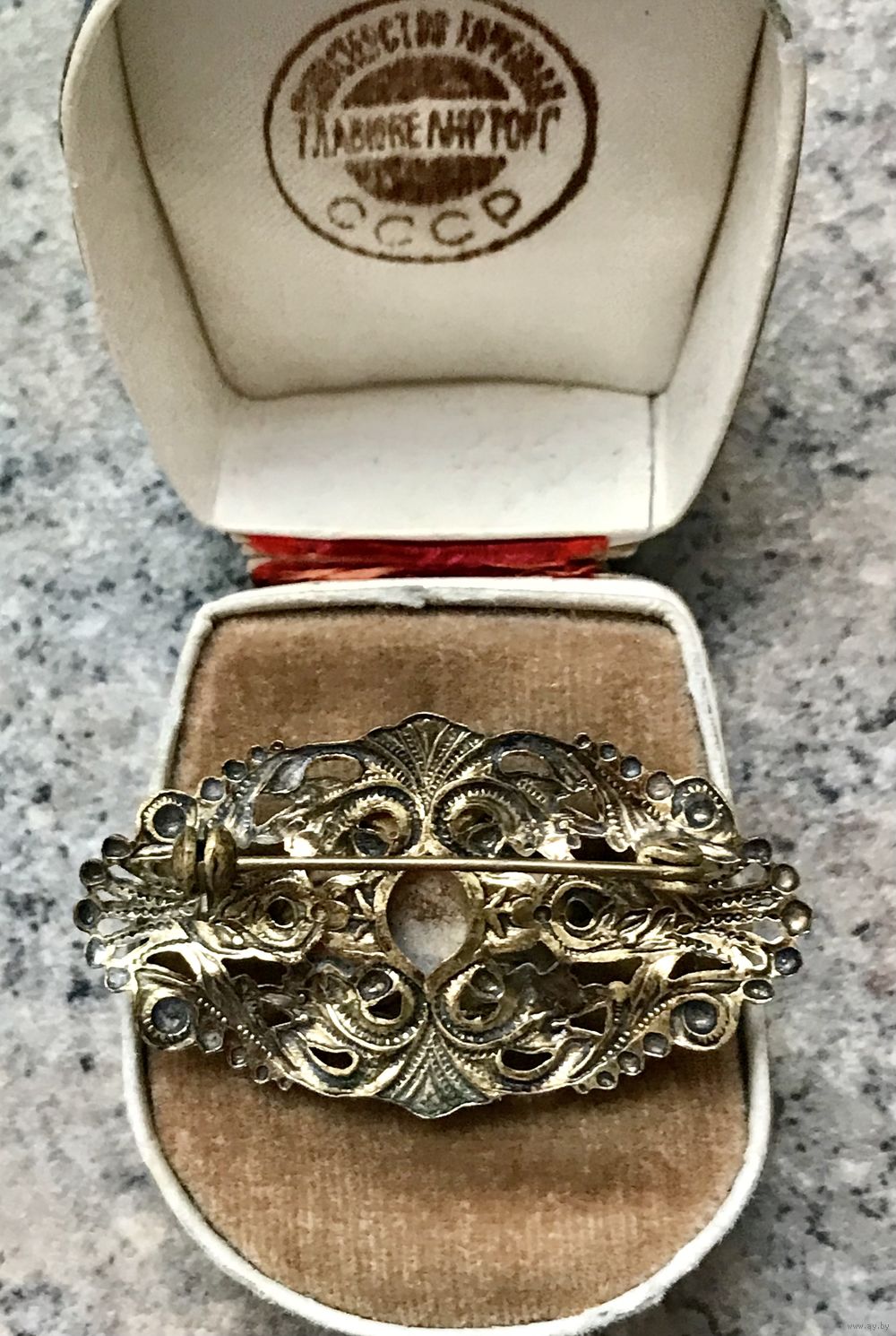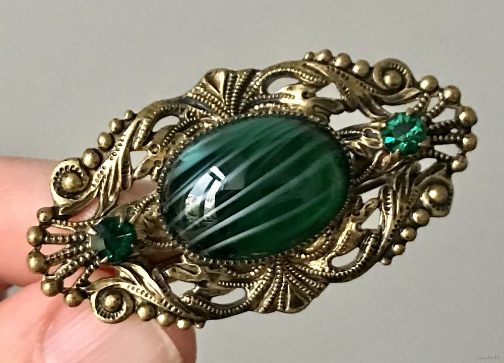 Винтажная брошь с основой из латуни. На лицевой стороне вставки из художественного стекла и кристаллов. Размер 4,5х2,5см. Состояние хорошее.
