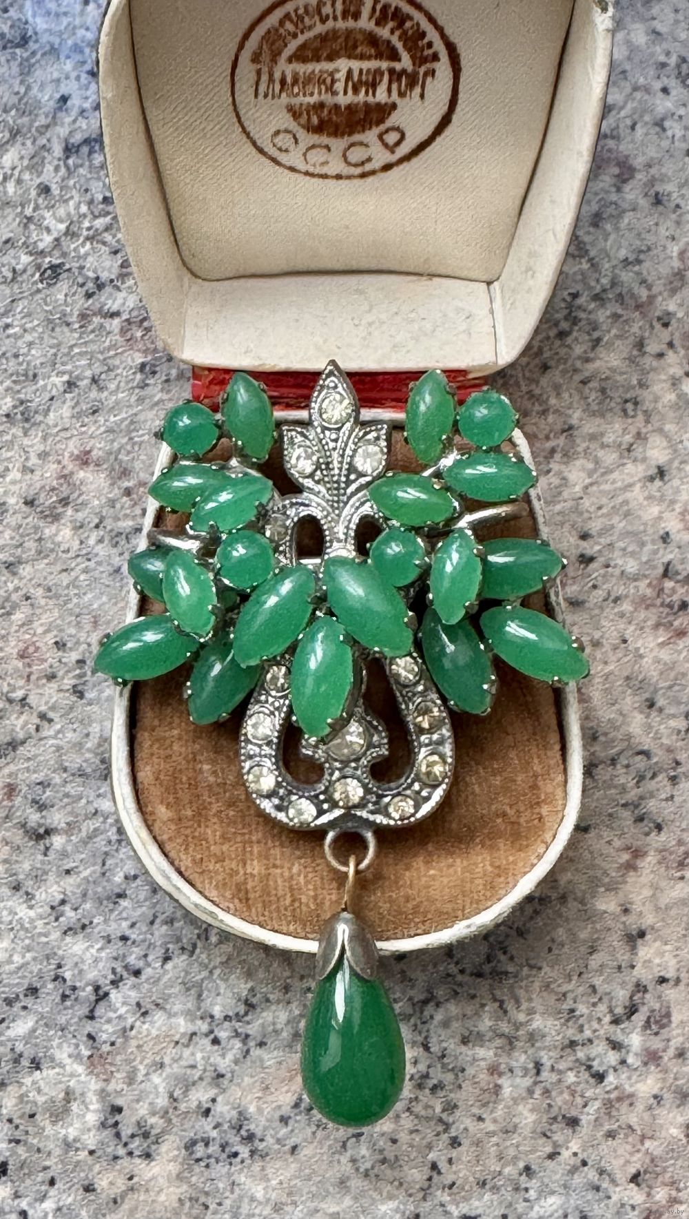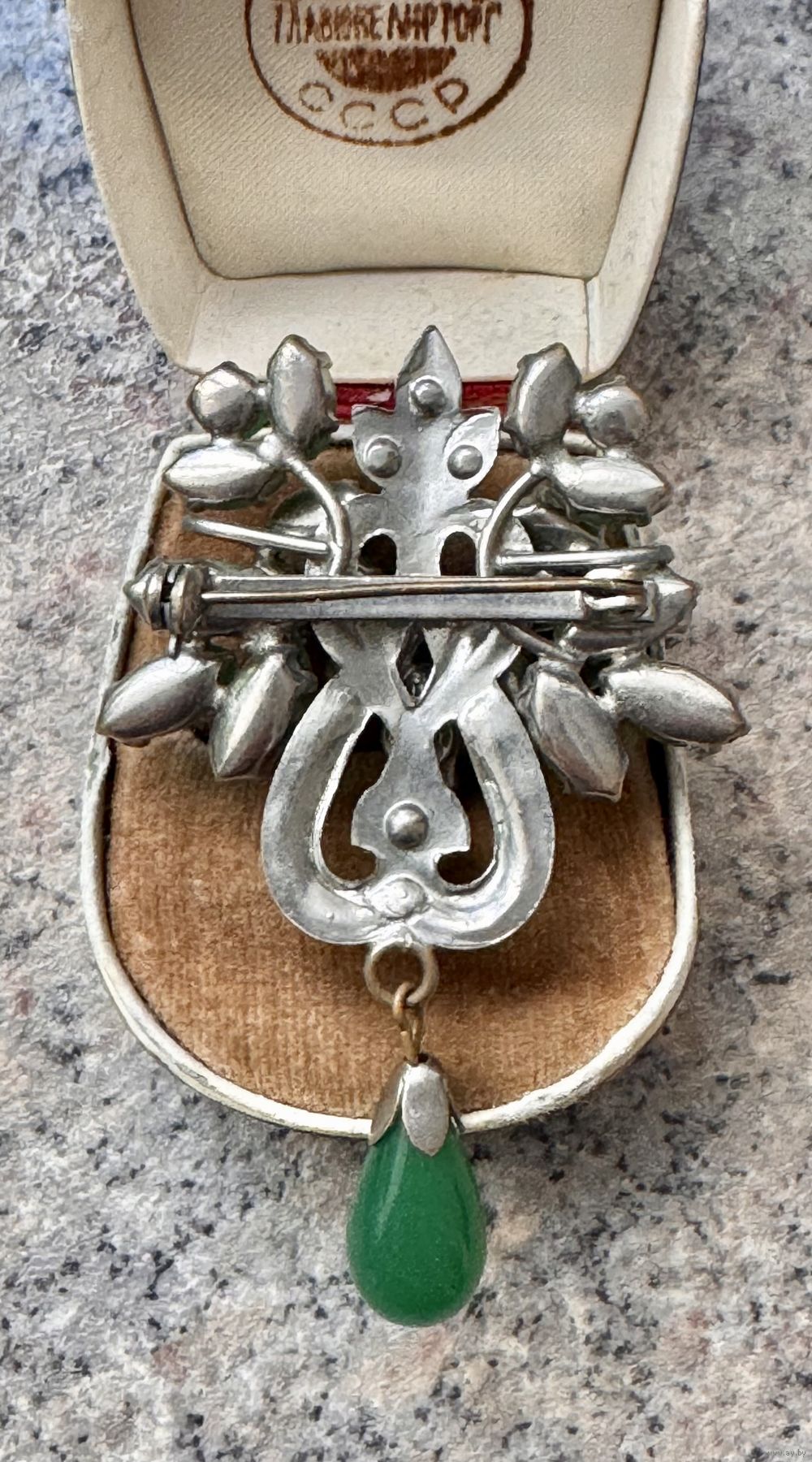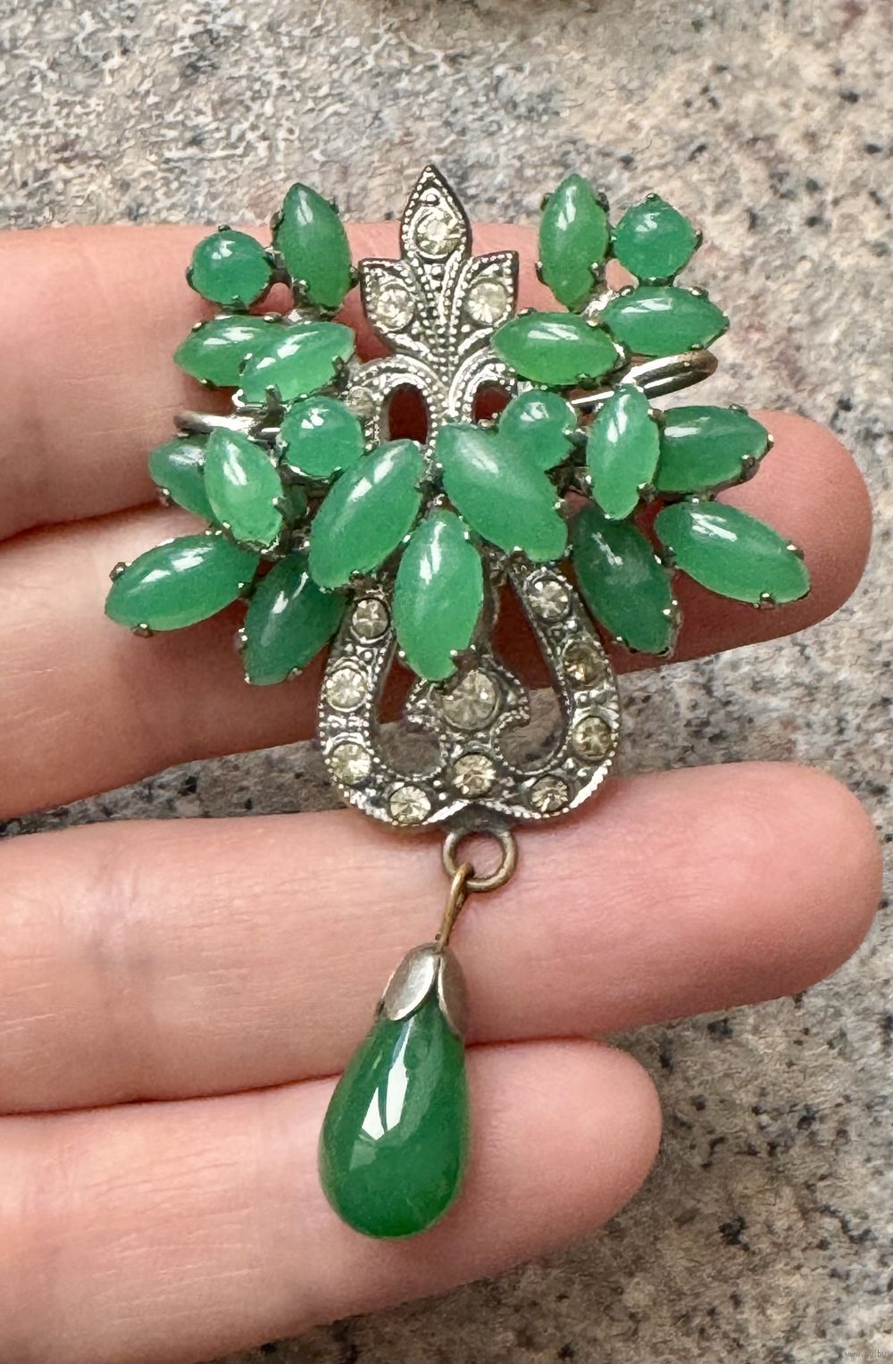 Чешская брошь, 1970-е гг. Основа сделана из латуни с покрытием под серебро, вставки художественное стекло и кристаллы. Высота броши с висюлькой 6,5см., ширина 4см. Состояние хорошее.