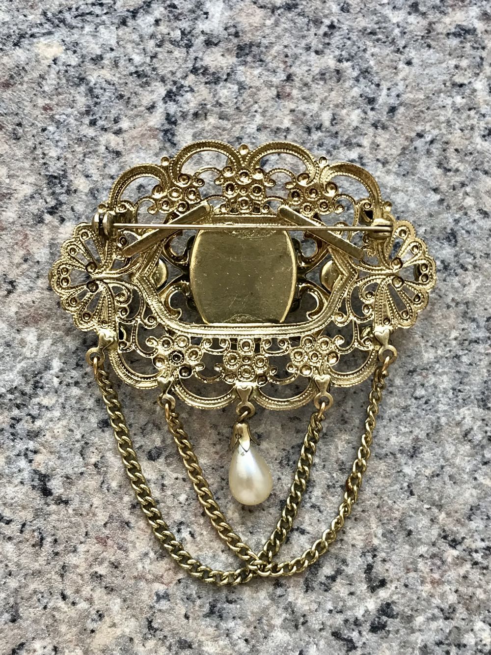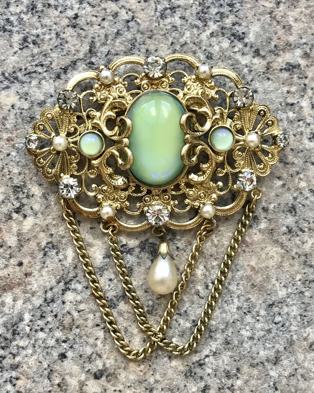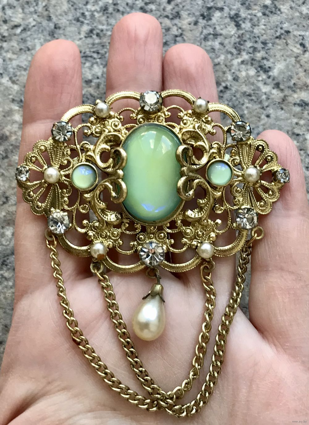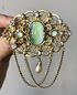 Крупная чешская брошь с основой из латуни, вставки из художественного стекла с эффектом сапфиритов, ювелирного стекла и бусин под жемчуг. Высота броши с цепочками 8см., ширина 7см. Размер центральной вставки 2,3х1,5см. Состояние хорошее.