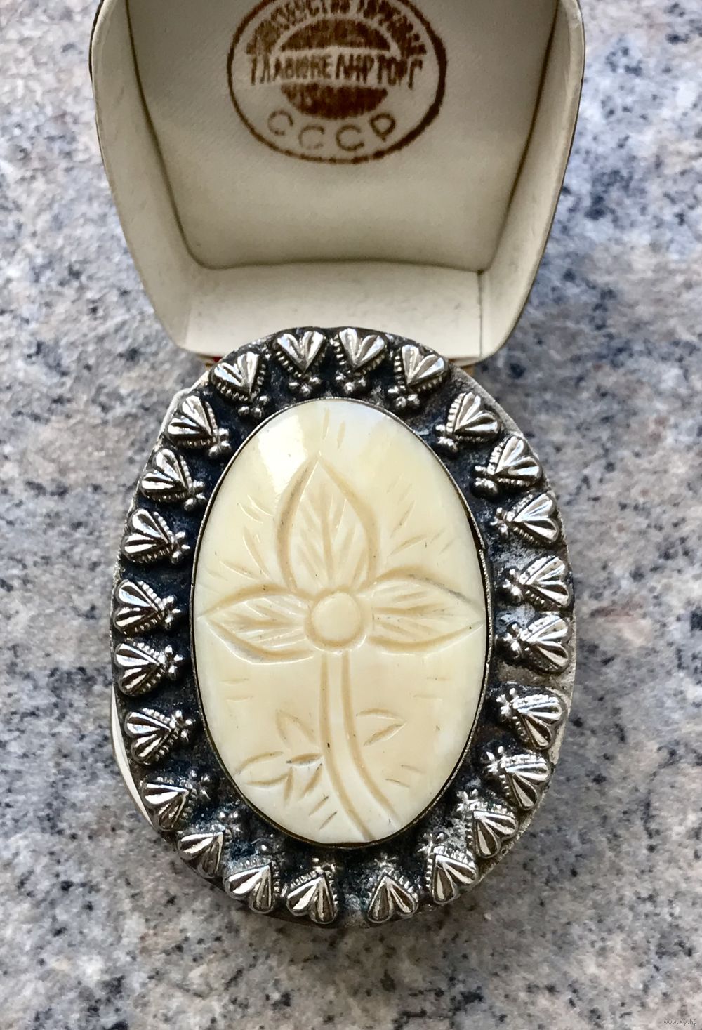 Крупная винтажная брошь с основой из металла серебристого тона. Вставка из кости с резьбой. Размер броши 5,5х4,3см., размер вставки 4х2,7см.