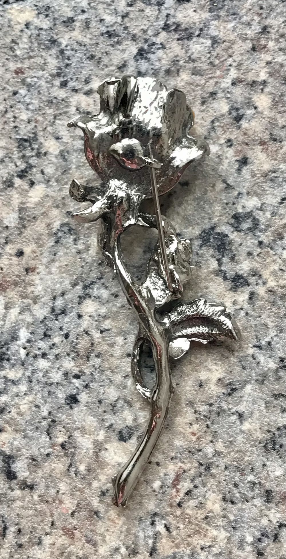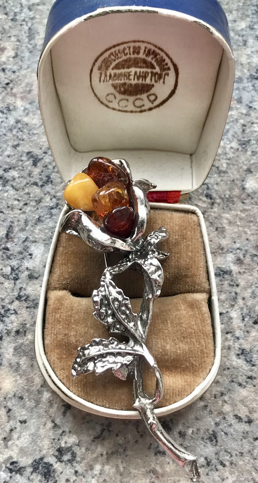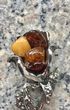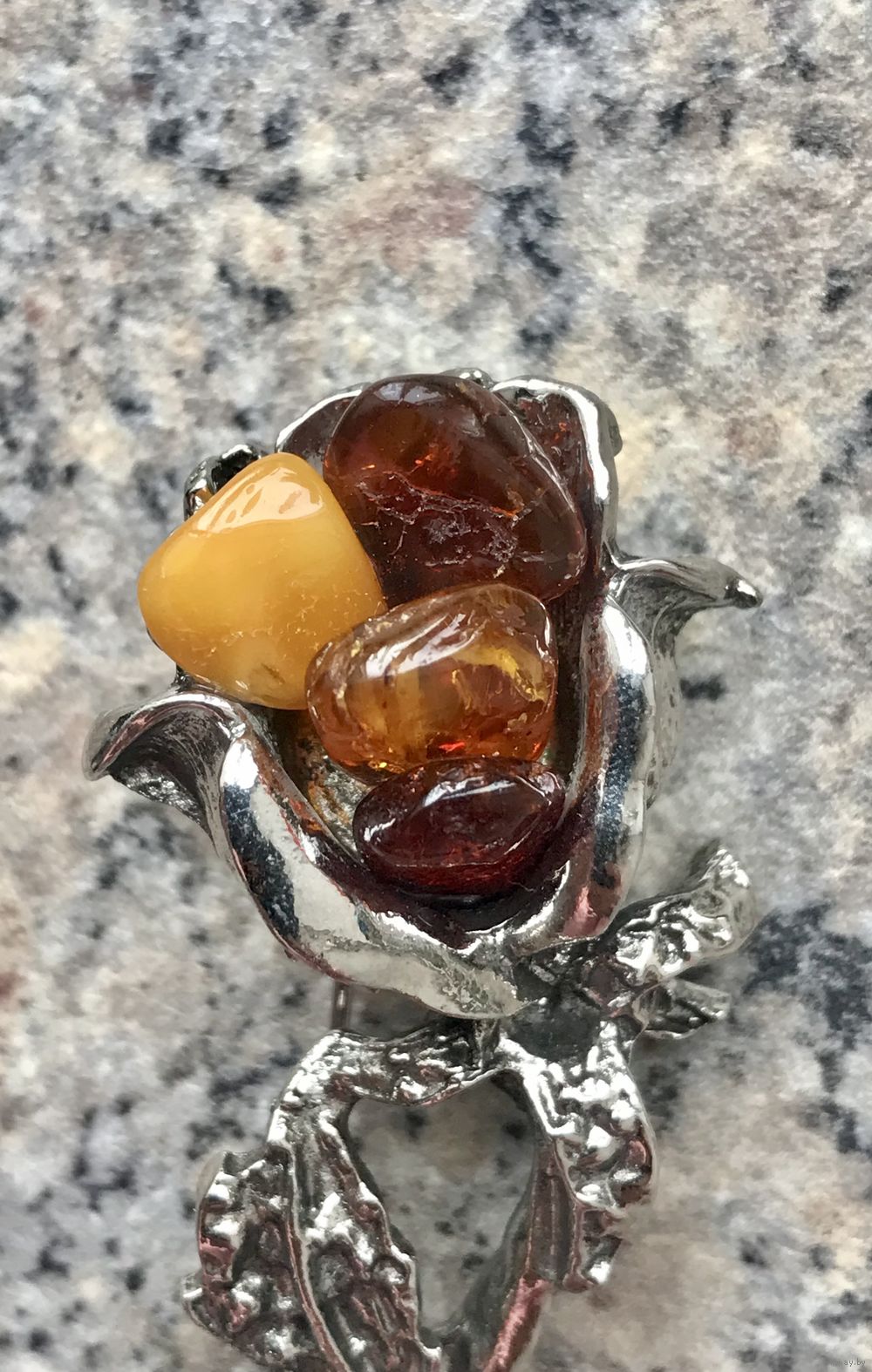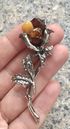 Крупная (высота 7см., бутон 2х2,2см.) брошь в виде розы из металла с серебрением, вставки- кусочки янтаря разных оттенков. Состояние хорошее.