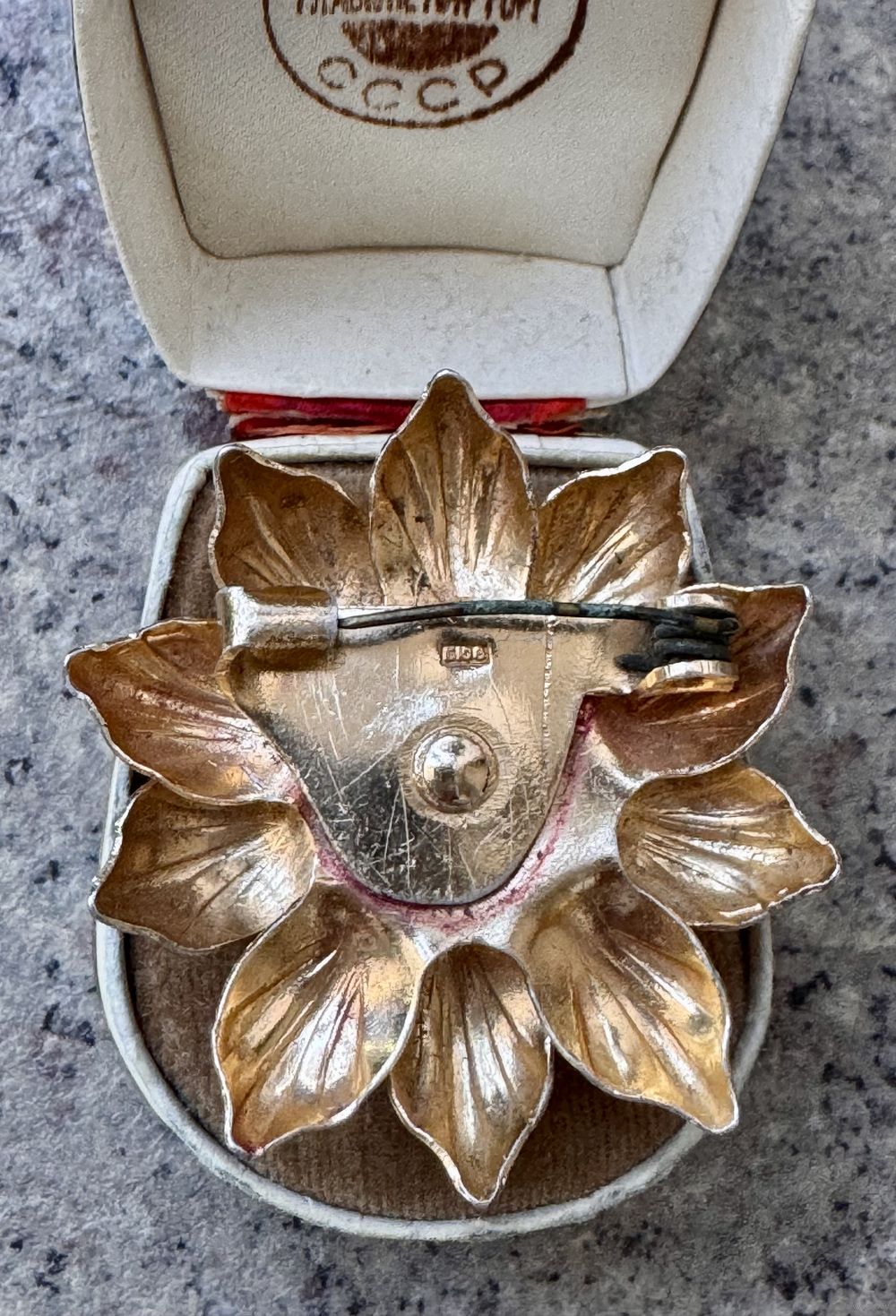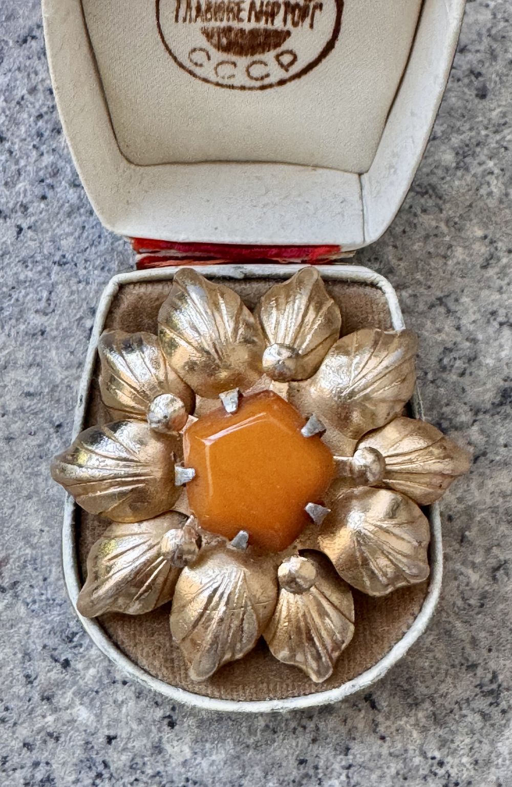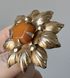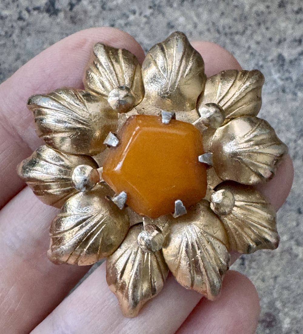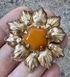 Брошь с основой из алюминия с позолотой и вставкой из янтаря (на вставке сбоку есть небольшой скольчик). Судя по отметке (БЮ8) брошь сделана в 1968г. в Баку. Диаметр броши 4,5см., диаметр вставки 1,4см. Общее состояние хорошее.