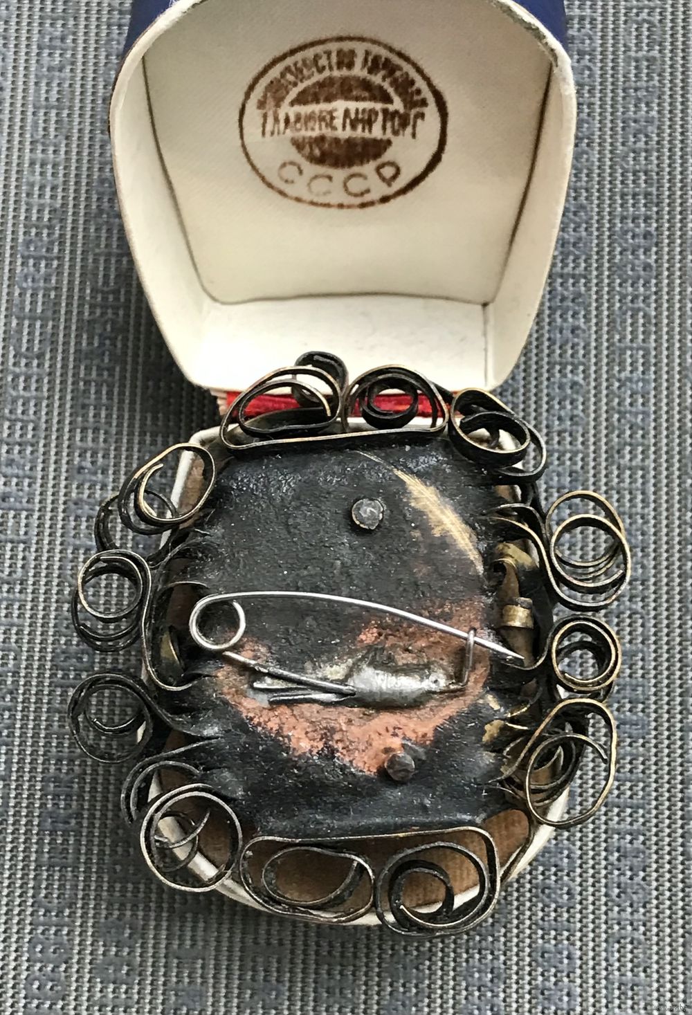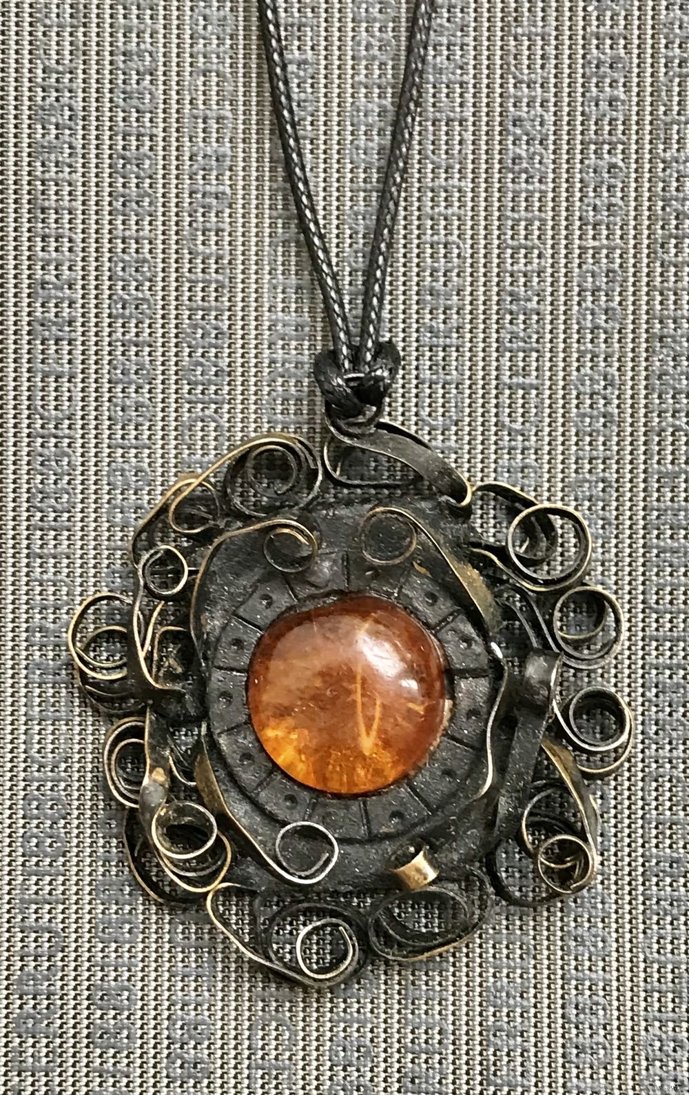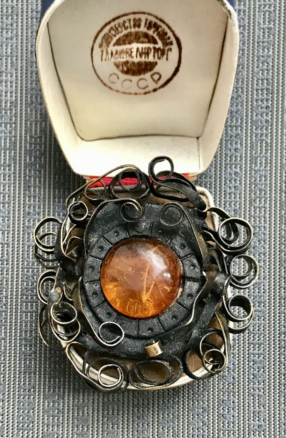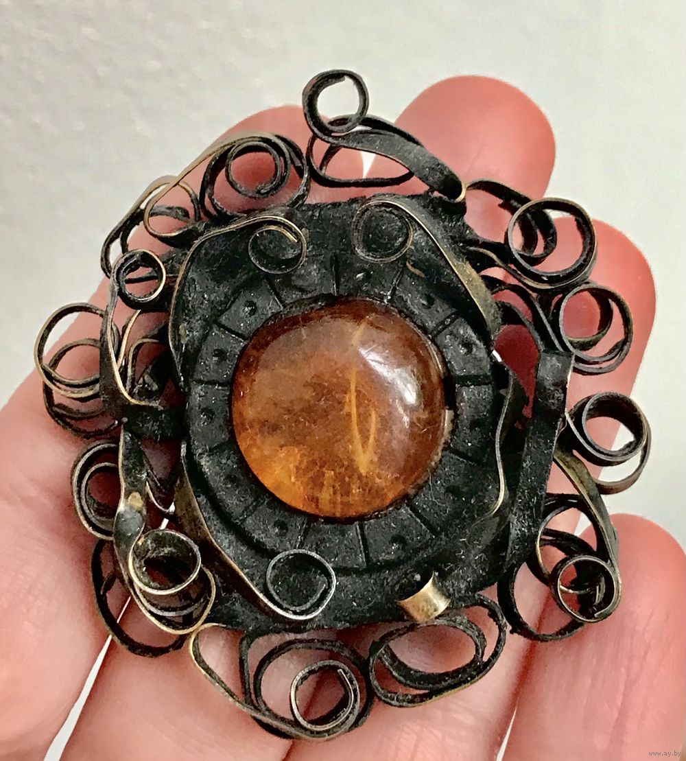 Винтажная брошь с основой из меди и вставкой из янтаря. Ручная работа. Диаметр броши 5см., диаметр вставки 1,7см. Можно носить как кулон.