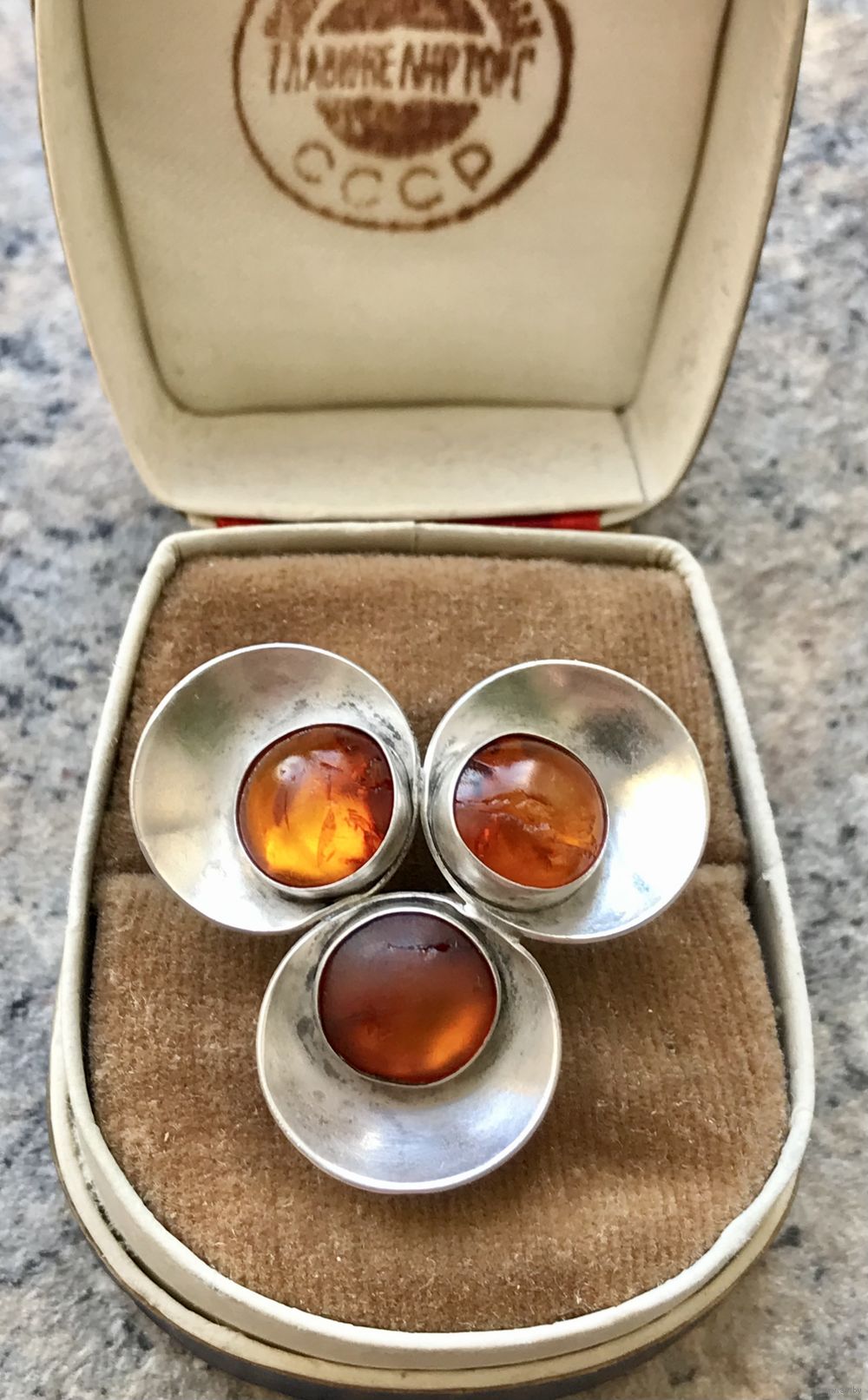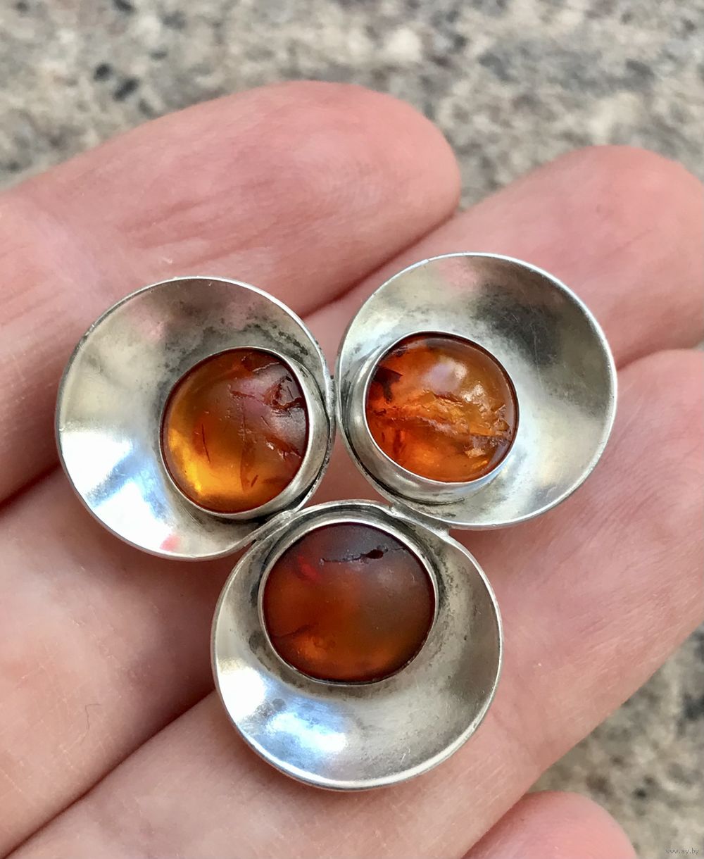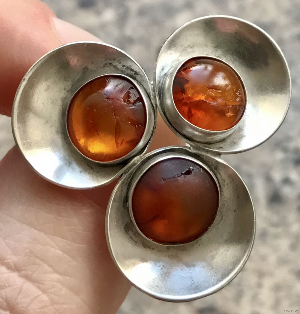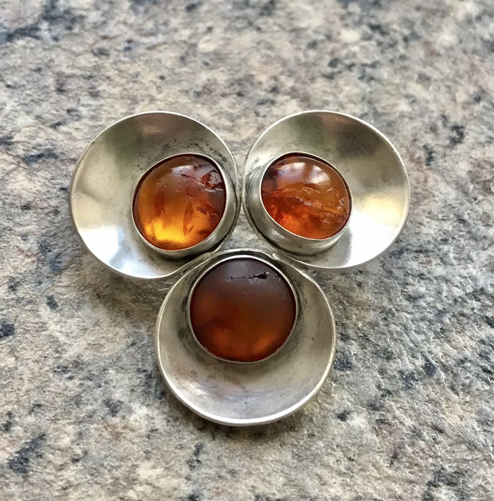 Брошь с основой из серебра 925пр. и вставок из янтаря. Сделана в 60-е гг. в Дании компанией Niels Erik From. Размер 3х3х3см., диаметр вставок 0,8см. (на вставках трещины), фиксатор на застёжке немного ослаблен, но держит. Все нюансы учтены в цене.