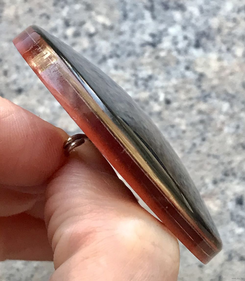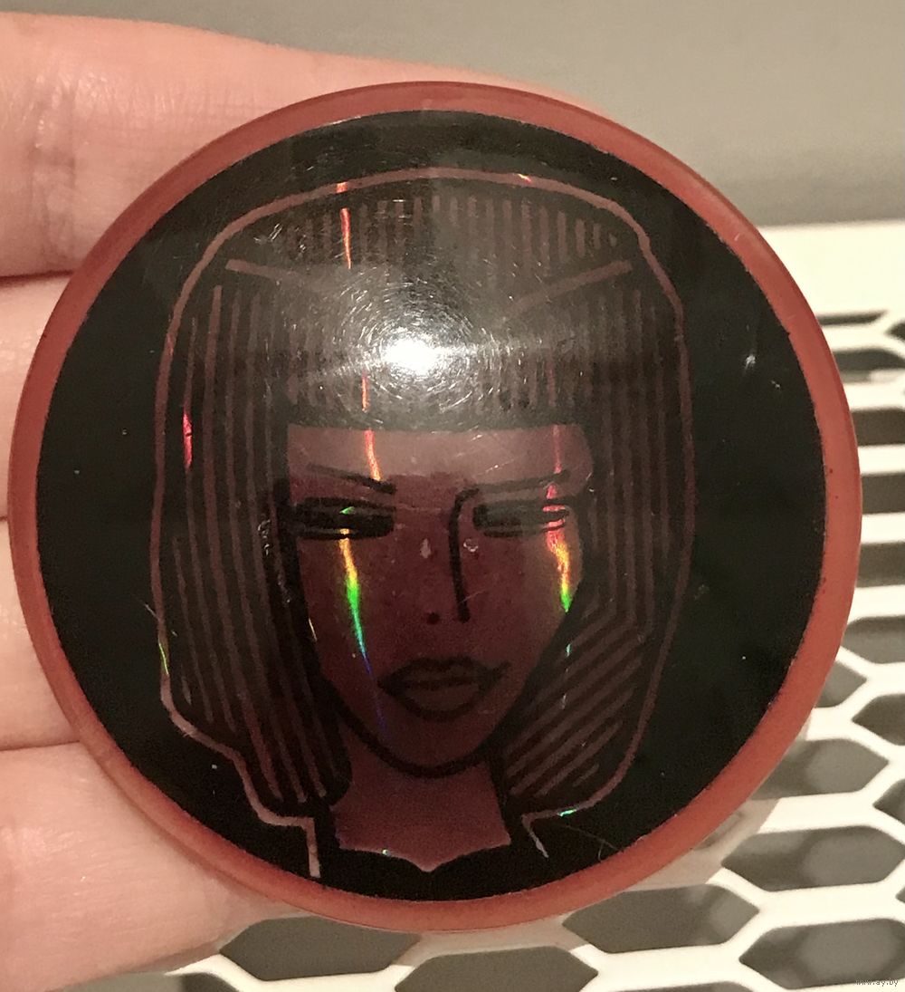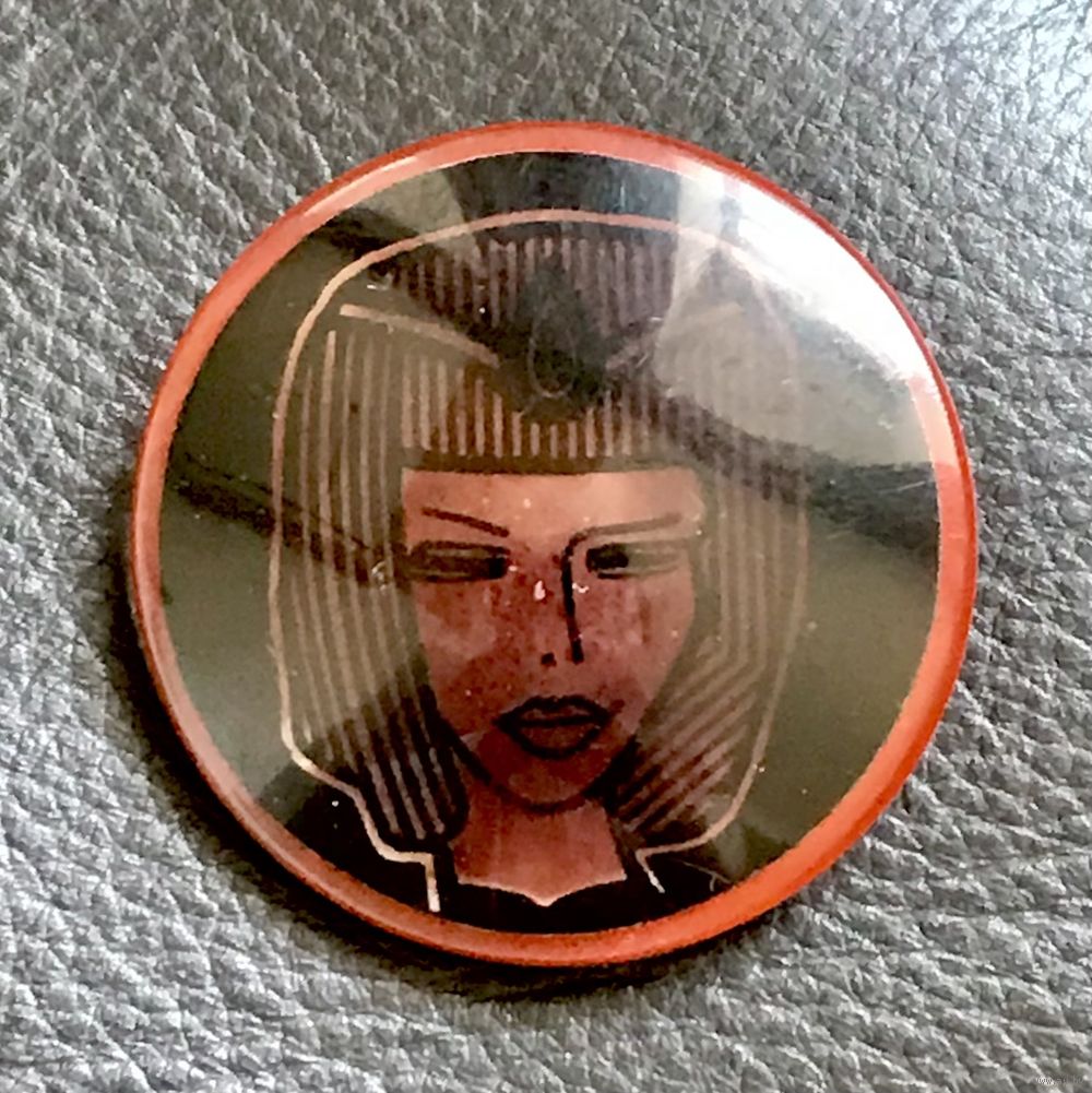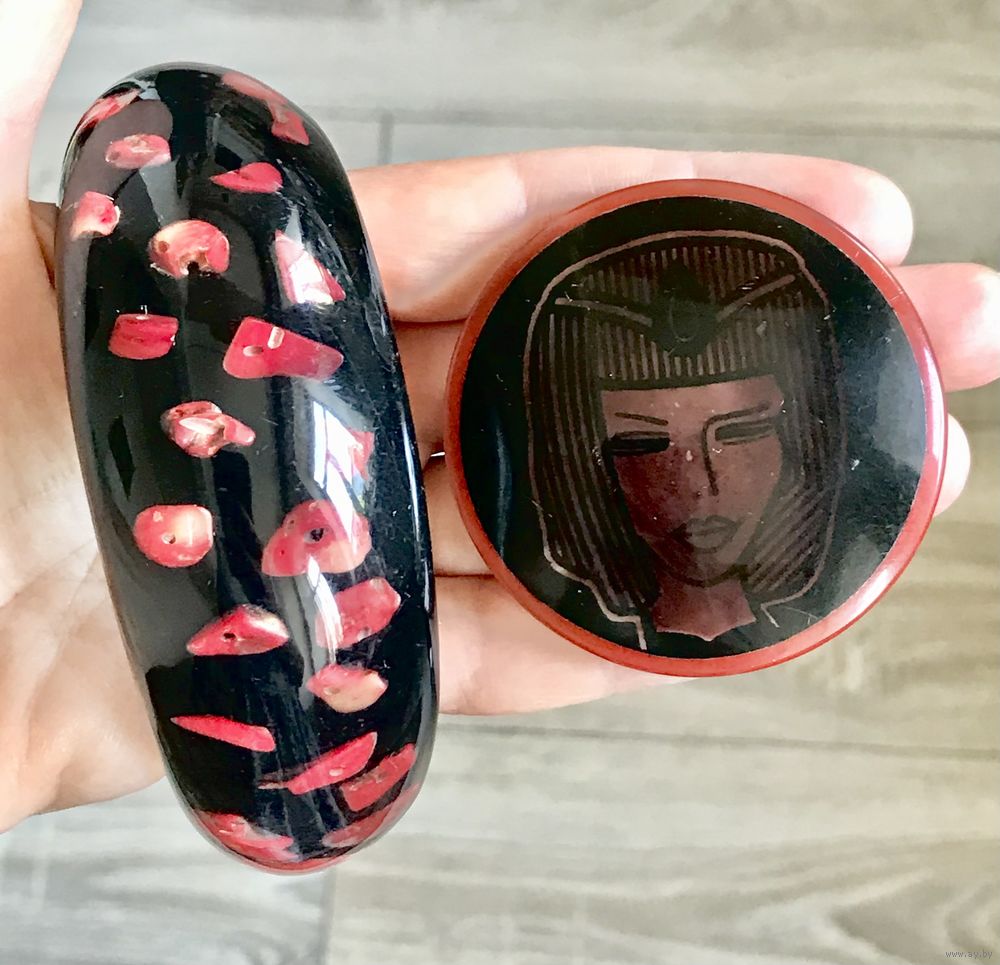 Крупная брошь из галалита с изображением Клеопатры. Франция 1970-е гг. Диаметр броши 5,8см. На лицевой стороне имеются незначительные царапки. В лотах есть подходящий браслет.
