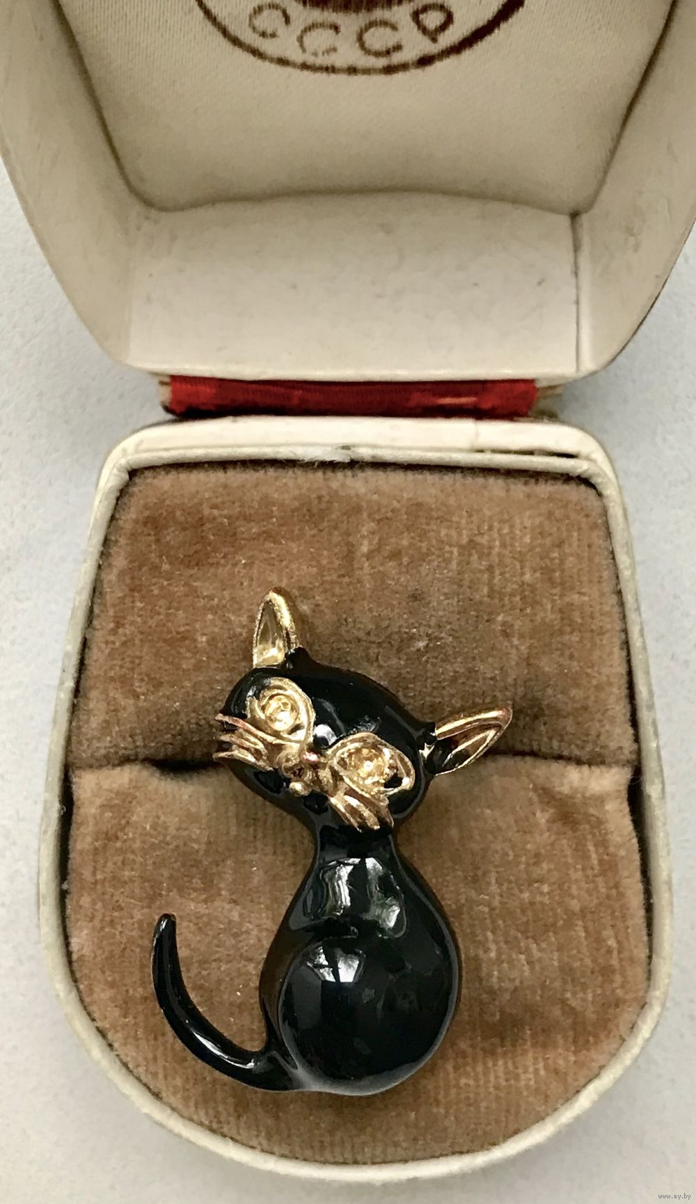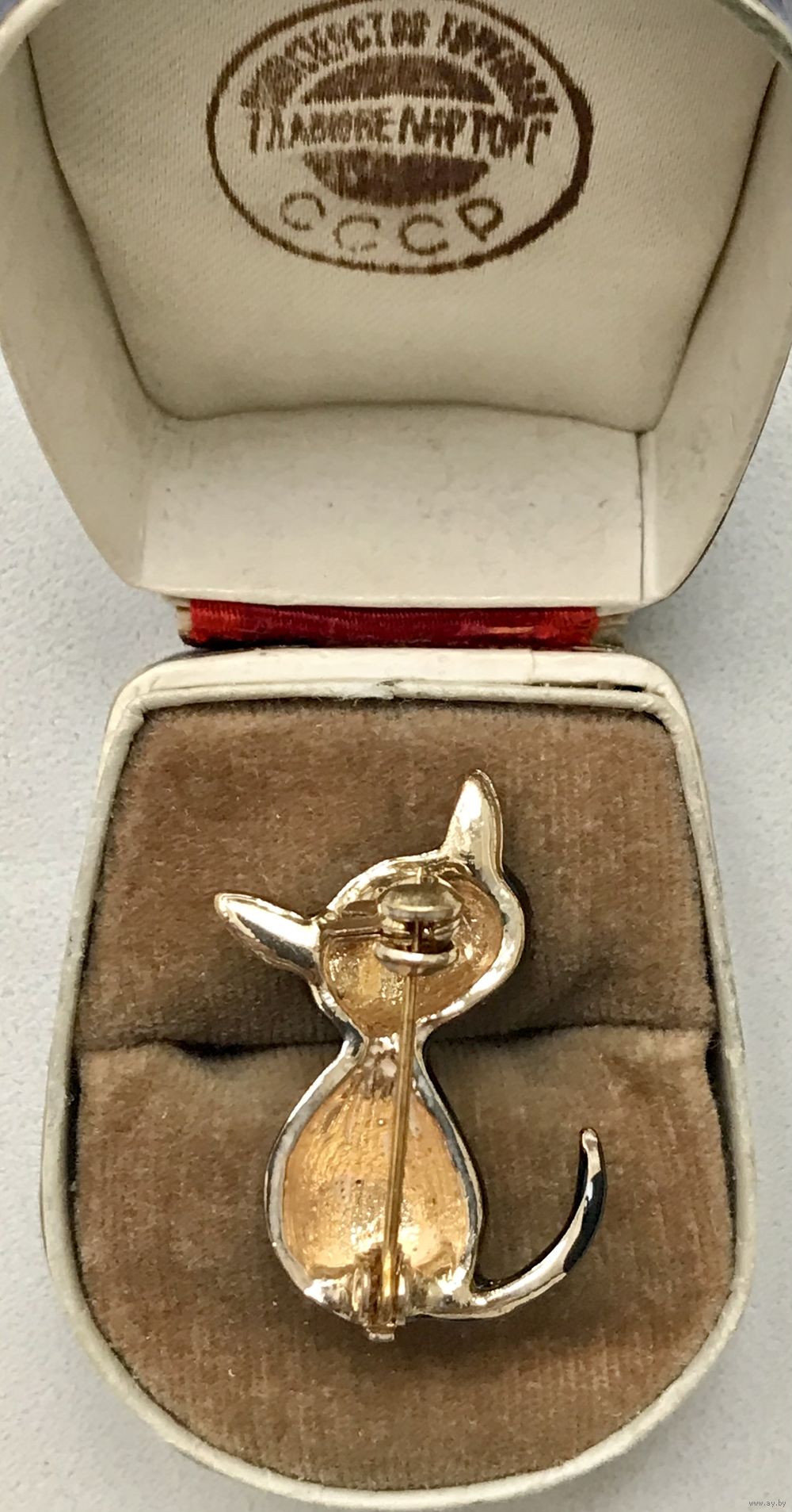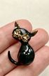 Миниатюрная брошь в виде котика с основой из металла золотого тона, лицевая сторона покрыта эмалью чёрного цвета (на металле есть незначительные потёртости). Высота броши 3 см.