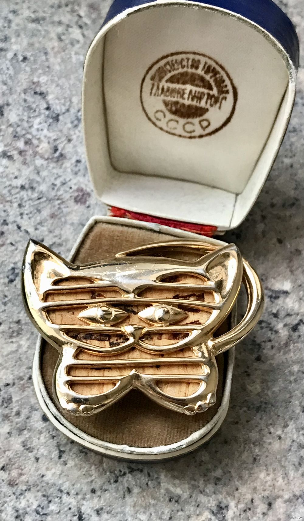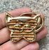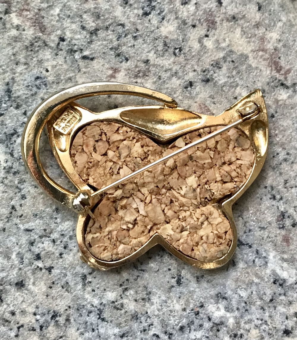 Винтажная брошь из металла золотого тона от французского бренда P&M Paris. Брошь украшена вставкой из пробки. Размер броши 5х4см. Маркирована. Сбоку в одном месте имеется небольшой скол позолоты и потёртости на металле (учтено в цене).