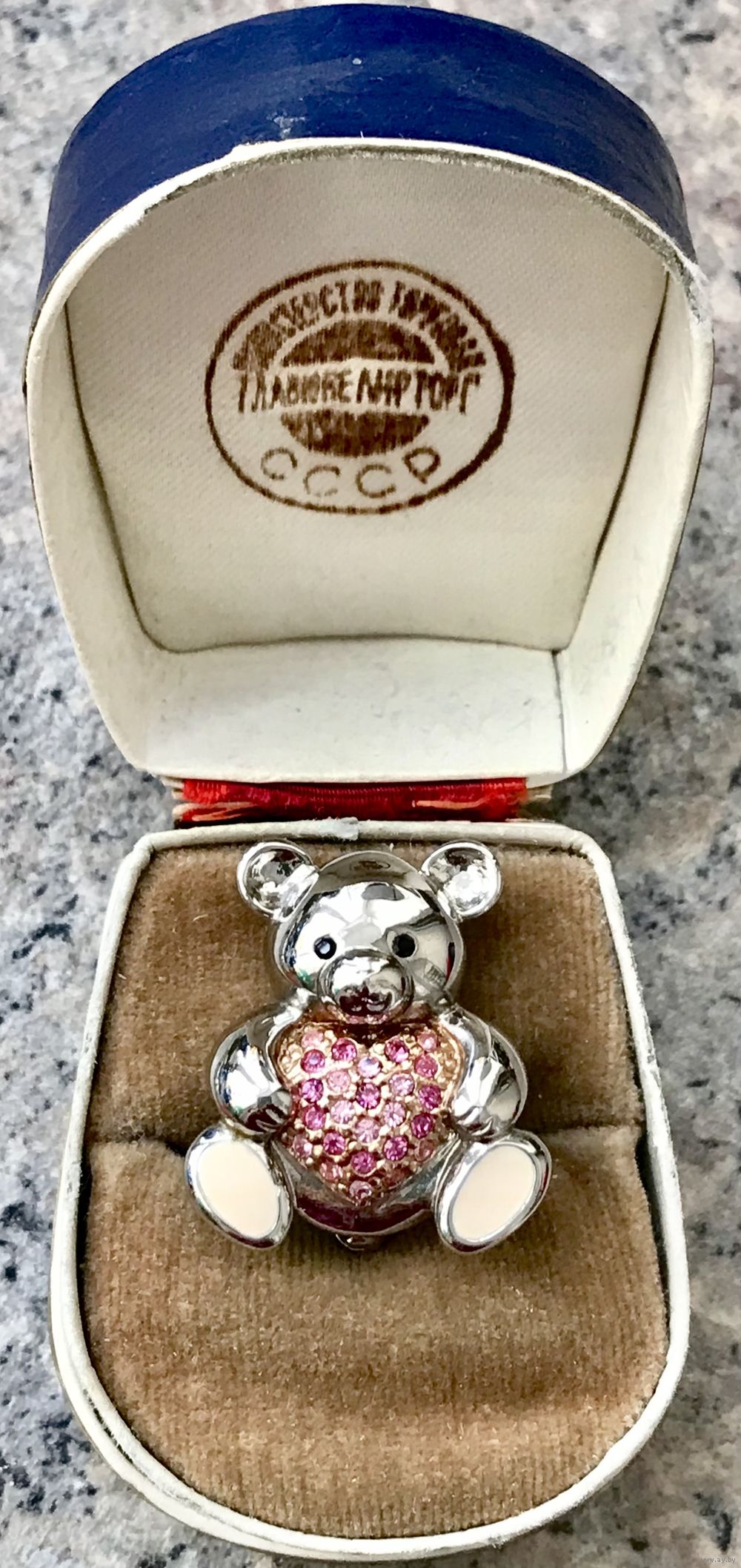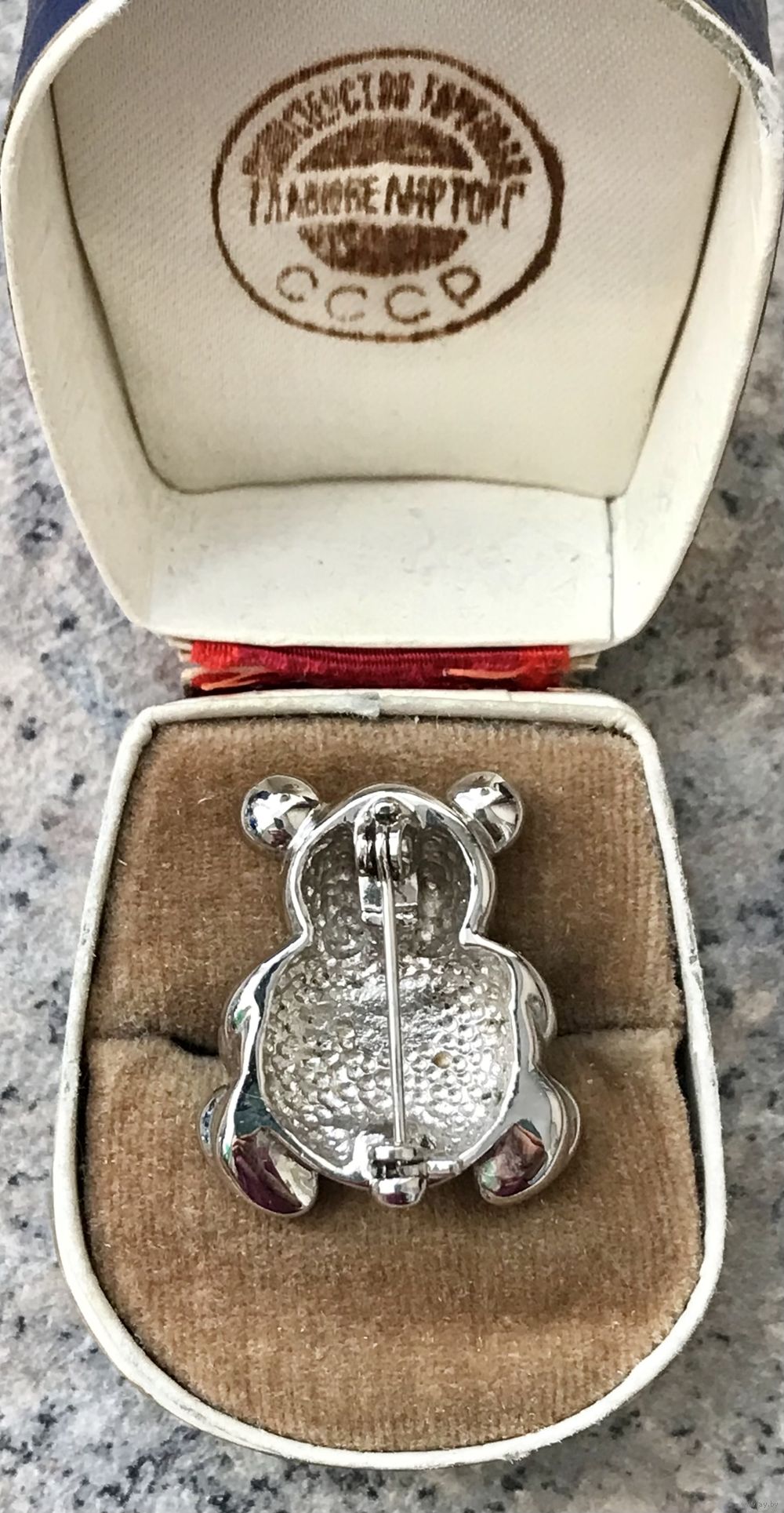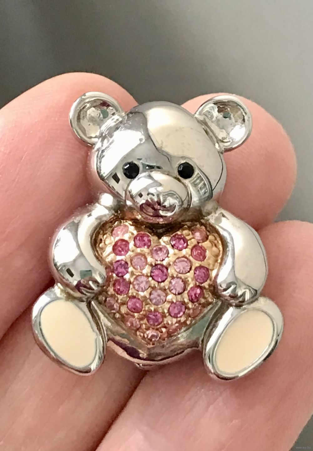 Небольшая брошь в виде медвежонка. Основа сделана из металла серебристого тона, лицевая сторона украшена кристаллами, на лапках эмаль. Размер броши 2,7х2,3см. Тяжёленькая. Состояние хорошее.