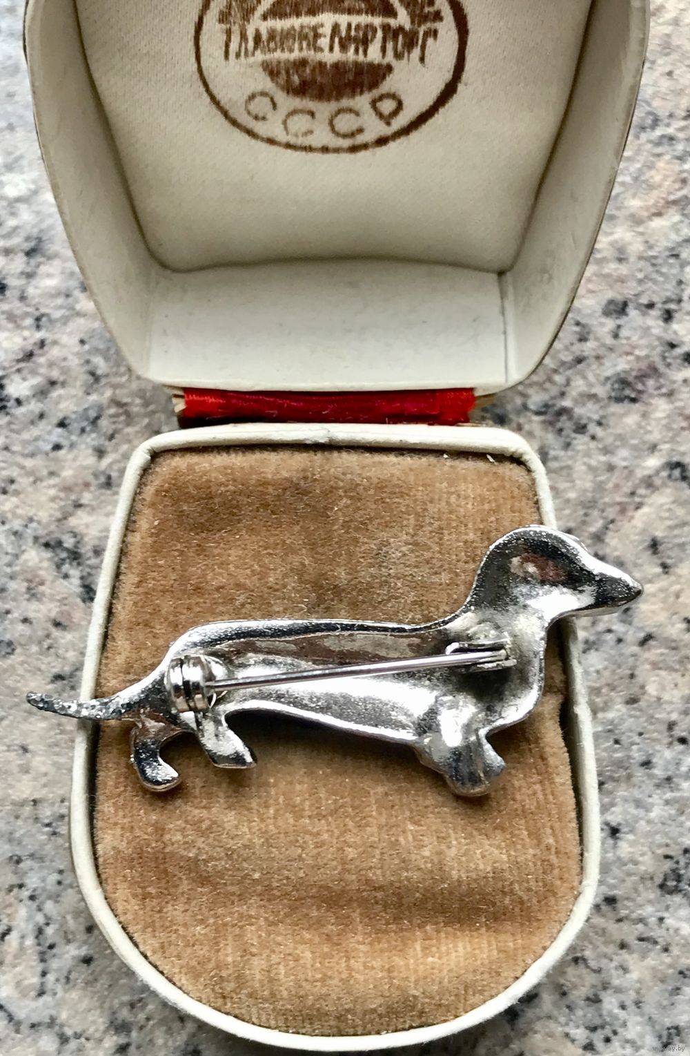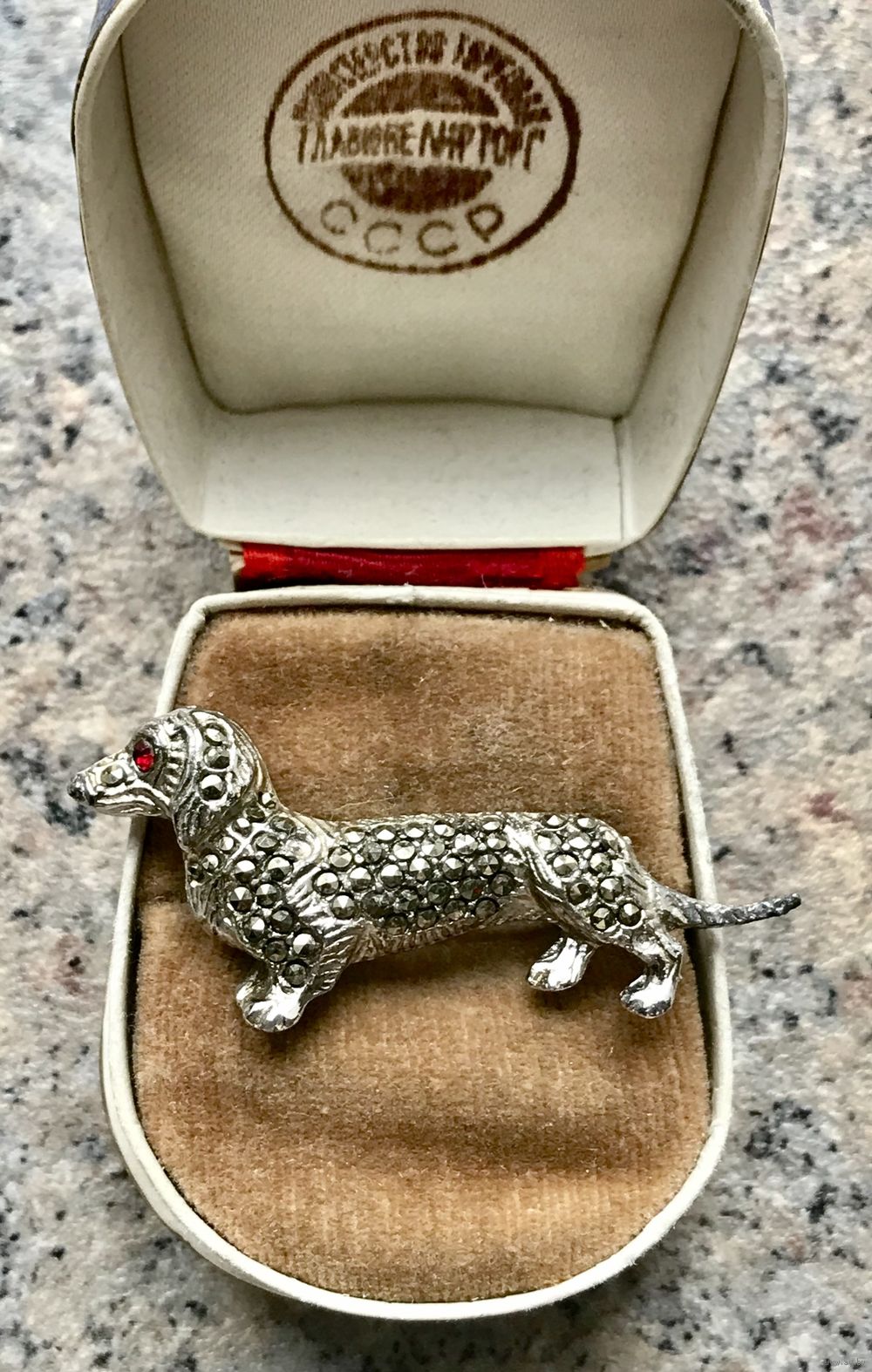 Брошь такса выполнена из металла серебристого тона, вставки марказиты, не хватает 2 шт., в носке не заметно, учтено в цене. Длина таксы 5 см.