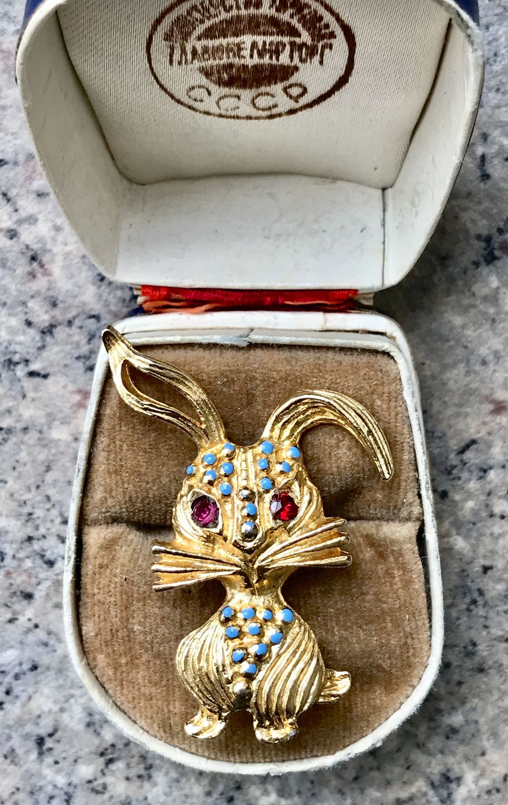 Винтажная брошь с основой из металла золотого тона. На лицевой стороне эмаль и кристаллы. Высота броши 4,3см. На металле незначительные потёртости.