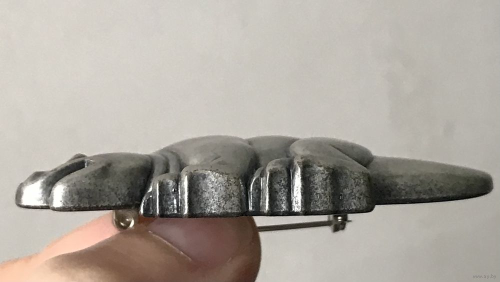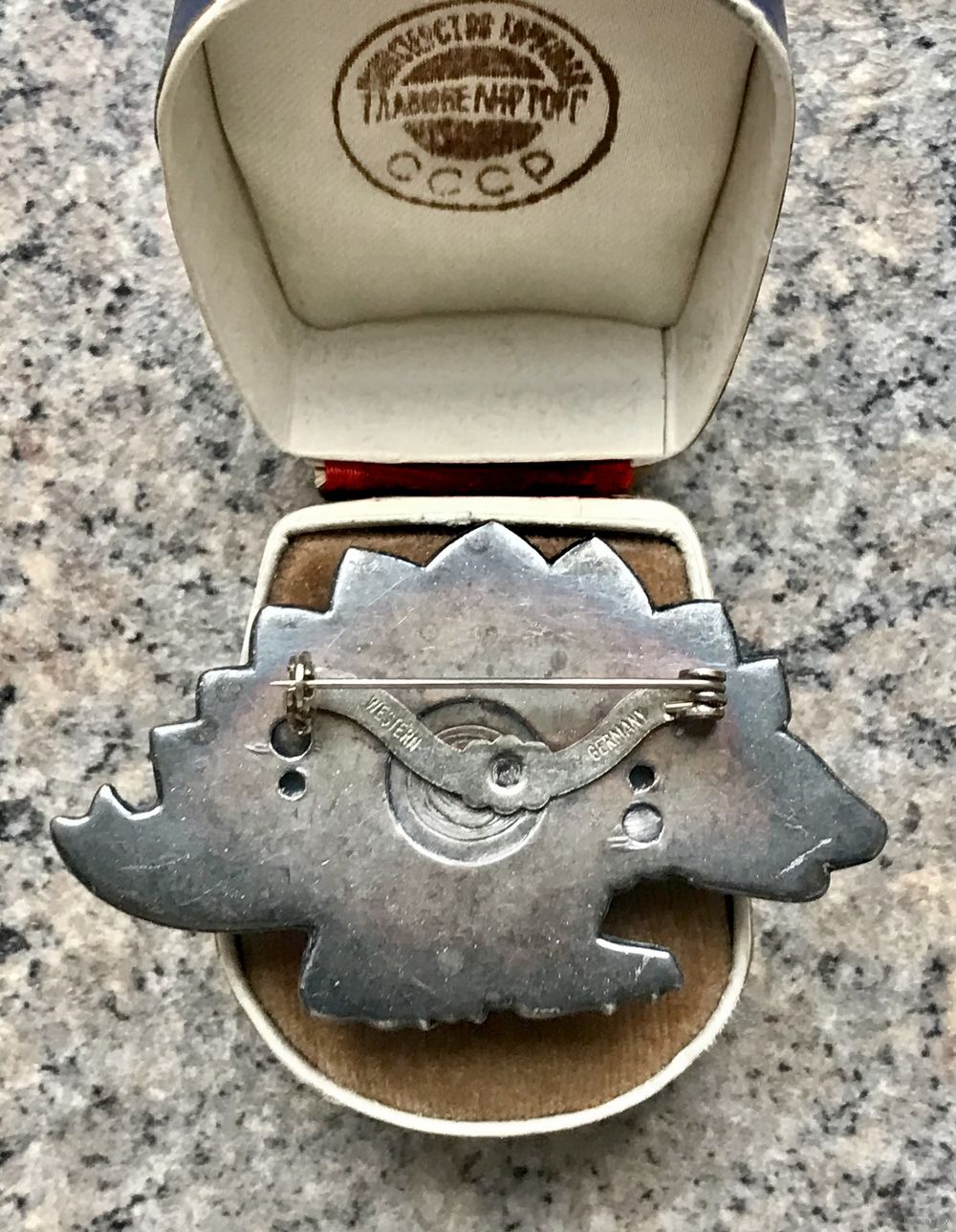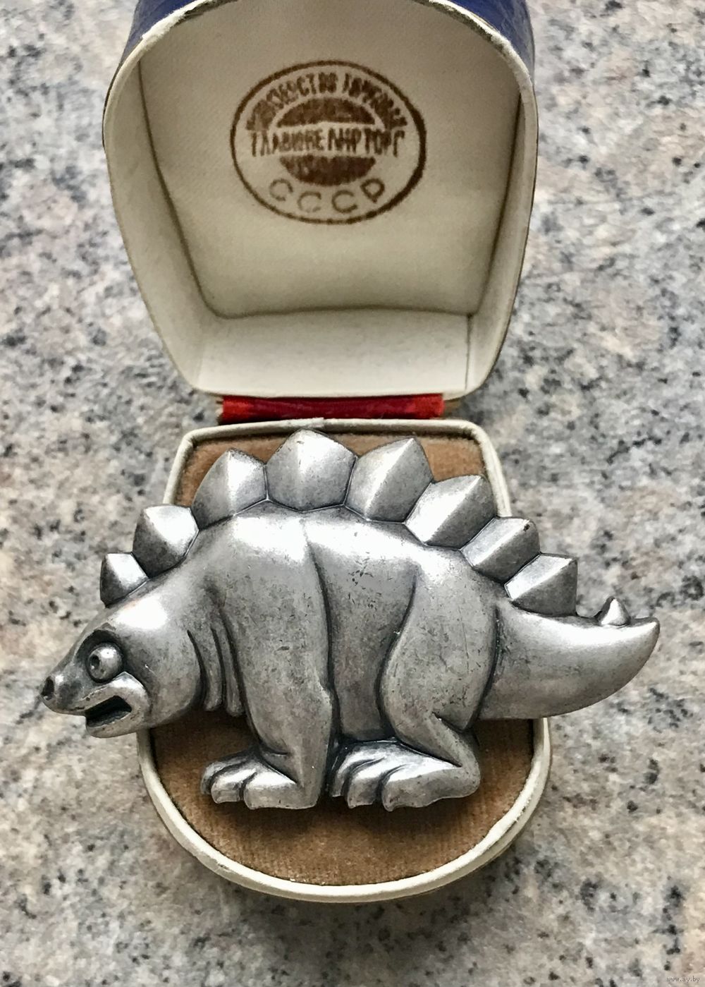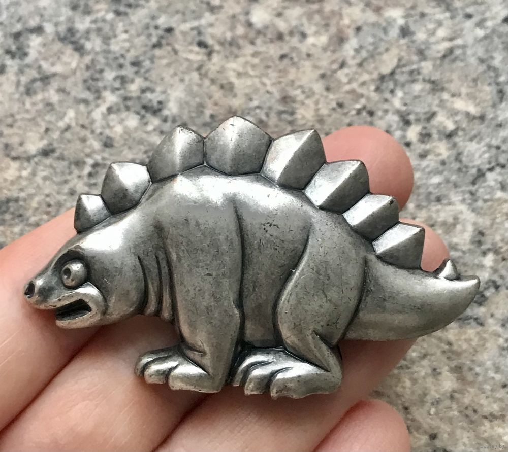Крупная брошь из металла серебристого тона с лёгкой патиной в виде динозаврика. Брошь лёгкая, т.к.внутри полая. На застёжке стоит маркировка Western Germany. Размер динозаврика 6,2х3,5см.