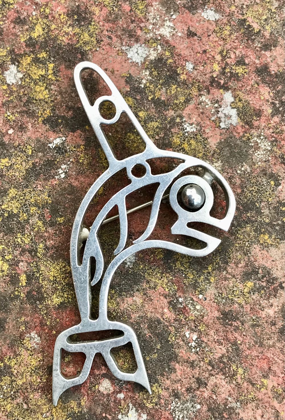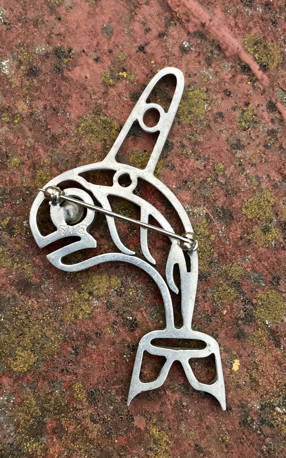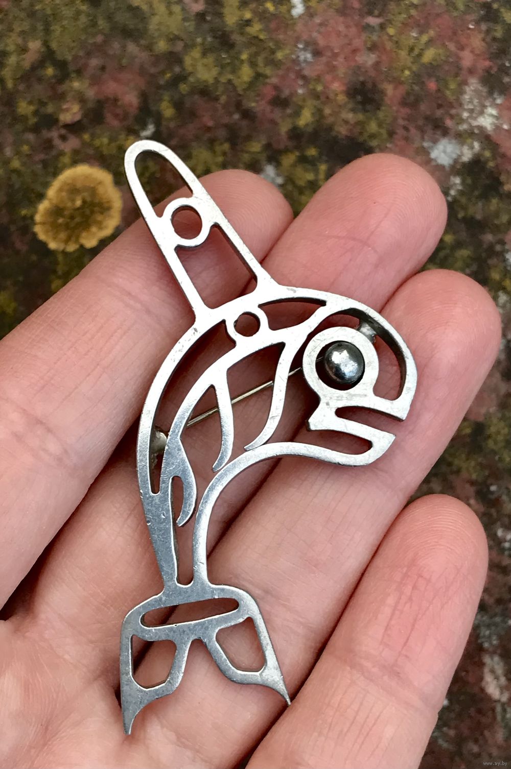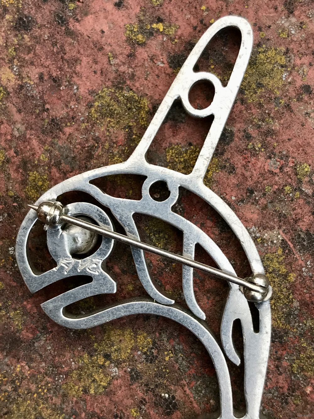 Крупная авторская брошь унисекс из металла с серебрением. Высота 6,5см., на обратной стороне стоят инициалы мастера. Состояние хорошее.
