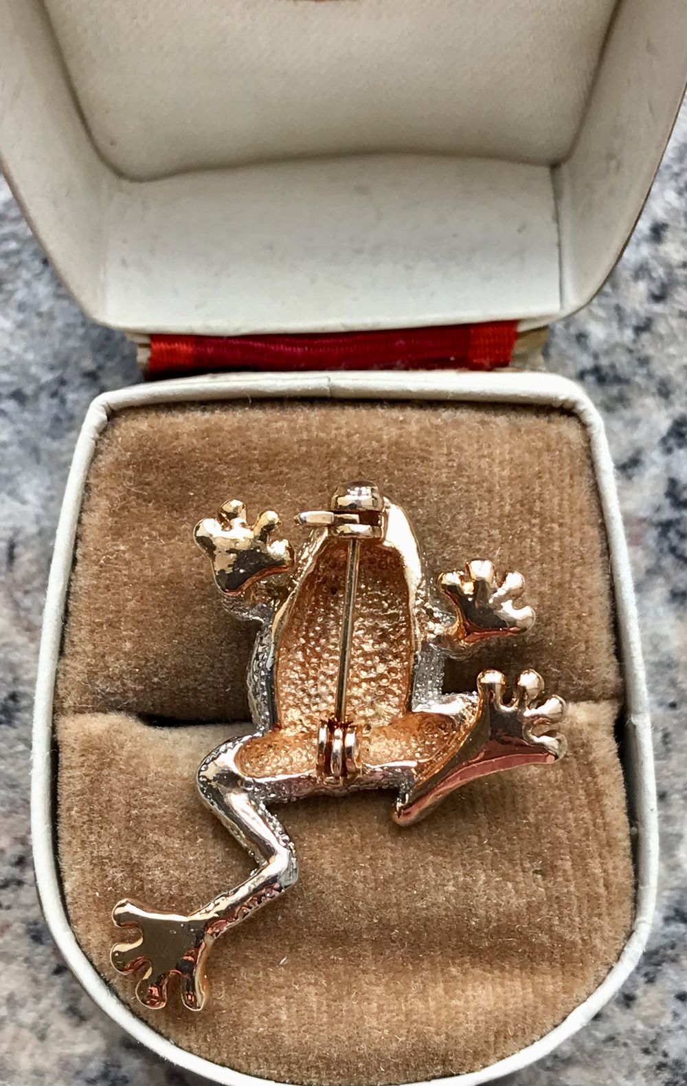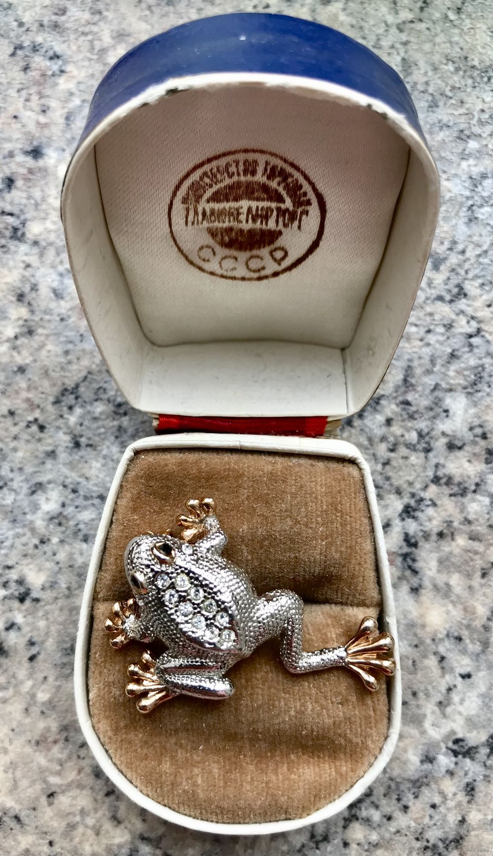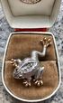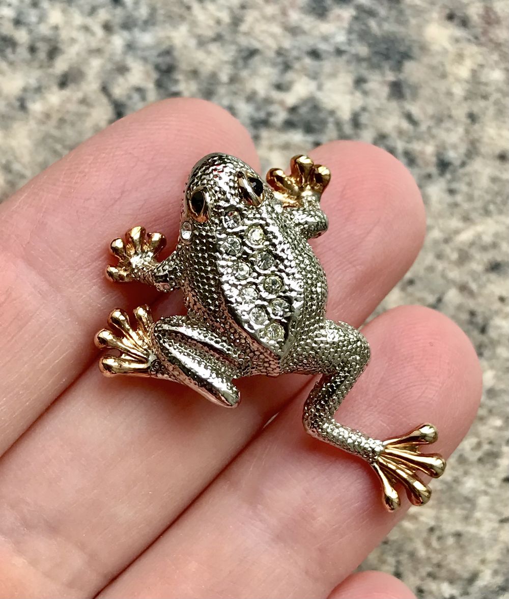 Небольшая брошь в виде лягушки выполнена из металла двух тонов, вставки- кристаллы, высота броши 3,5 см., состояние хорошее.