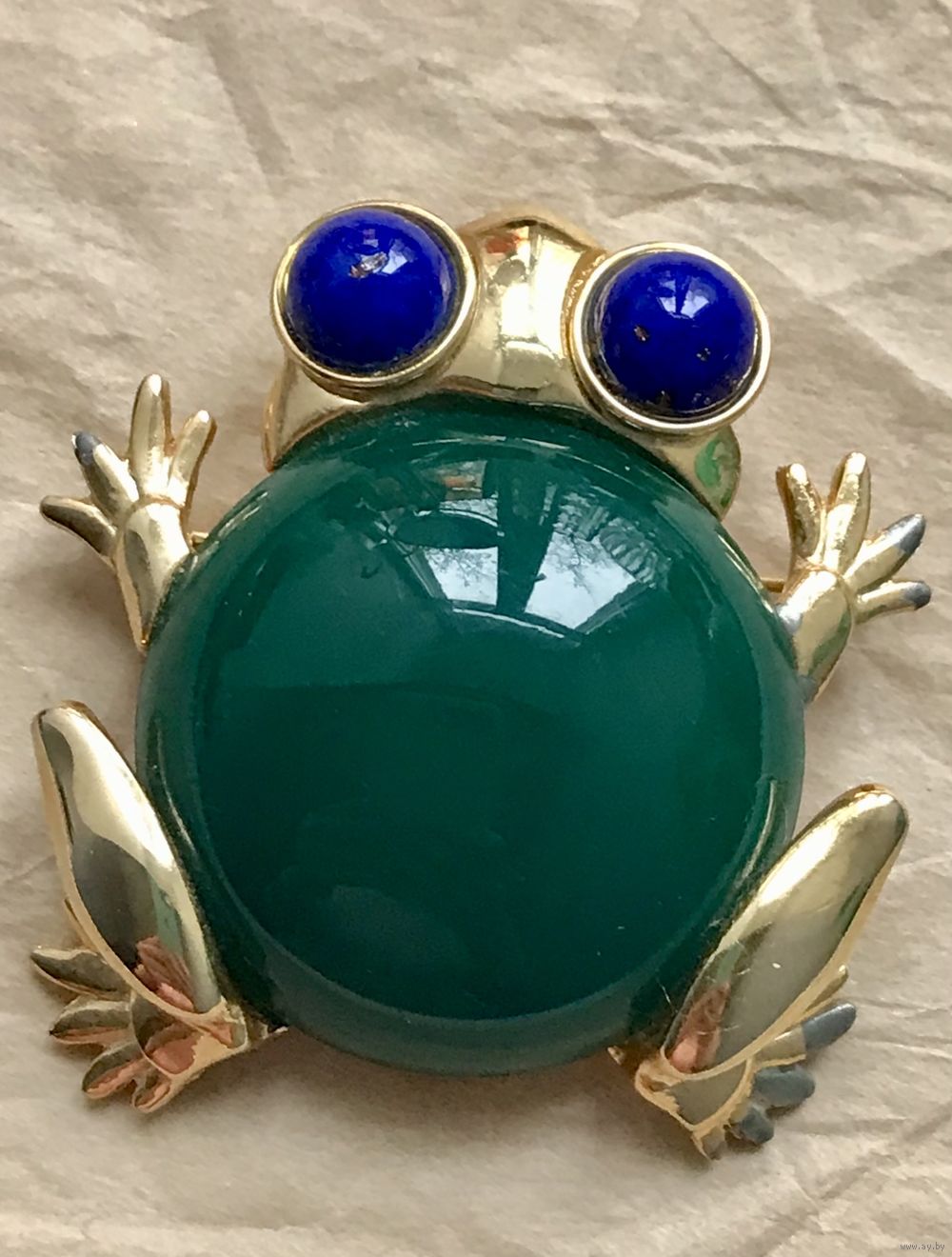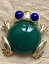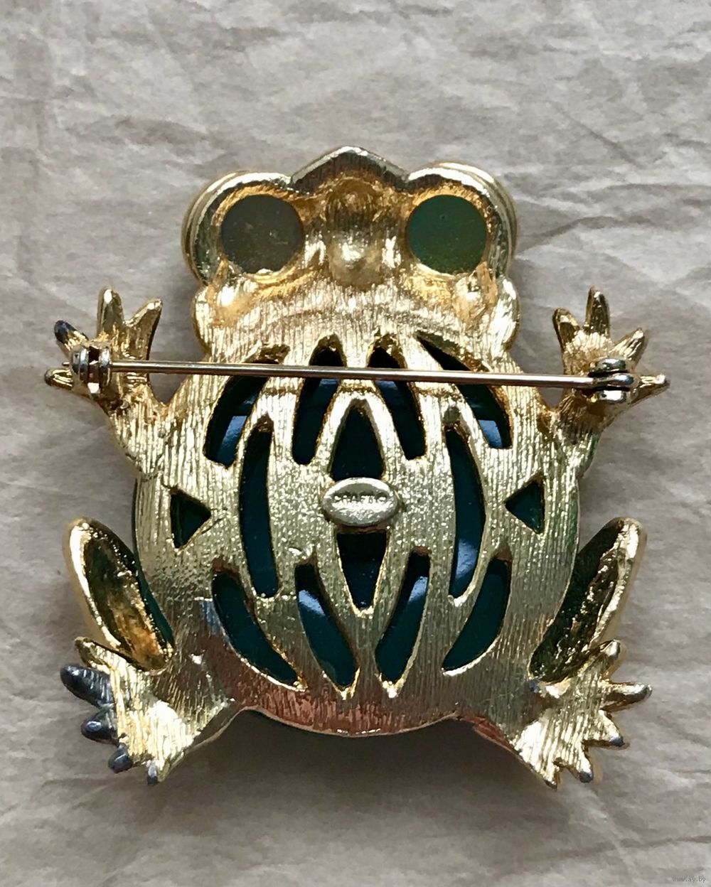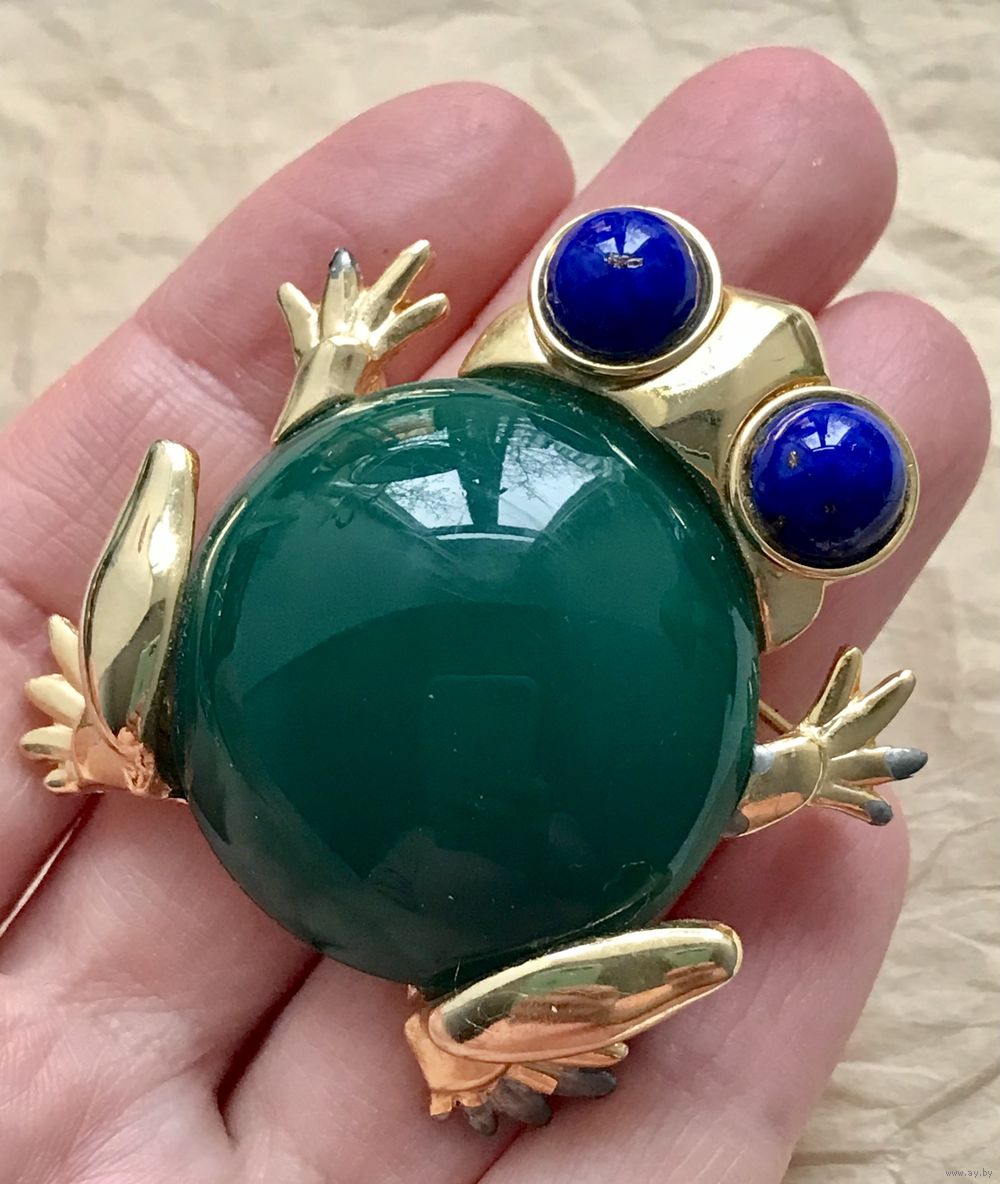 Крупная винтажная брошь от известного американского производителя бижутерии компании Craft. Украшение выполнено из сплава золотого тона (на лицевой стороне в нескольких местах на лапках имеется сход позолоты), вставка изумрудного цвета из плотного пластика, глаза из художественного стекла под лазурит. Размер броши 5х4,7см. Маркирована.