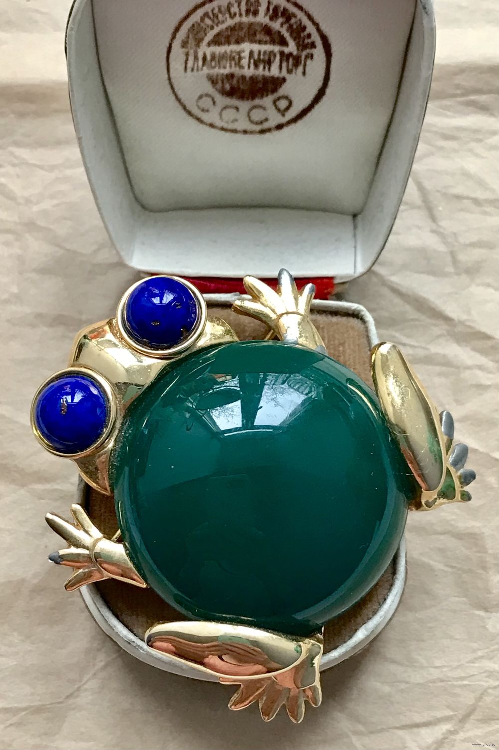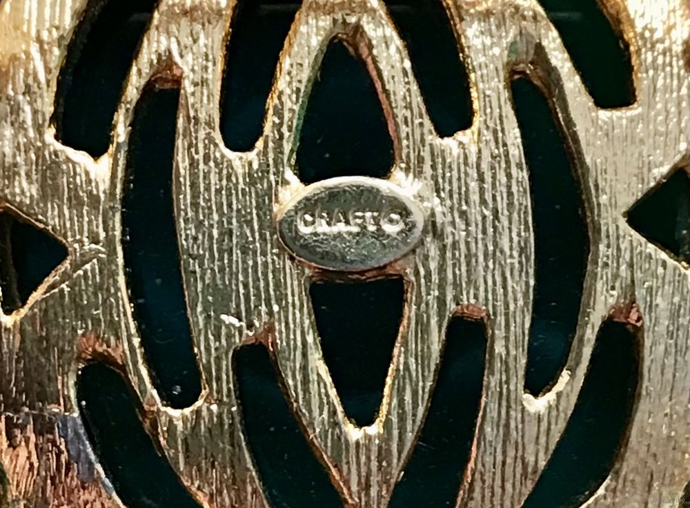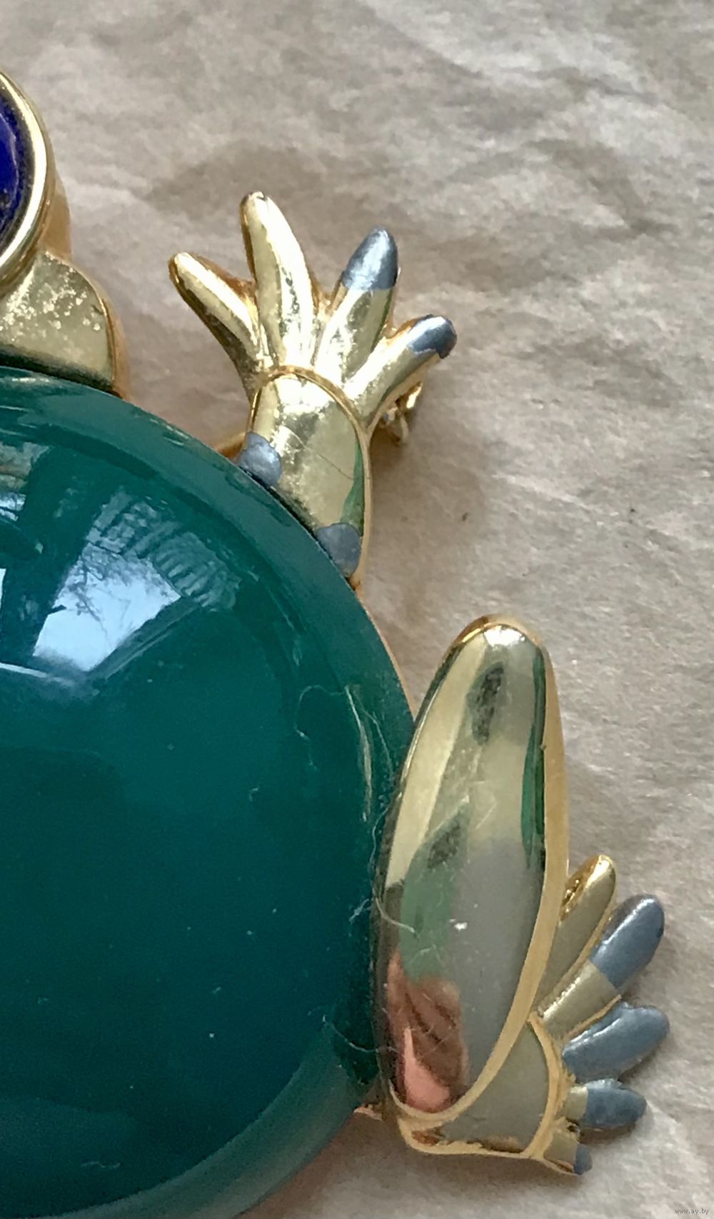 Крупная винтажная брошь от известного американского производителя бижутерии компании Craft. Украшение выполнено из сплава золотого тона (на лицевой стороне в нескольких местах на лапках имеется сход позолоты), вставка изумрудного цвета из плотного пластика, глаза из художественного стекла под лазурит. Размер броши 5х4,7см. Маркирована.