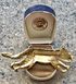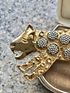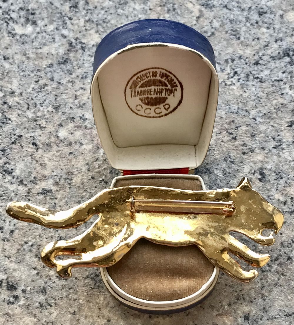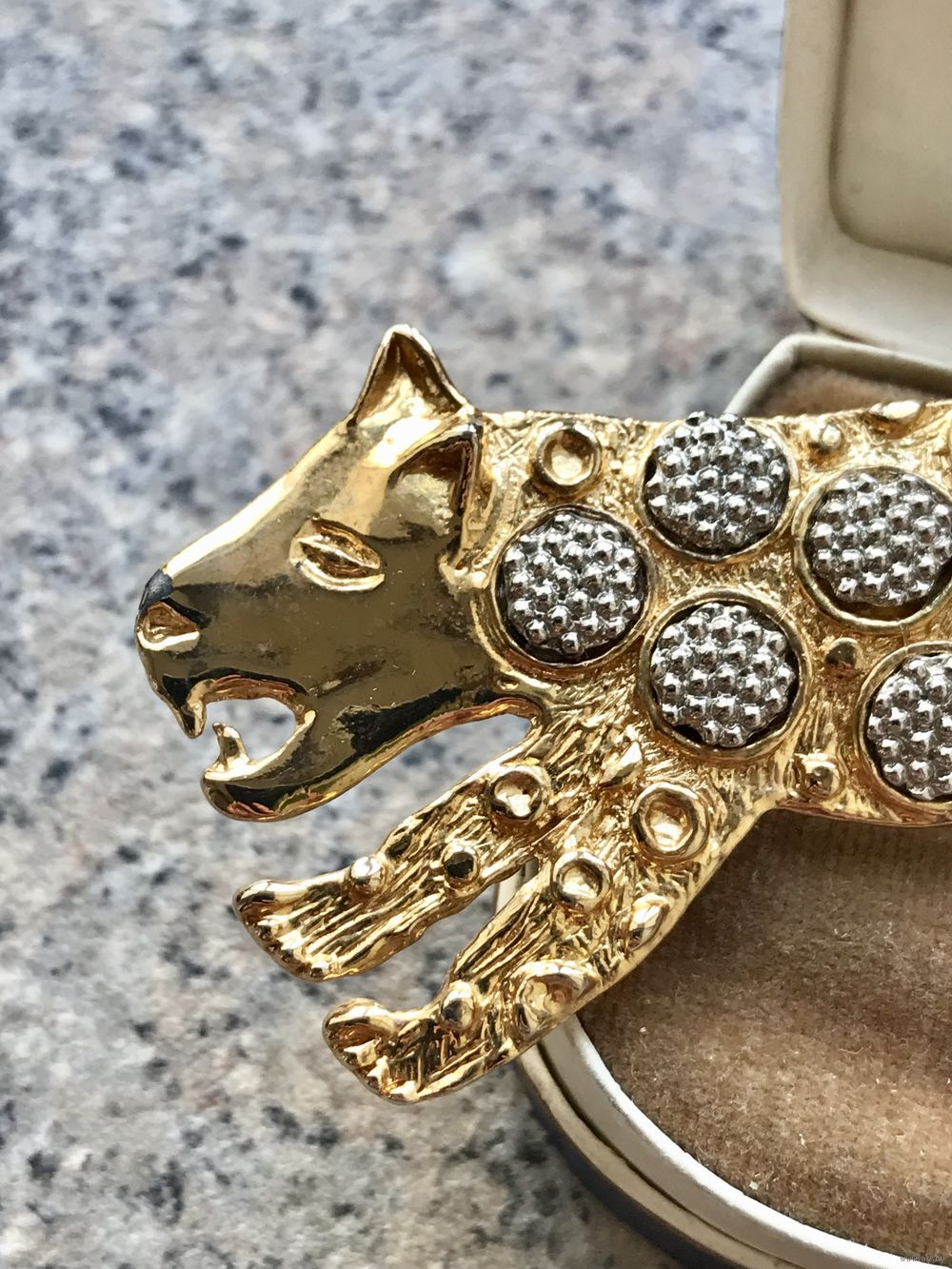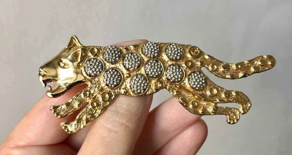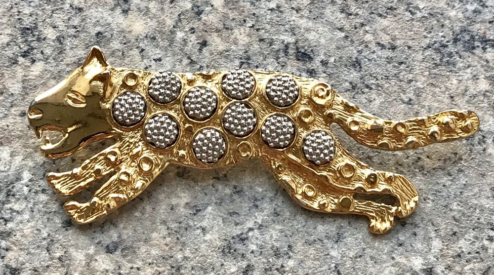 Крупная брошь с основой из металла золотого тона, на лицевой стороне элементы из металла серебристого тона. Длина броши 9,5см. На носу гепарда есть небольшой скол золотистого покрытия (учтено в цене).