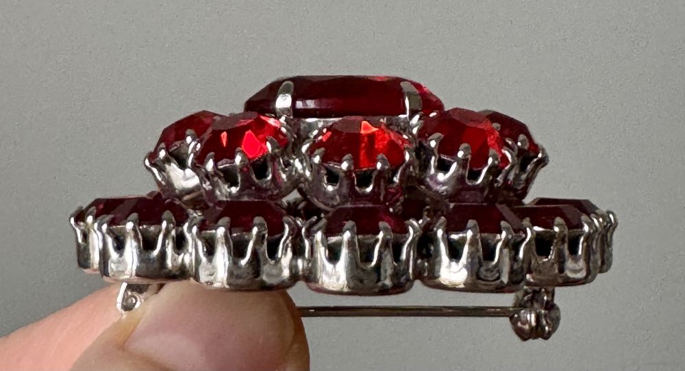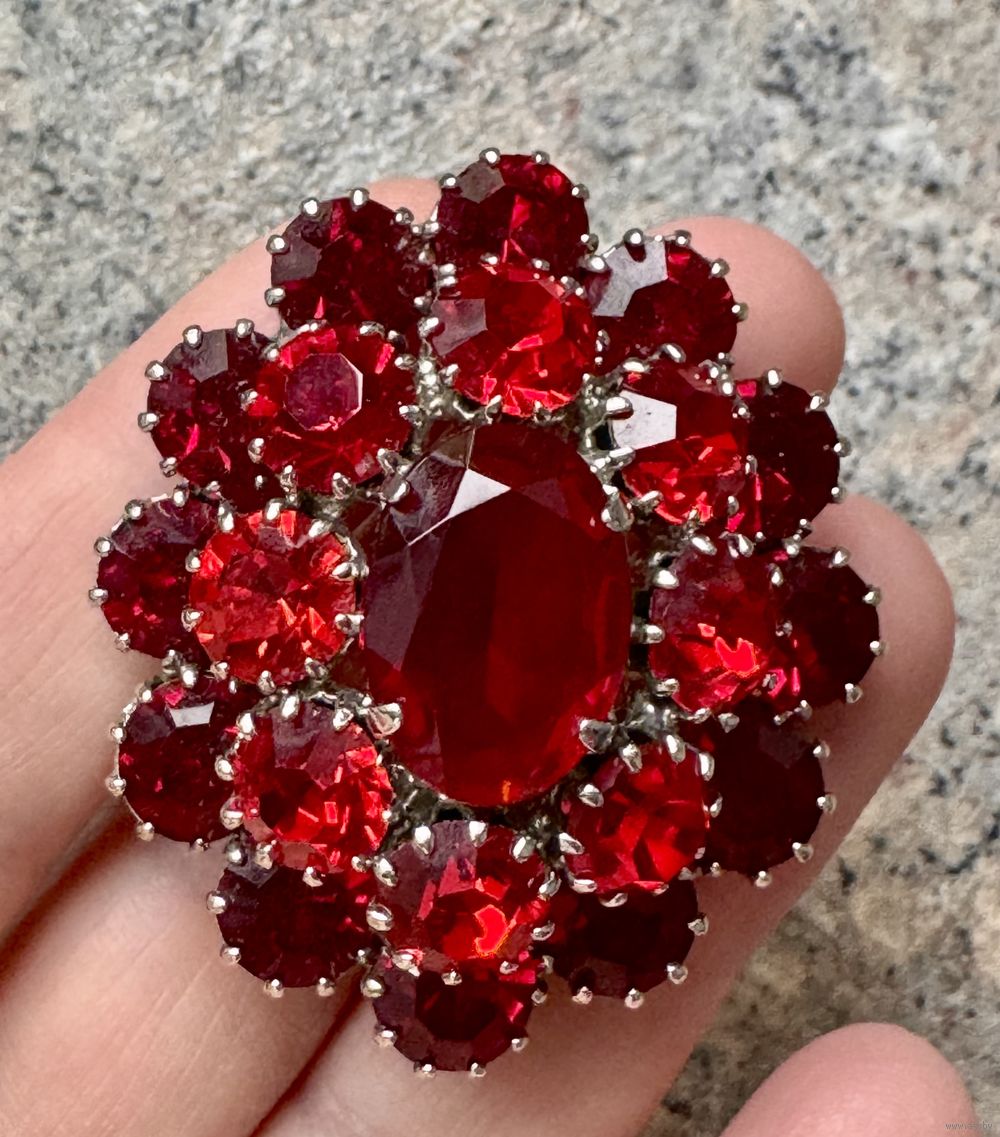Крупная винтажная чешская трехуровневая брошь с основой из латуни с серебрением, вставки из стекла рубинового цвета. Размер 4,5х4см., высота 1,5см. Состояние хорошее.