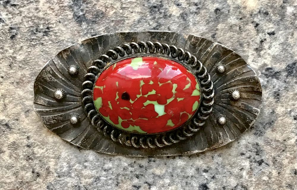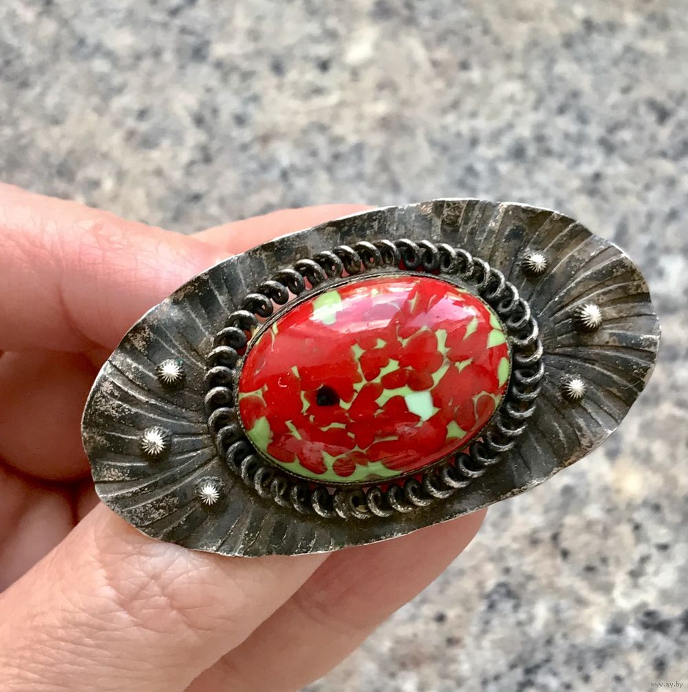 Винтажная брошь с основой из металла серебристого тона и вставки из художественного стекла. Размер броши 5,5х3см., размер вставки 2,3х1,6см. Состояние хорошее.