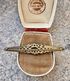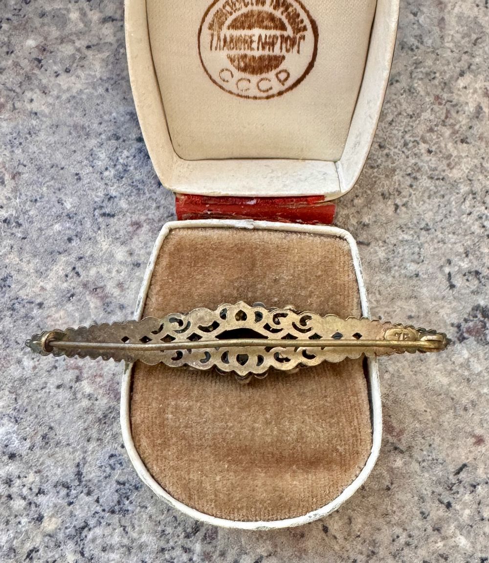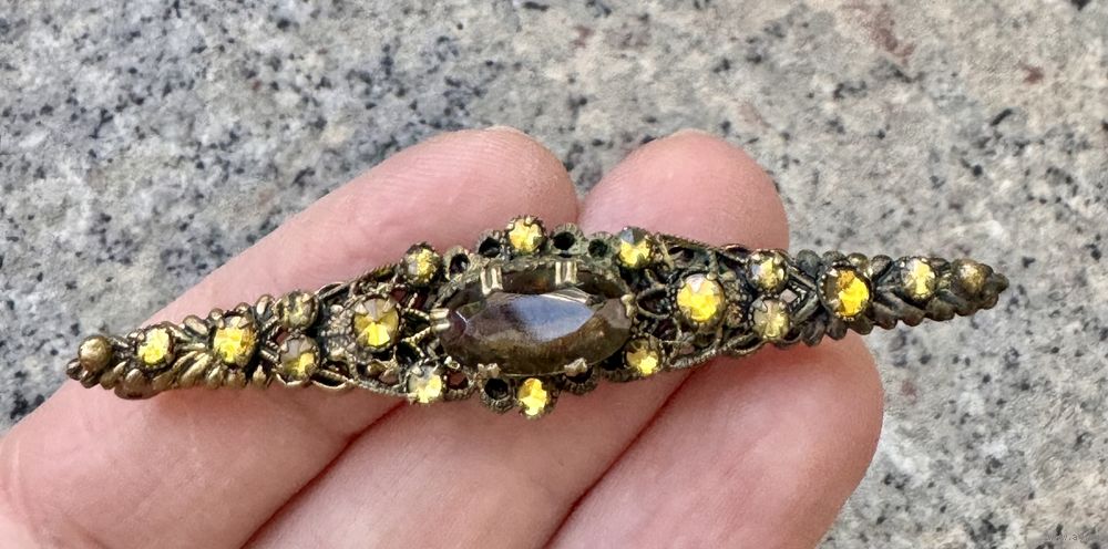 Антикварная брошь (30-50-е гг.) с основой из латуни, вставки из цветного стекла. С обратной стороны стоит цифра 75. Размер броши 6,5х1,3см. Состояние хорошее.