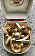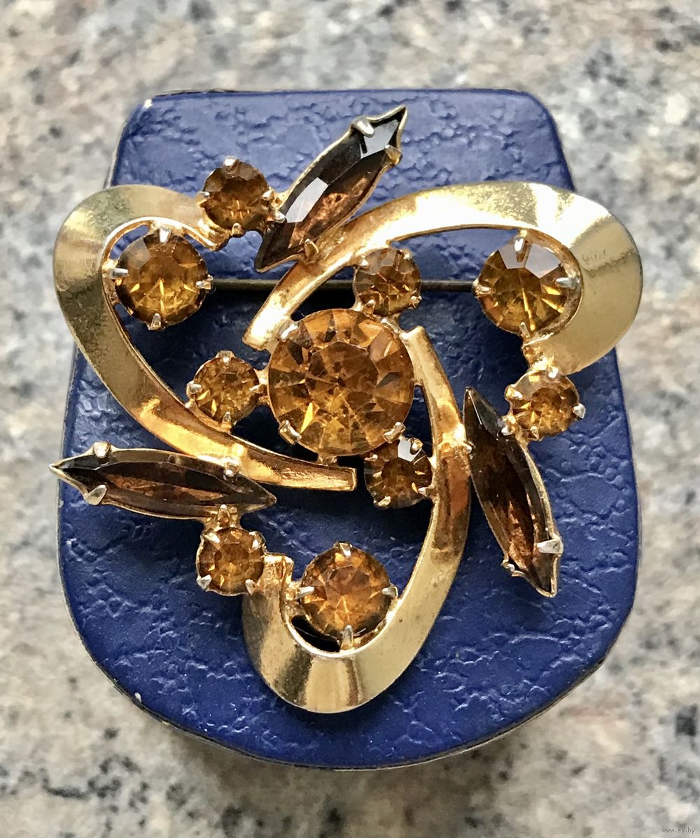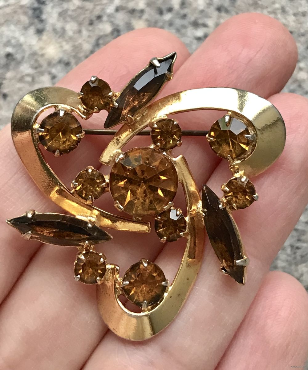 Винтажная чешская брошь с основой из латуни с позолотой и вставками из цветного стекла. Размер броши 4х4х4см., на металле местами есть незначительные потёртости позолоты. Общее состояние украшения хорошее.