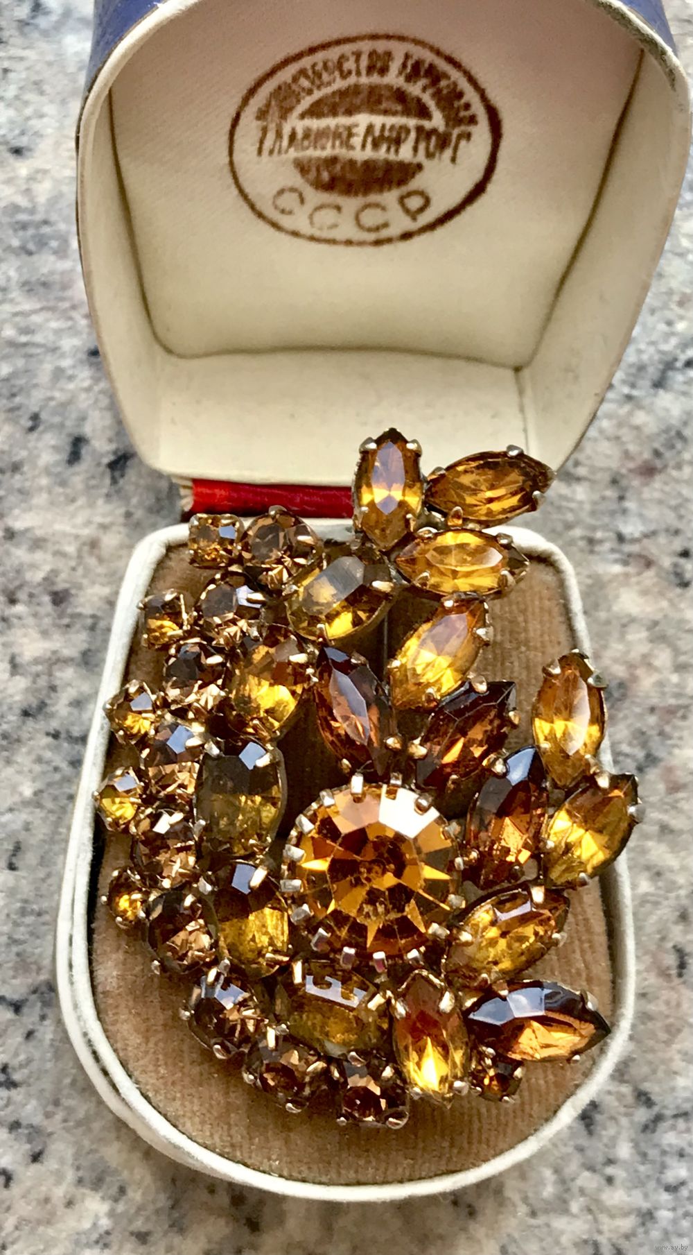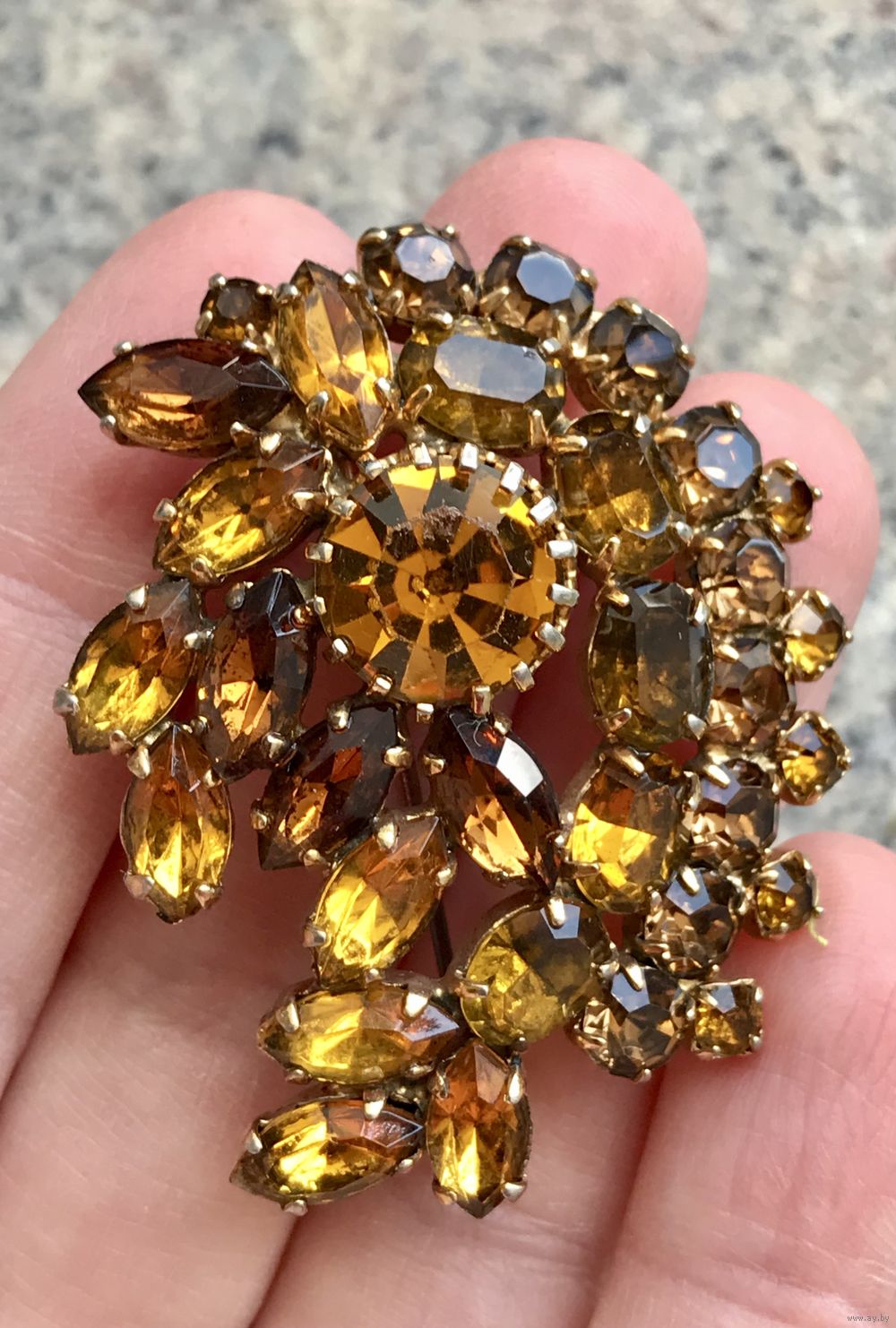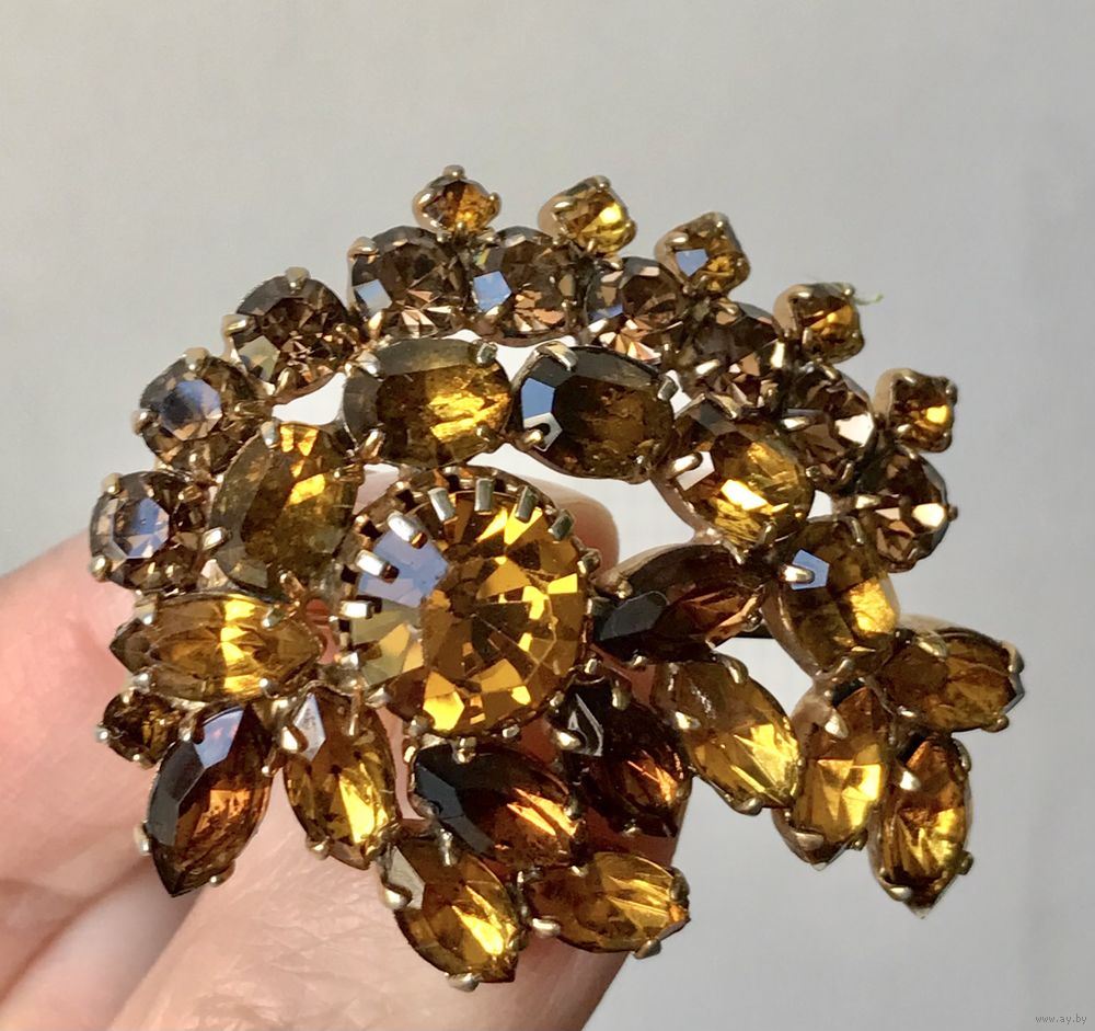 Винтажная чешская брошь с основой из латуни и вставок из цветного стекла, на центральной вставке небольшой скольчик (учтено в цене). Размер броши 4,5х3,5см.