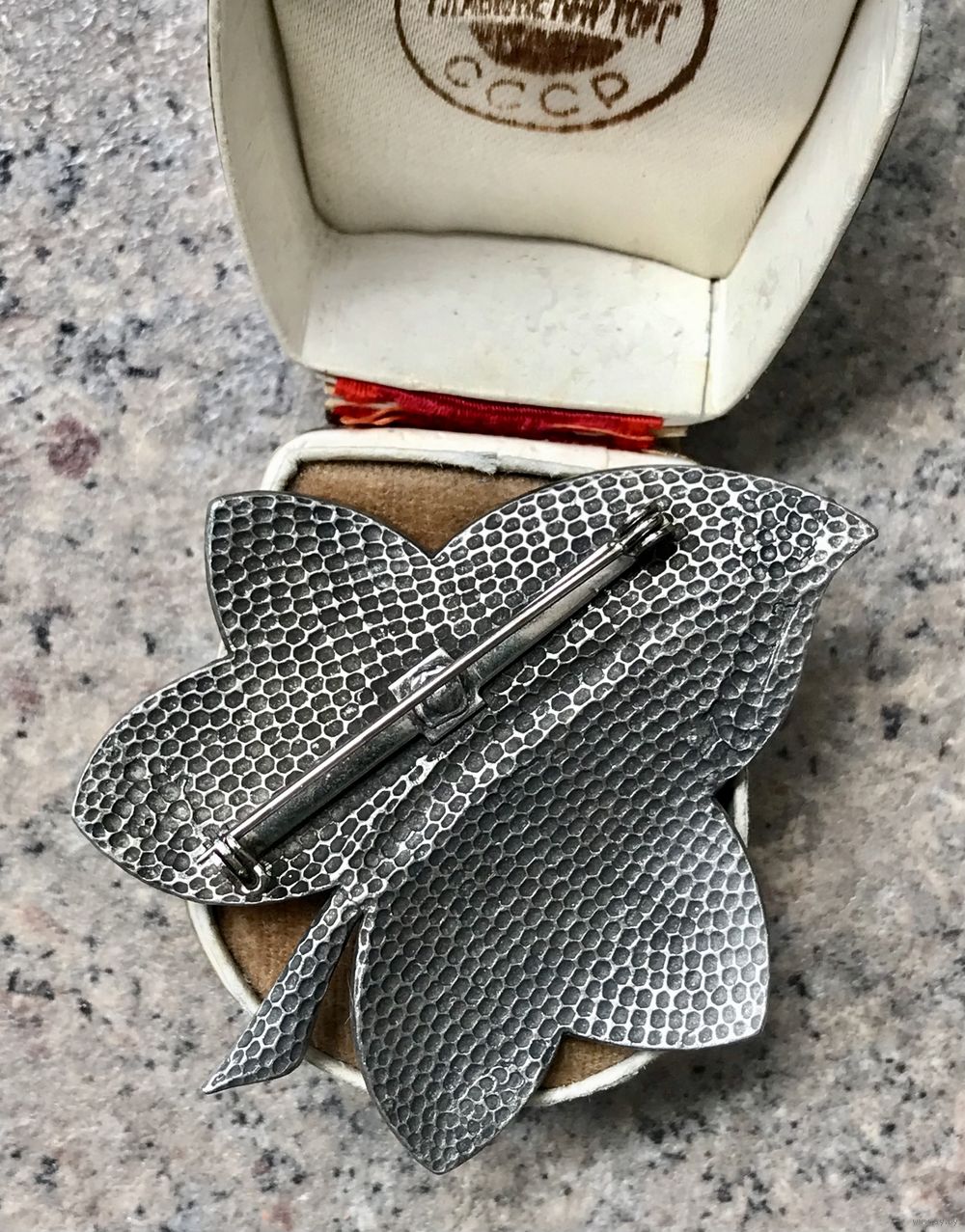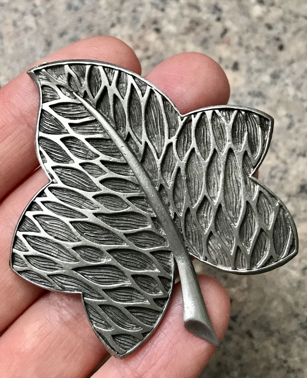 Крупная винтажная брошь из металла серебристого тона. Размер 6,2х5см. Немного подвижна застежка. Общее состояние хорошее.