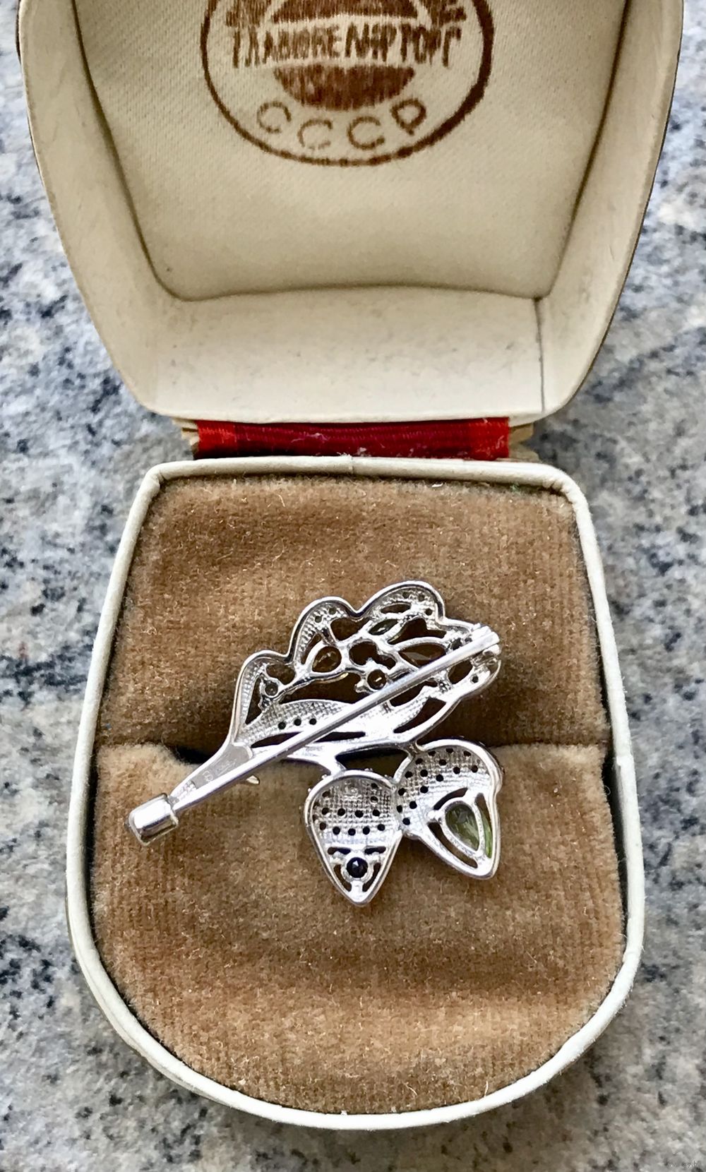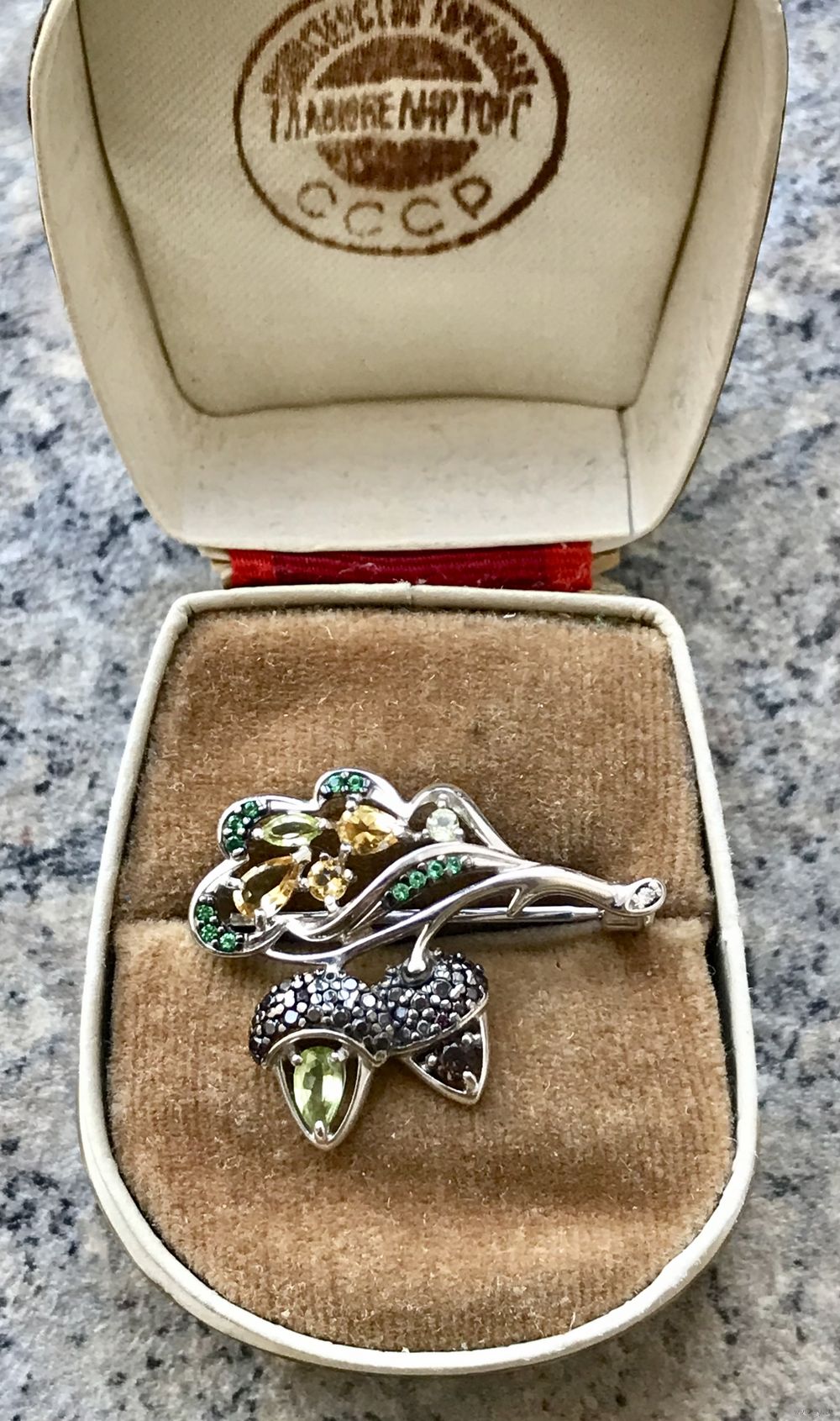 Небольшая брошь от ювелирного бренда Sokolov с основой из серебра 925пр. и вставками из дымчатого кварца, фианитов, хризолитов и цитринов. Размер броши 3х2,3см. Вес ~3,3гр. Состояние хорошее.