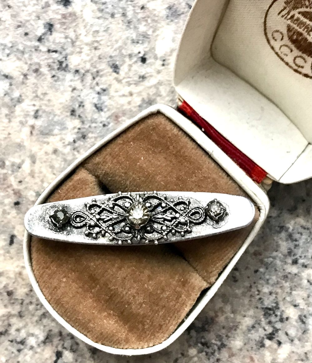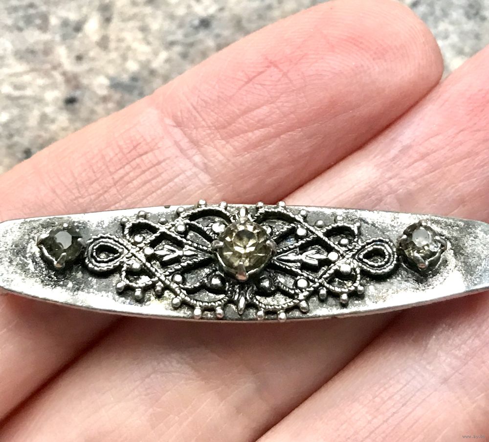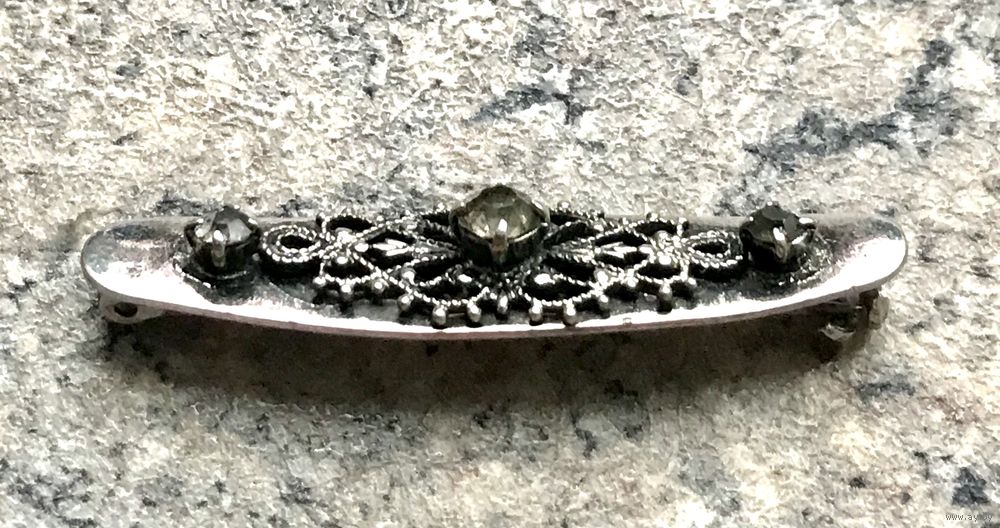 Небольшая винтажная брошь из металла с серебрением, лицевая сторона украшена вставками из кристаллов дымчатого цвета (имеются небольшие скольчики на боковых вставках), на замке отсутствует фиксатор, но брошь и без него держится на ткани. Размер 4,5х1см. Все нюансы учтены в цене.