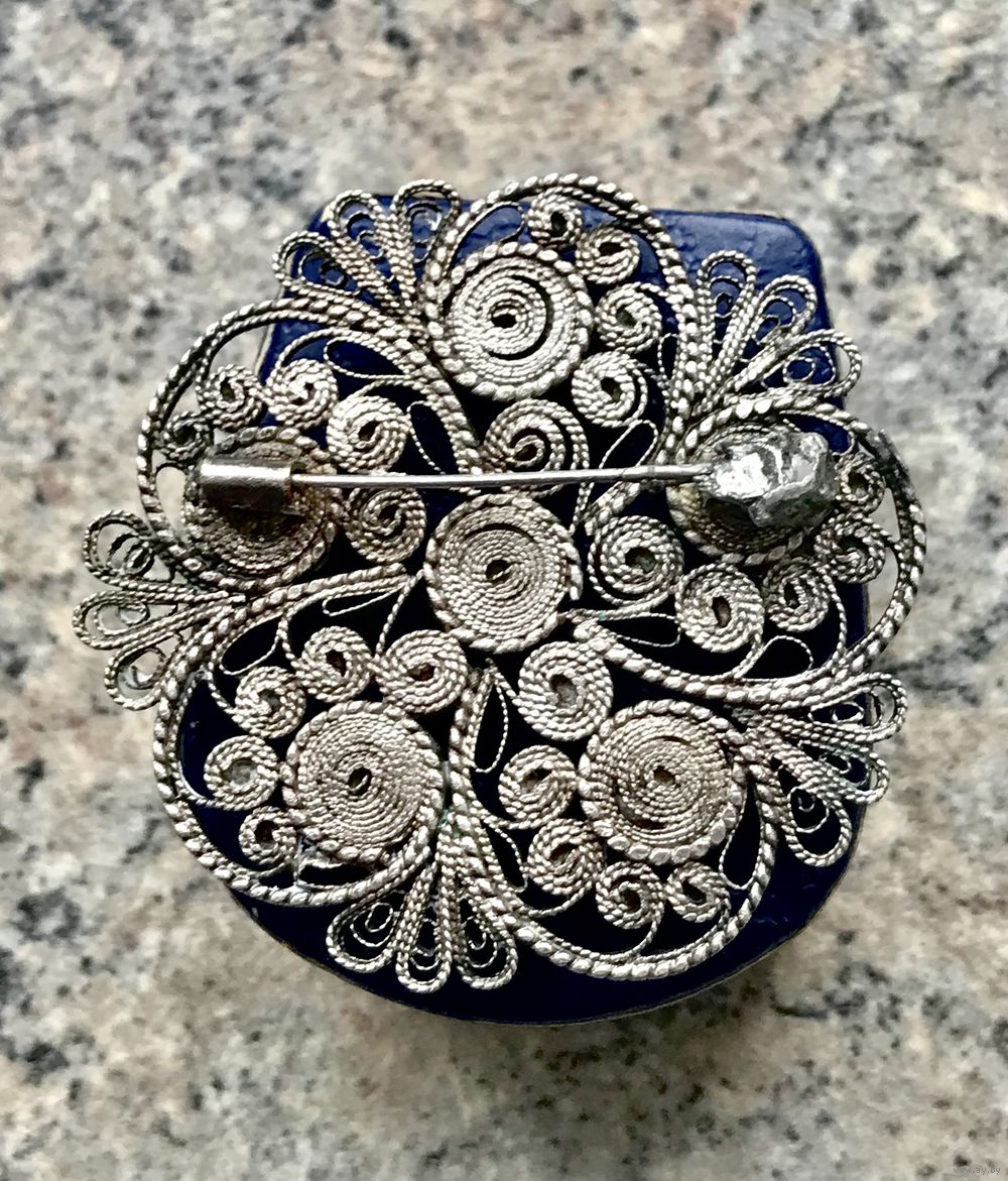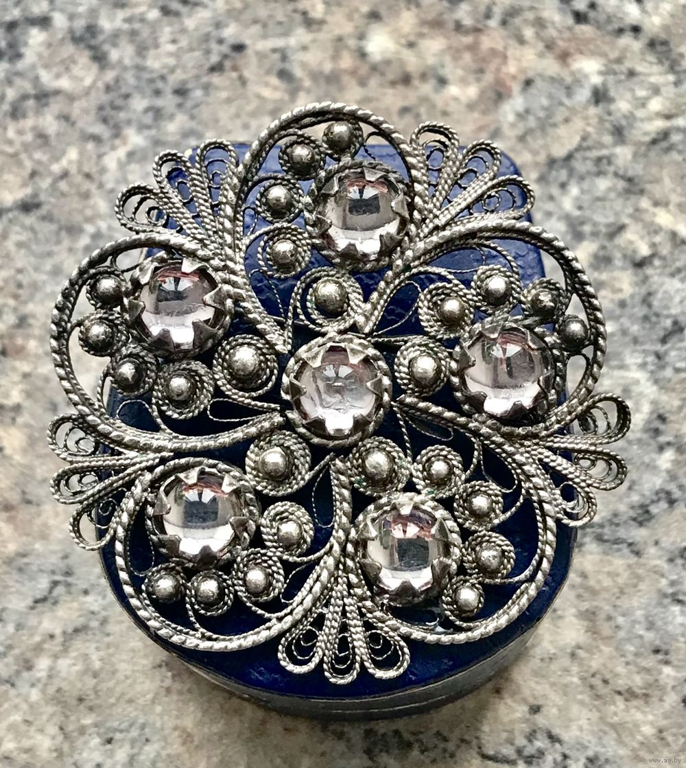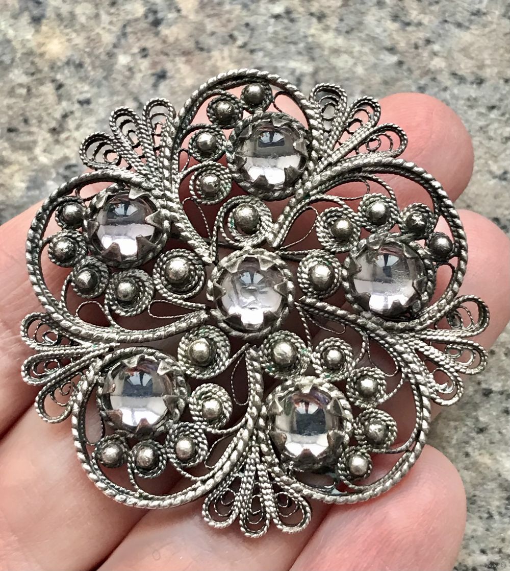 Крупная винтажная брошь из мельхиора с серебрением и вставок из стекла. Работа мастеров Казаковского ювелирного производственного объединения. Диаметр броши 5см. Был ремонт застёжки (учтено в цене).