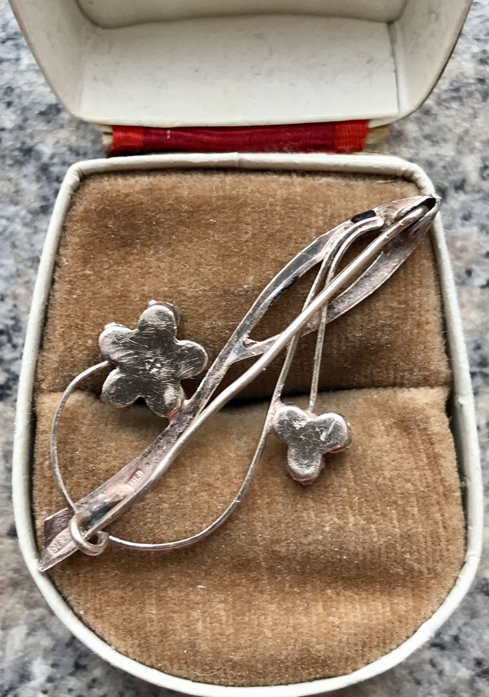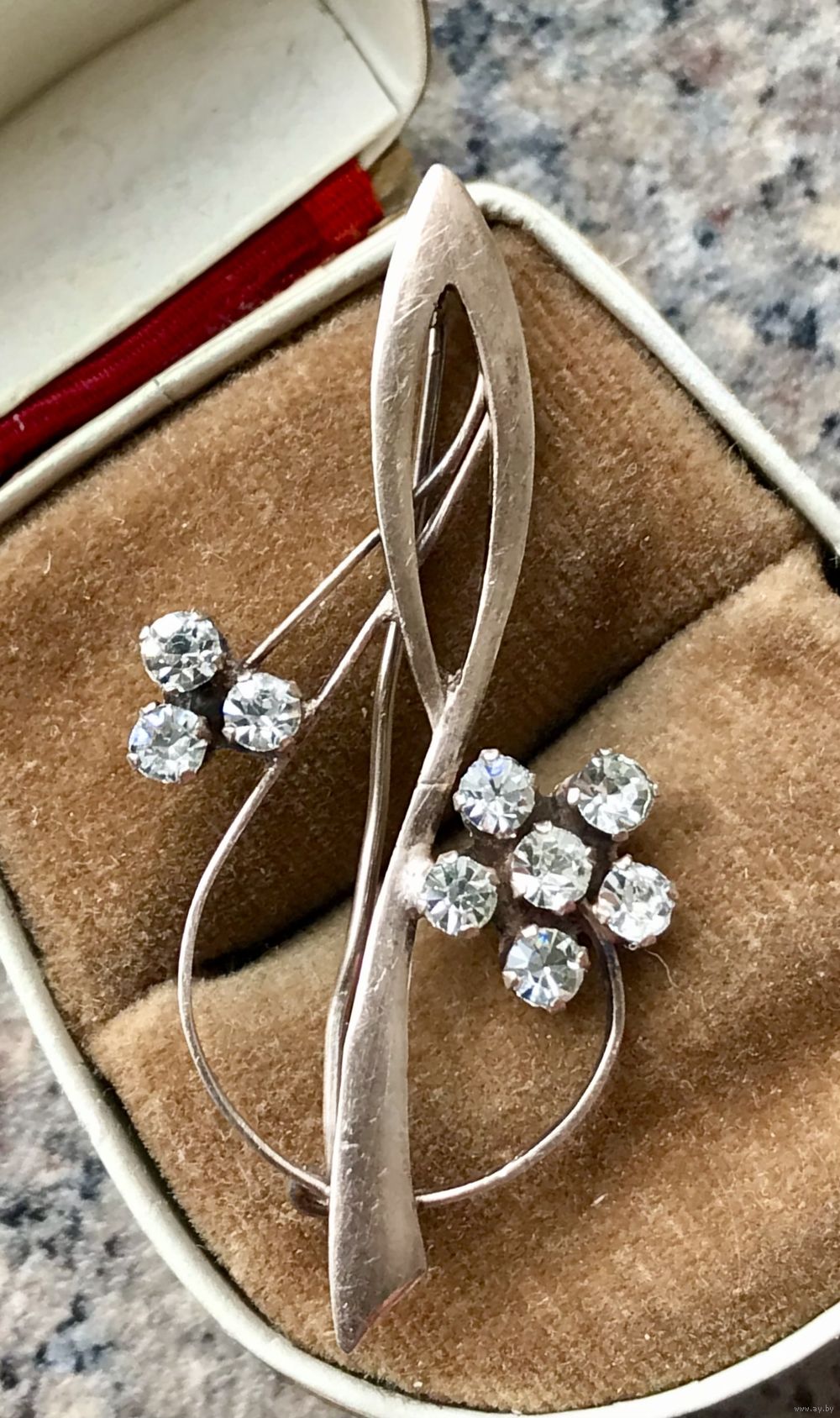 Брошь из серебра 875 пр.(звезда) с позолотой (позолота имеет розоватый оттенок) изготовлена в 1961г. на Подольской ювелирной фабрике (именник ФП1), вставки из стекла. Длина броши 4,6см., для своего возраста состояние хорошее.